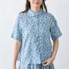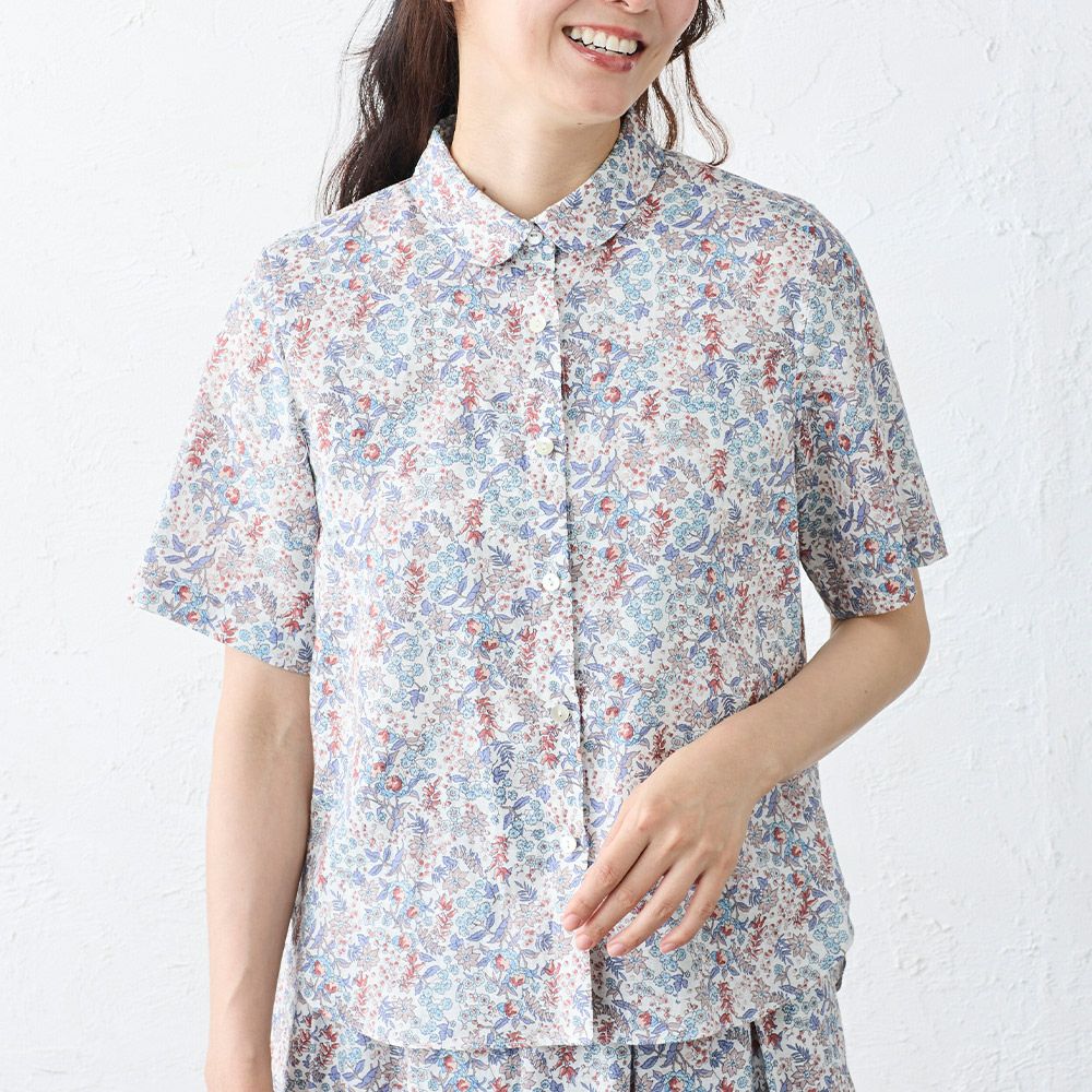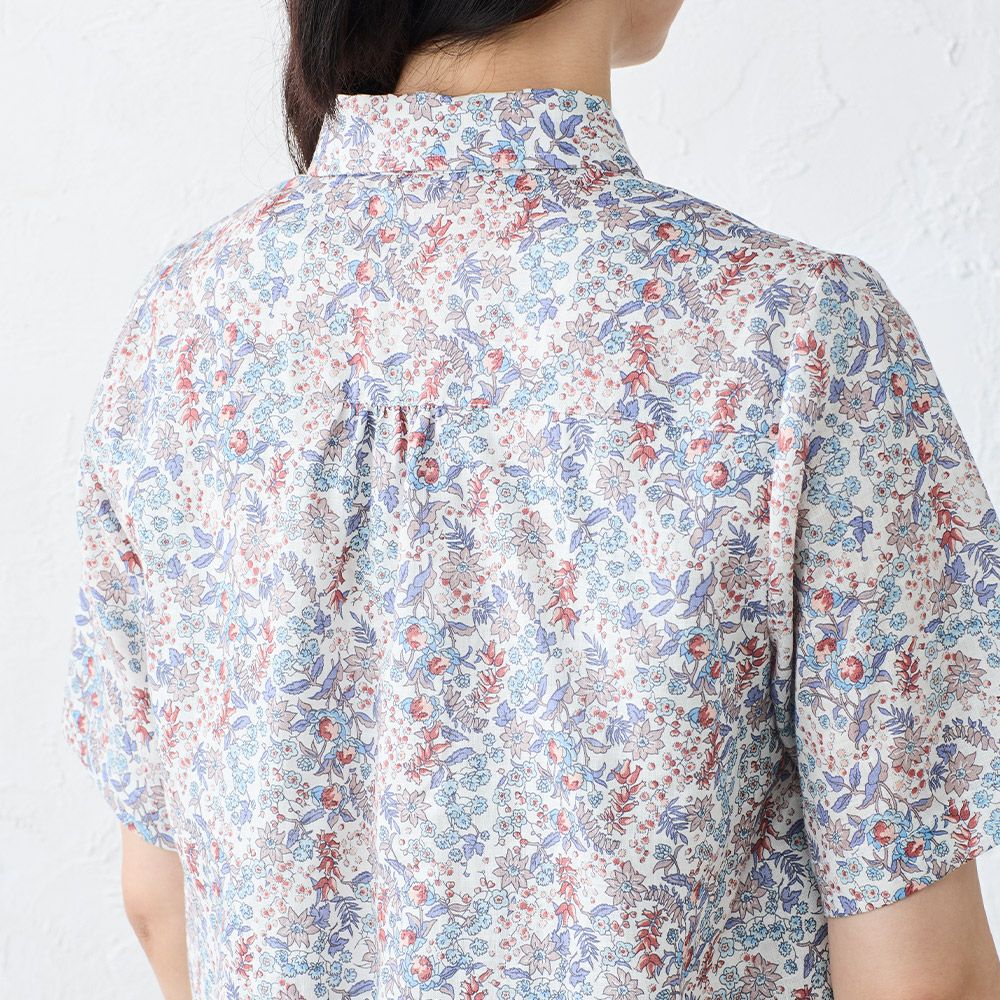 品よく華やぐ、リバティプリント生地を使用した半袖ブラウス。