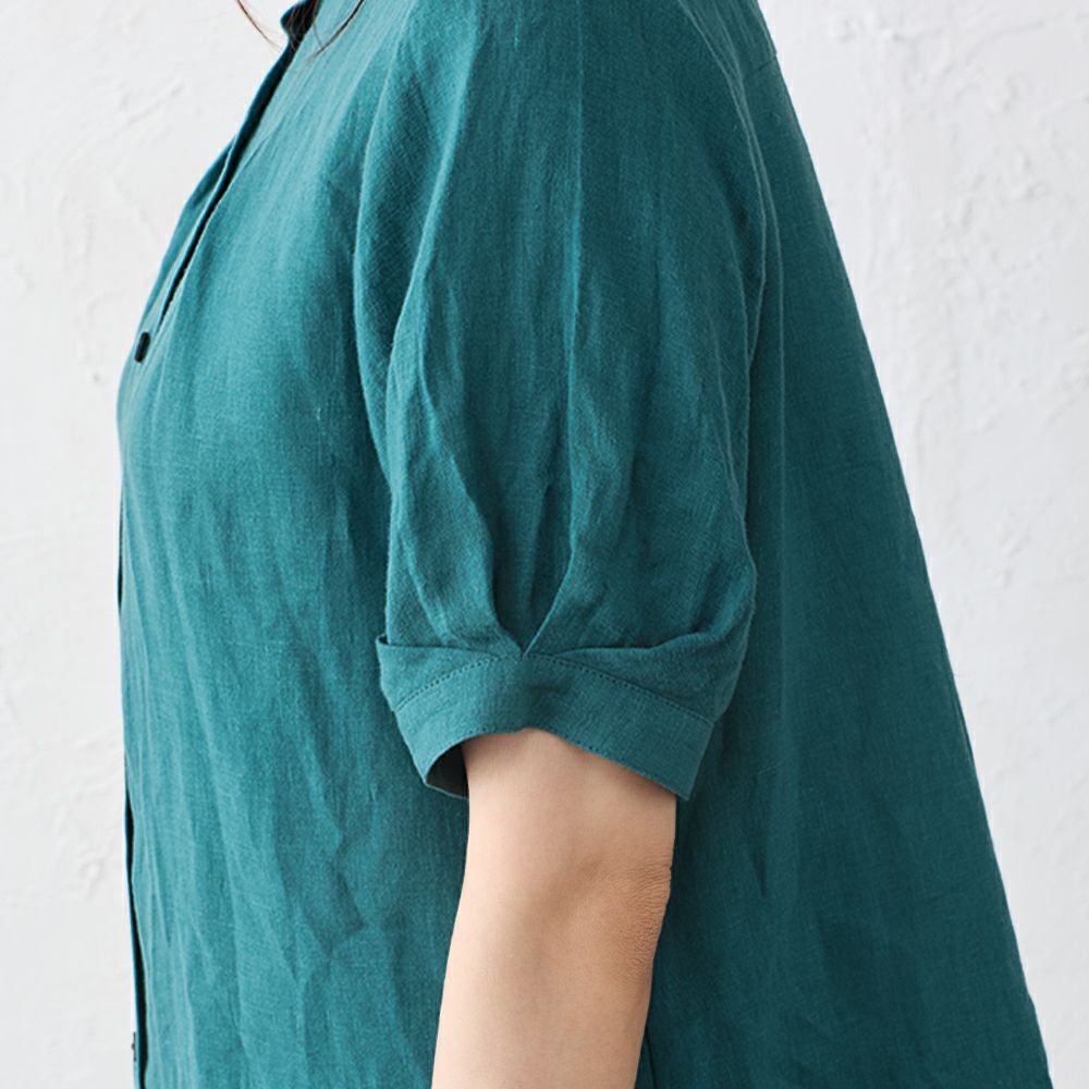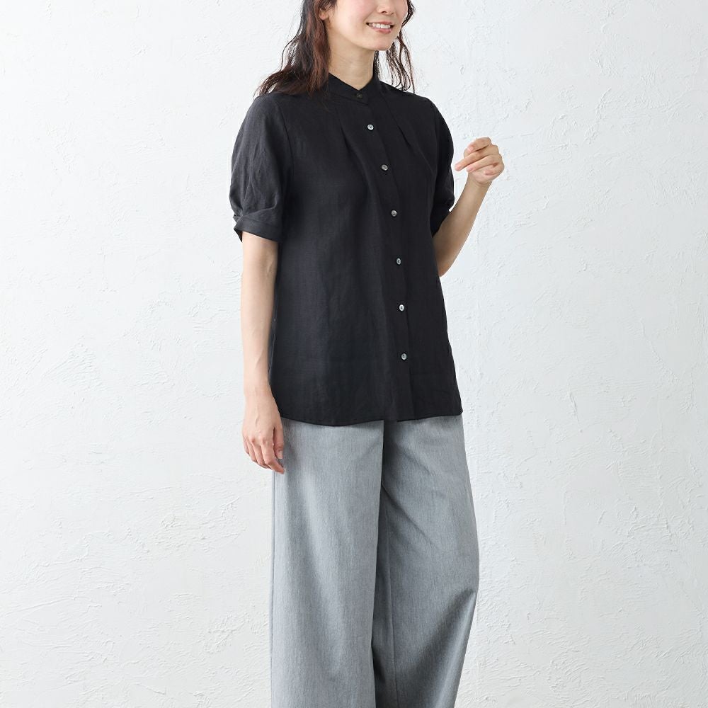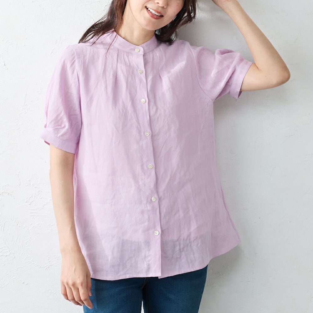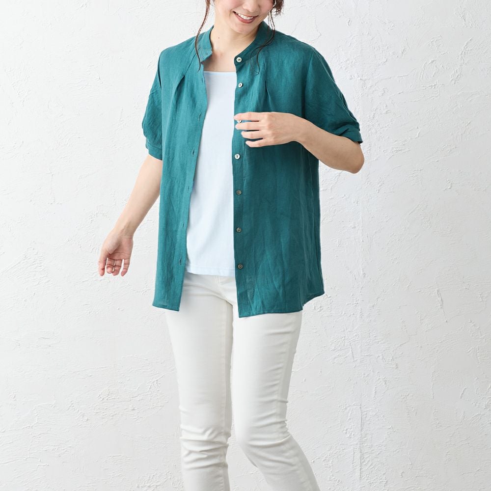 リネンならではの通気性と、着るほどに馴染むやさしい風合いが魅力の半袖ブラウス。 自然な光沢とシャリ感のあるリネンは、通気性・吸湿性に優れ、暑い季節もさらりと快適です。 ストンと落ちるラインで体型を問わず着こなしやすく、リラックス感のある着心地になっています。