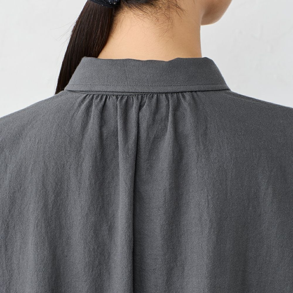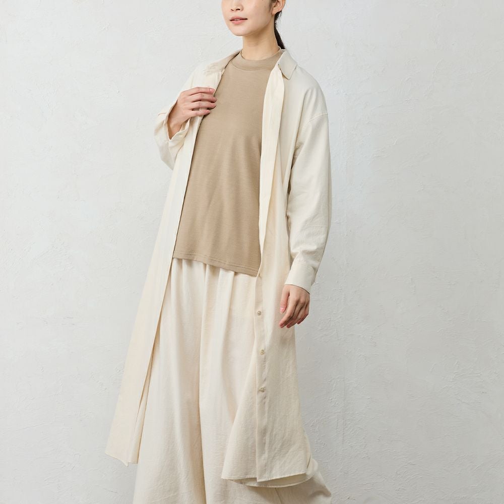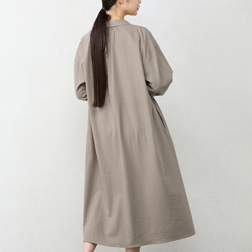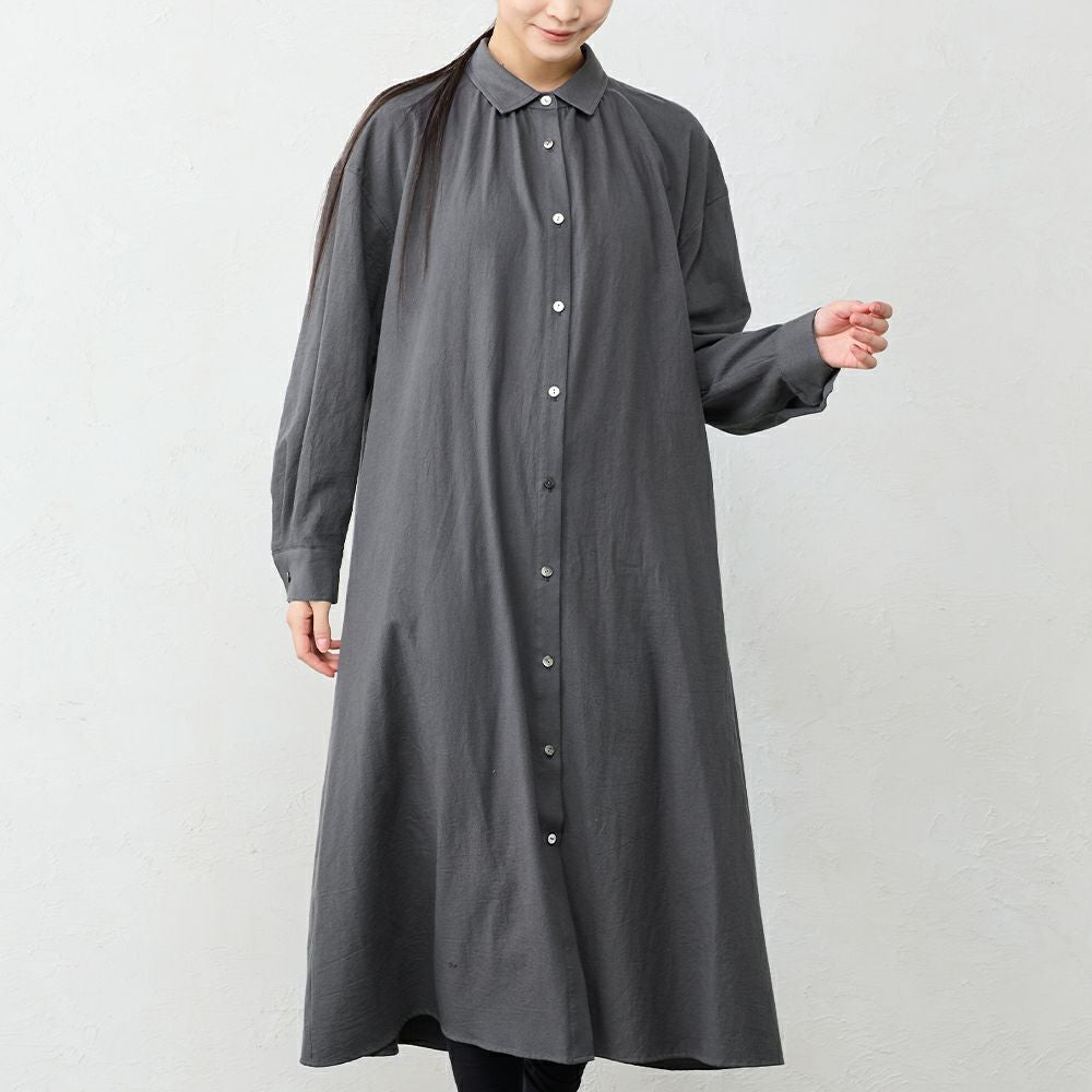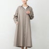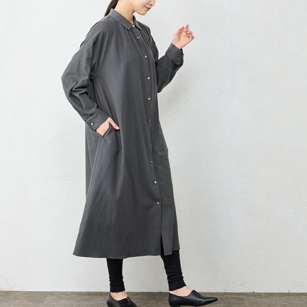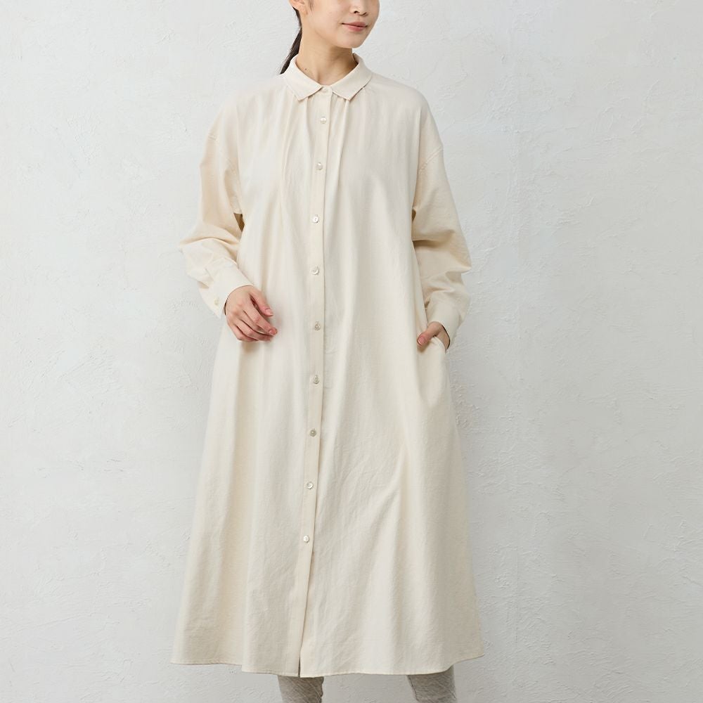 丁寧に炊き上げた東炊きコットンビエラを使用した、やわらかなシャツワンピース。 綿100%ならではの自然な通気性と、ほんのり起毛したやさしいタッチが心地よく、季節の変わり目にも快適に着られる素材感です。 ボタンを留めればワンピースとして、開けて羽織れば軽いコート感覚で。 一枚で重ねても様になる、汎用性の高いデザインです。