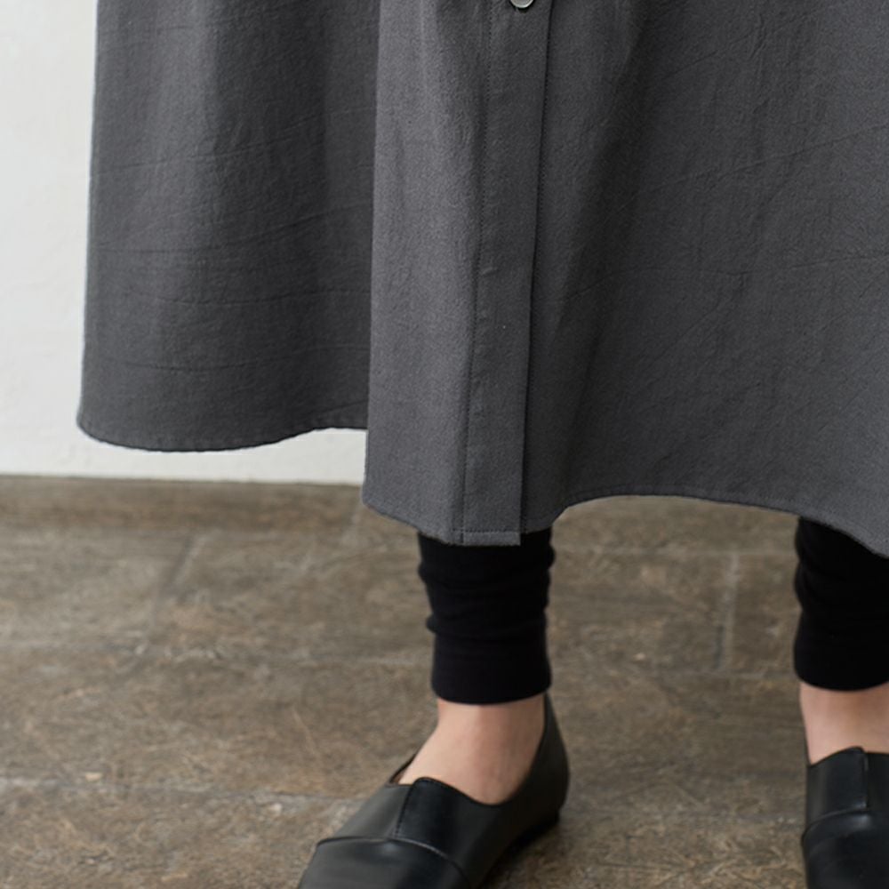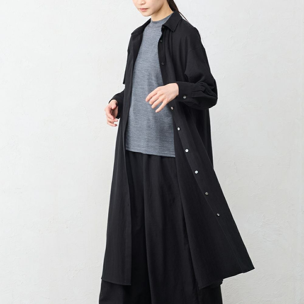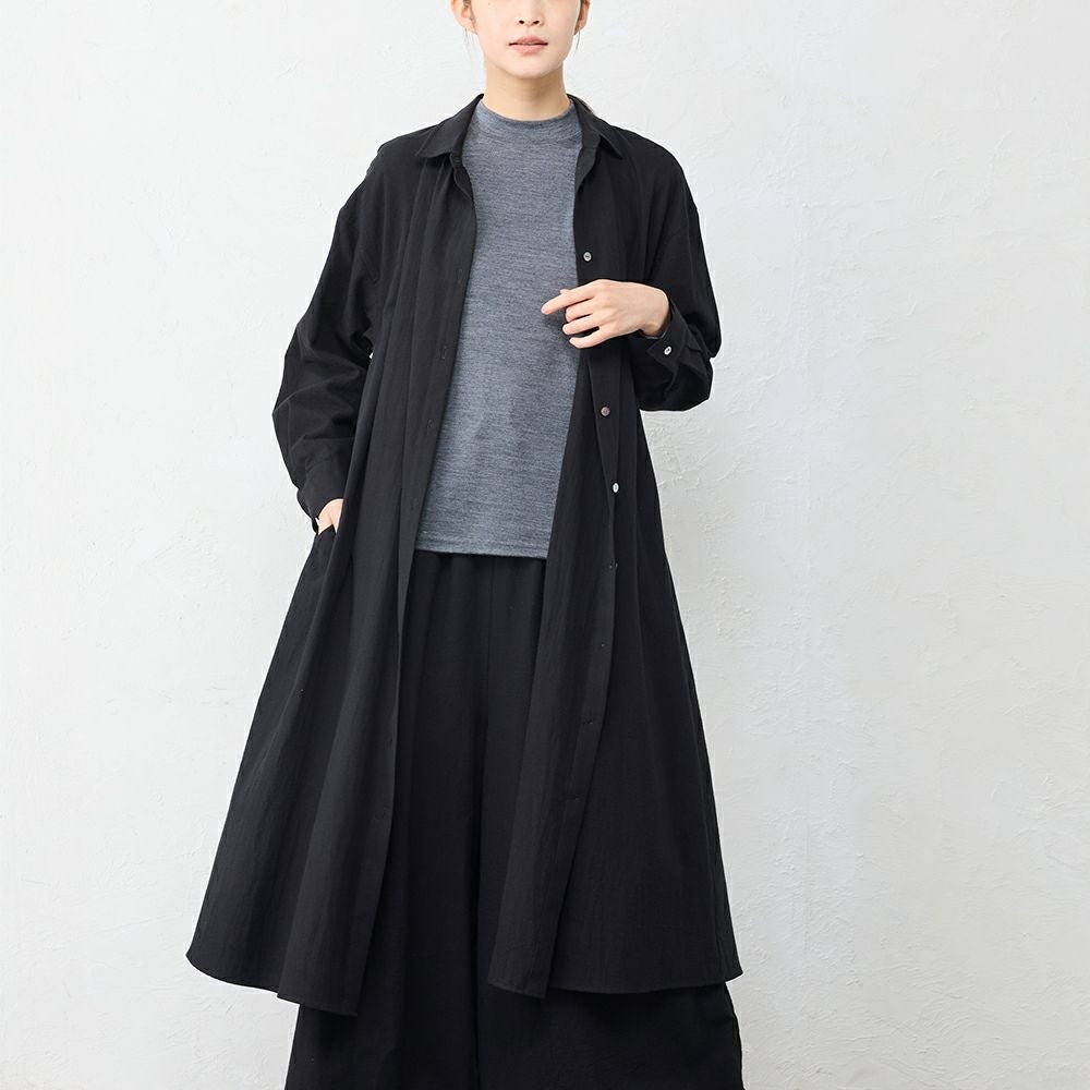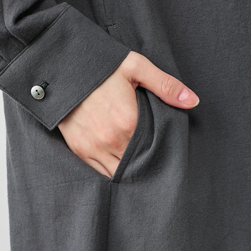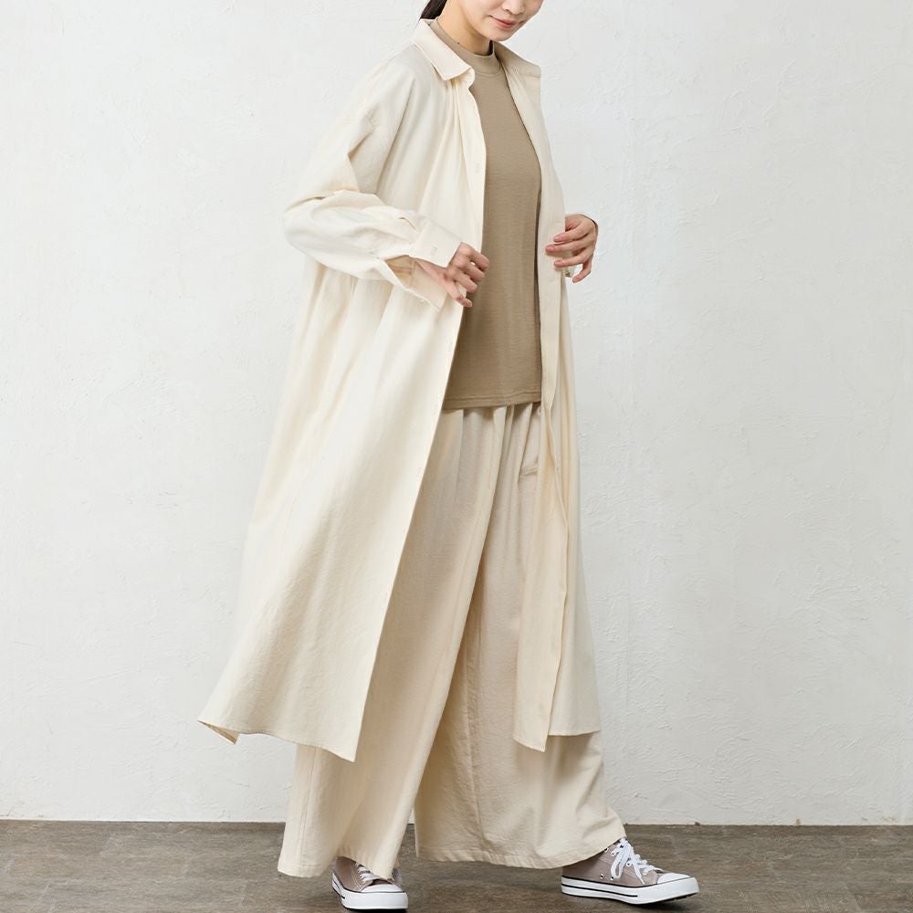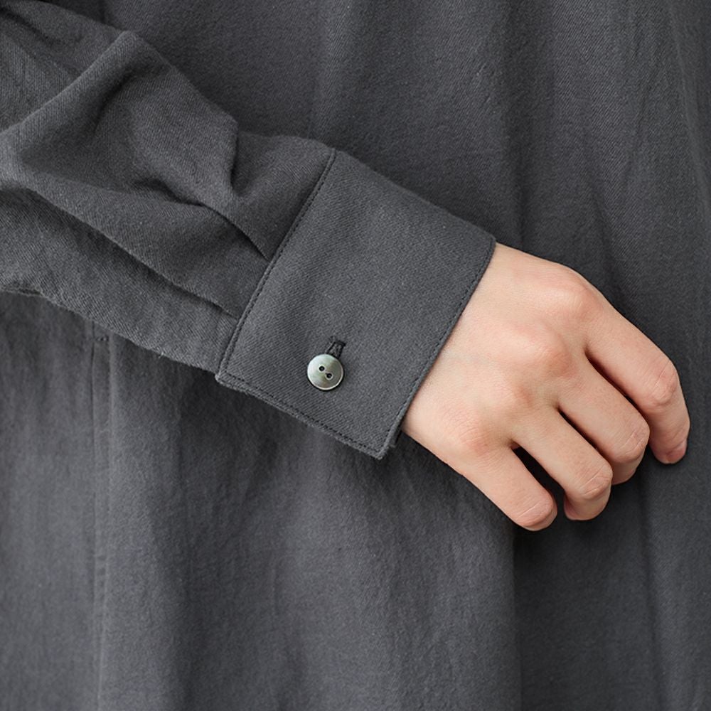 丁寧に炊き上げた東炊きコットンビエラを使用した、やわらかなシャツワンピース。 綿100%ならではの自然な通気性と、ほんのり起毛したやさしいタッチが心地よく、季節の変わり目にも快適に着られる素材感です。 ボタンを留めればワンピースとして、開けて羽織れば軽いコート感覚で。 一枚で重ねても様になる、汎用性の高いデザインです。
