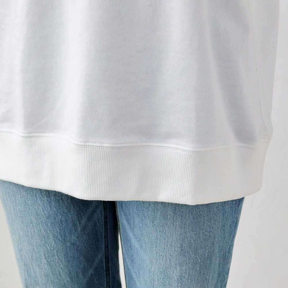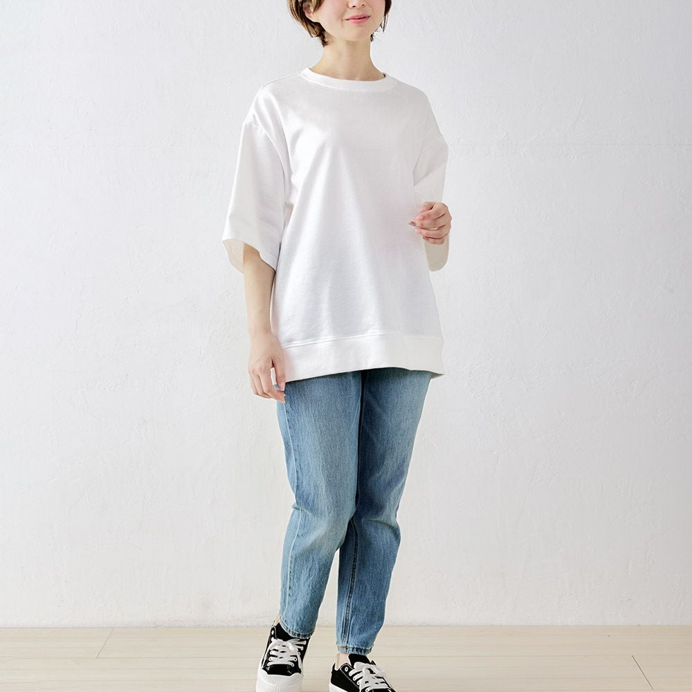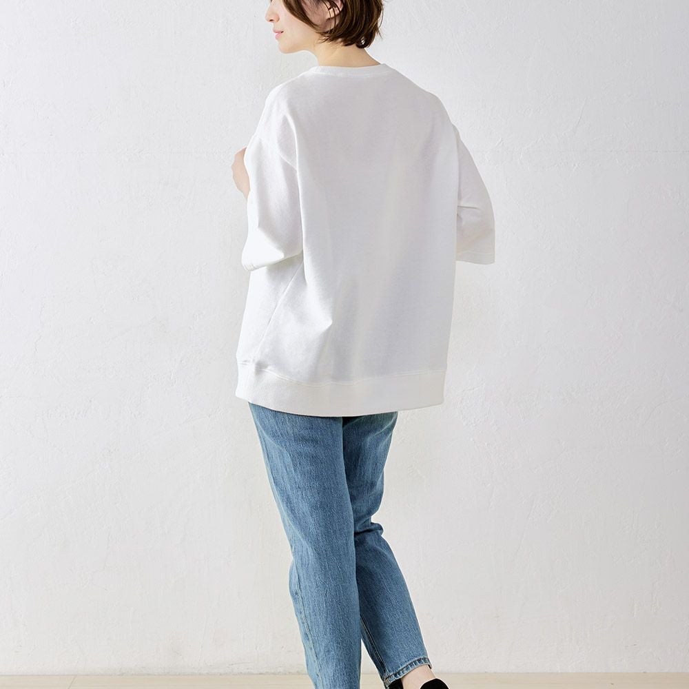 オーガニックコットンを使用した、素肌にやさしい五分袖トレーナー。 吸水性に優れサラッとした着心地。1枚でもレイヤードでも、ゆったりラフに着こなせる便利な1着