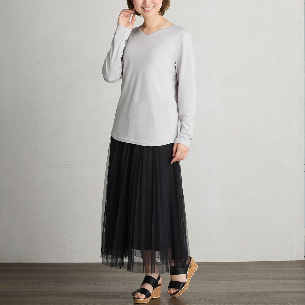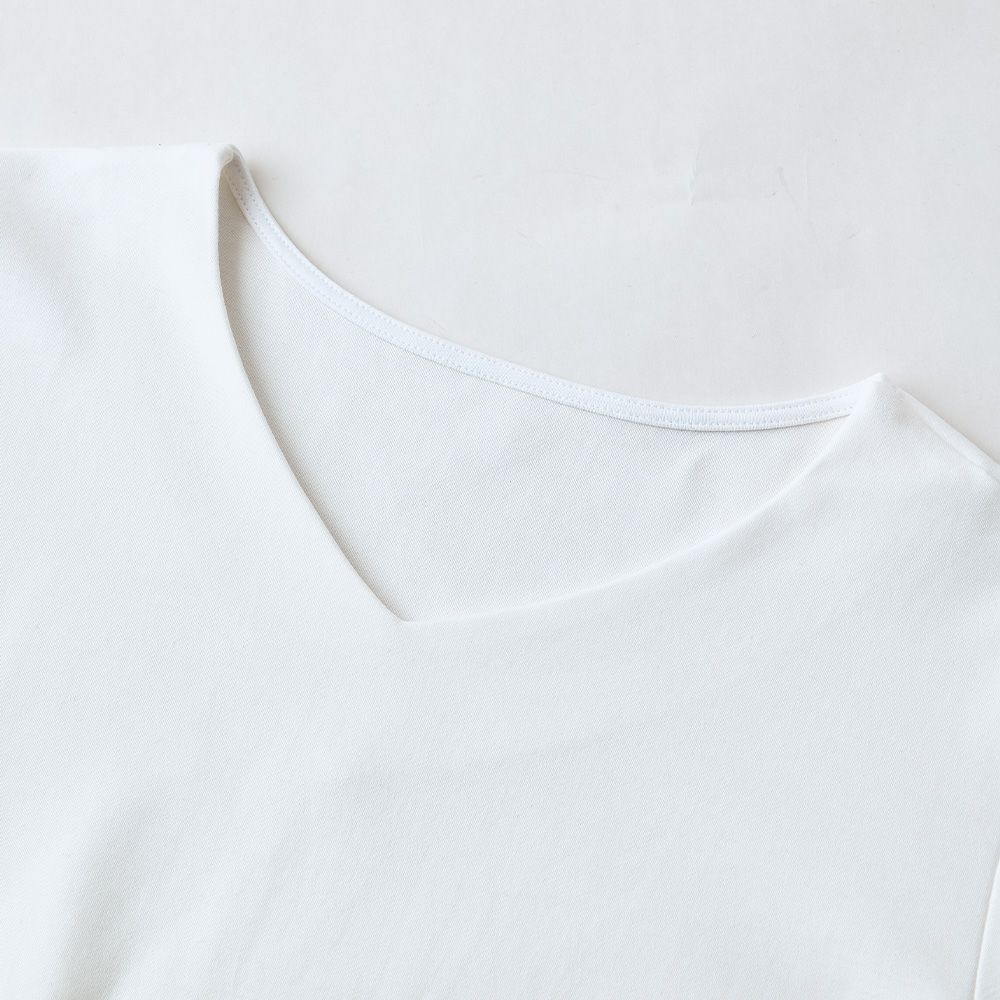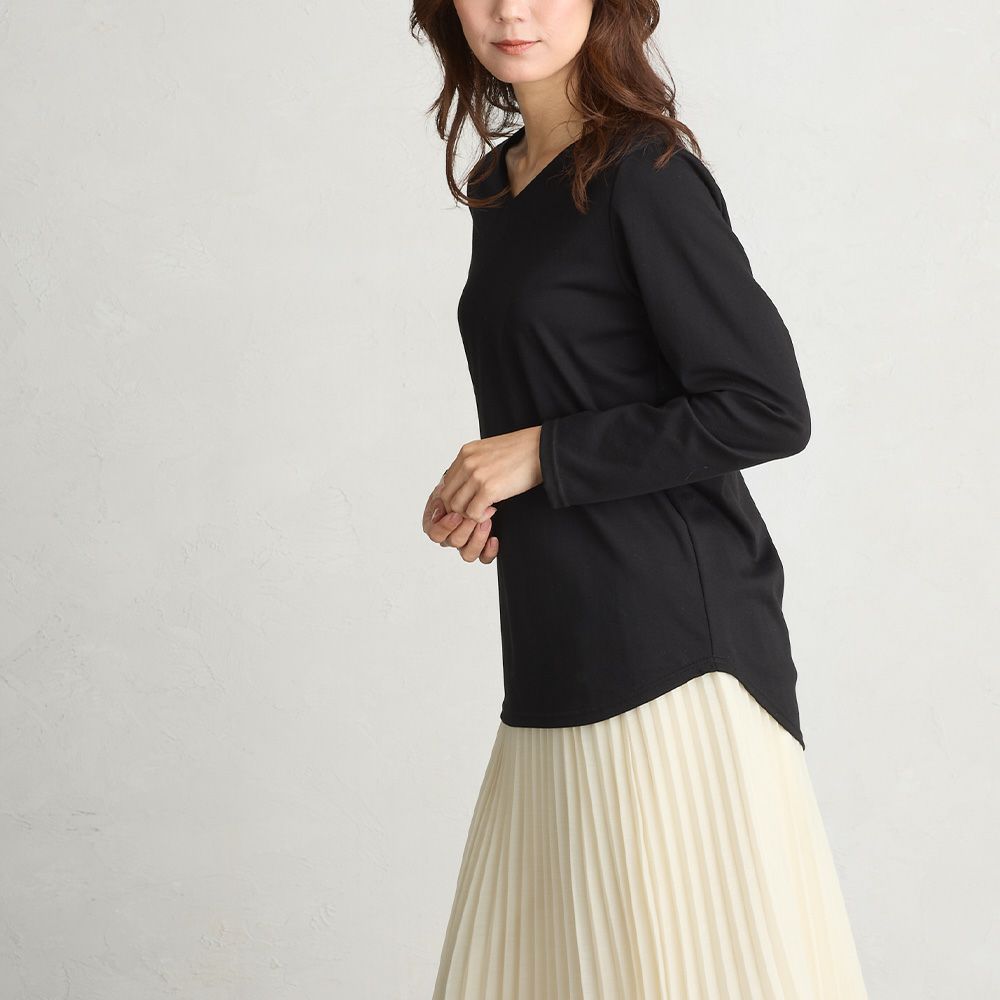 シンプルなVネックデザインで大人カジュルスタイルにもキレイめスタイルにも使用しやすく。 前後で 長さの違う丈感でこなれ感があり、ラウンドデザインでトレンド感も取り入れ、シンプルながら上品なスタイルに仕上がる一枚です。