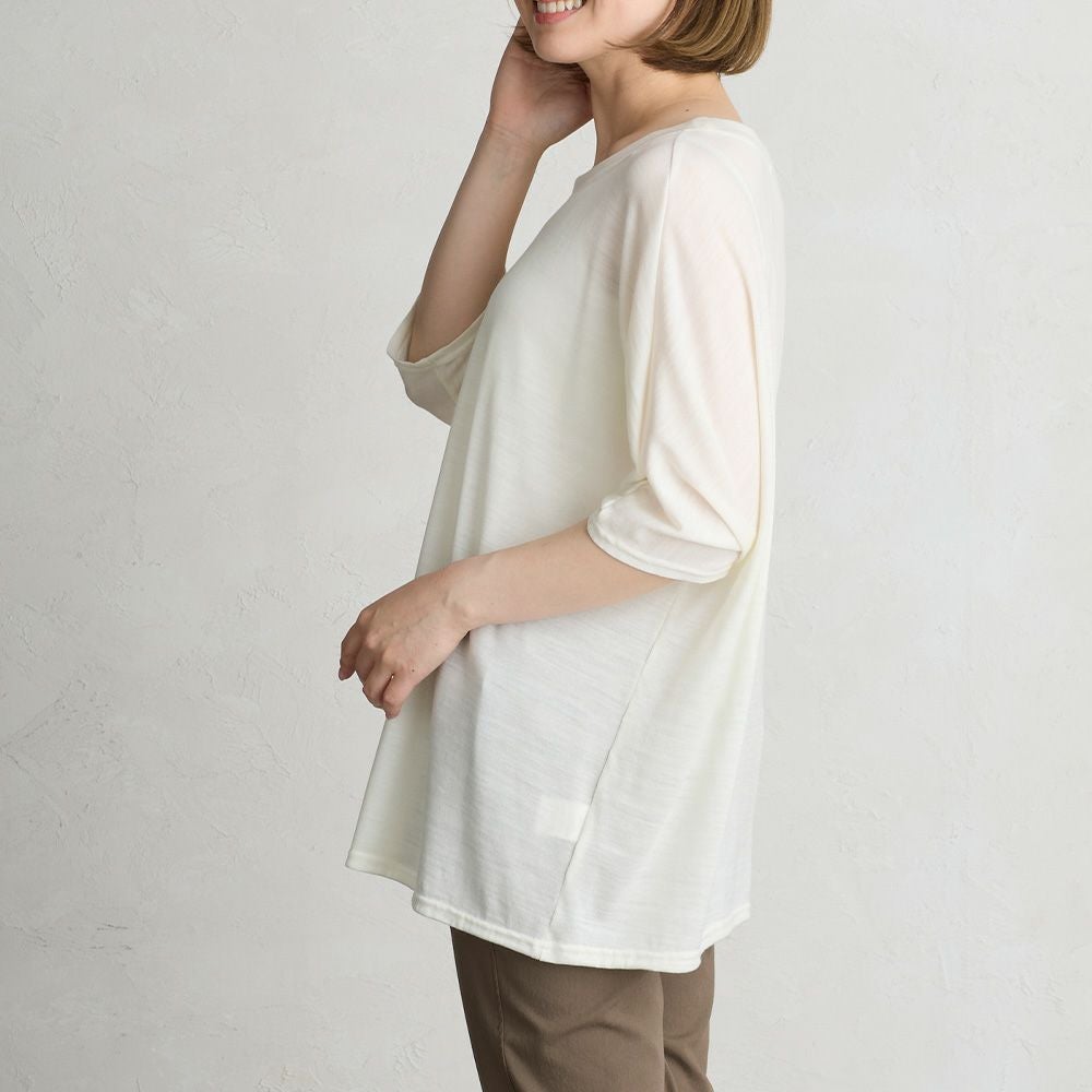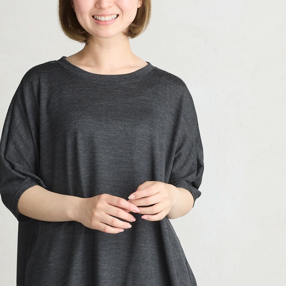 繊細なメリノウール素材を使用したドルマンスリーブカットソー。ベーシックな形の洋服が多いメリノウールカットソーに、少しこなれ感をプラスしたアイテム。決まりすぎない程よい抜け感で大人カジュアルスタイルに。見た目も快適さも兼ね備えたアイテムです。