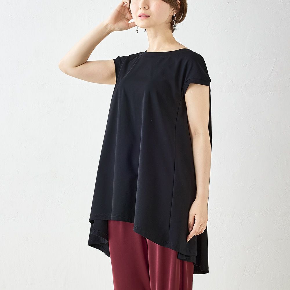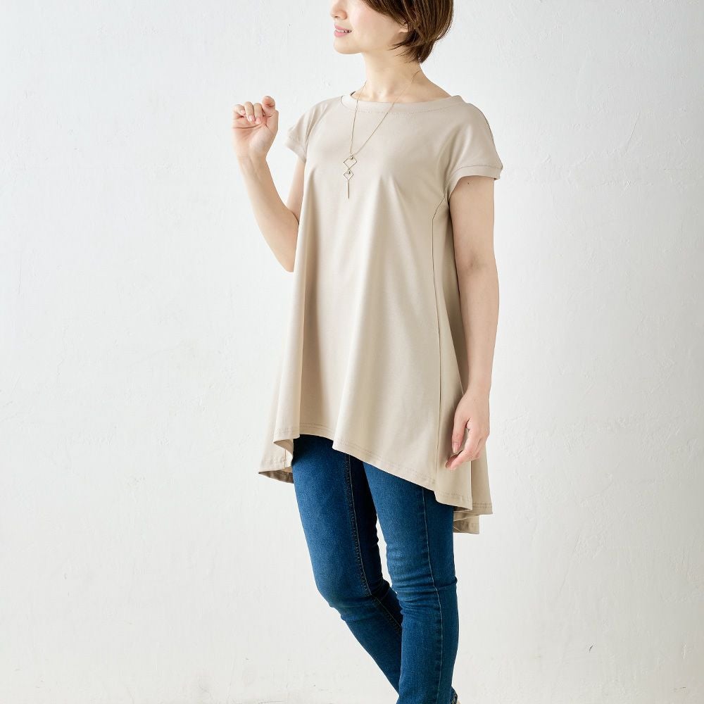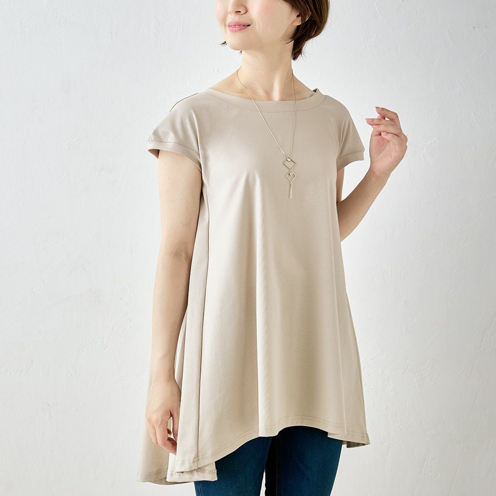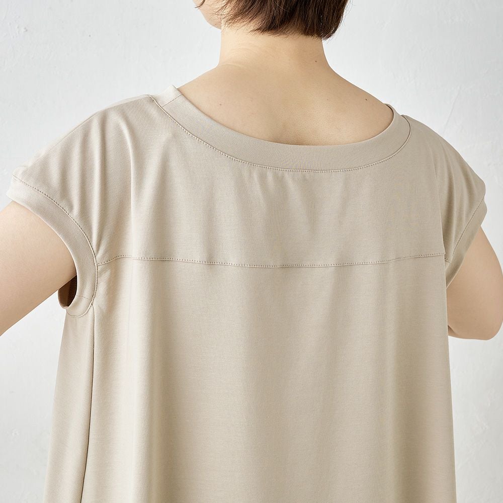 サラッとした感触と豊かなドレープ感・上品な光沢で綿100%とは思えない上質感を生み出す着心地の良い強撚コットンを使用したカットソー。キレイなドレープ感が楽しめる、ふんわり広がるデザインで体型カバーも◎ 同素材のワイドパンツやスカートと合わせてセットアップの着用も◎