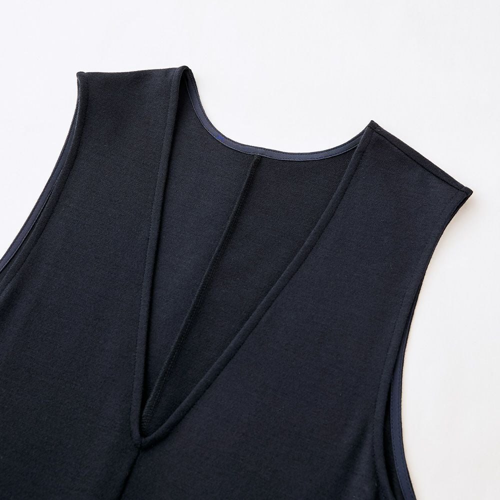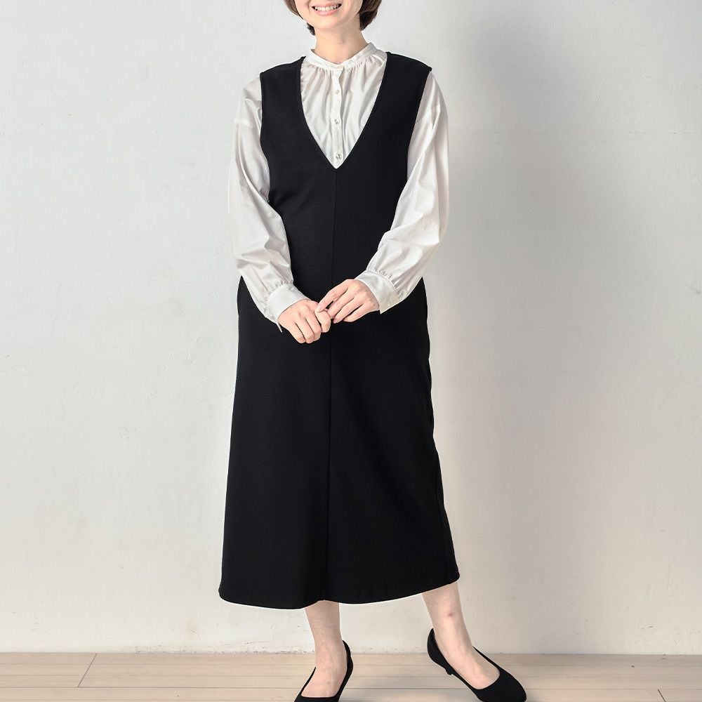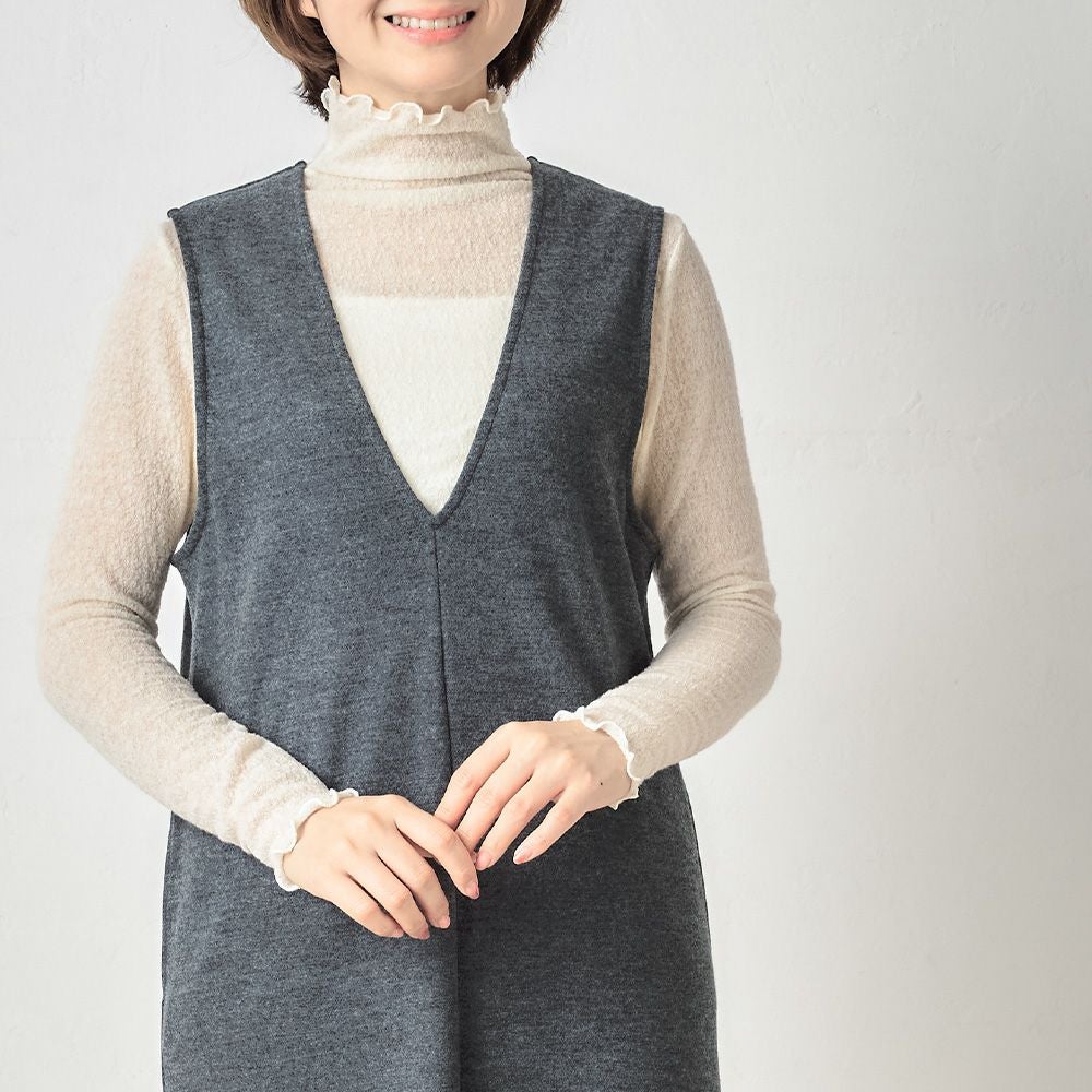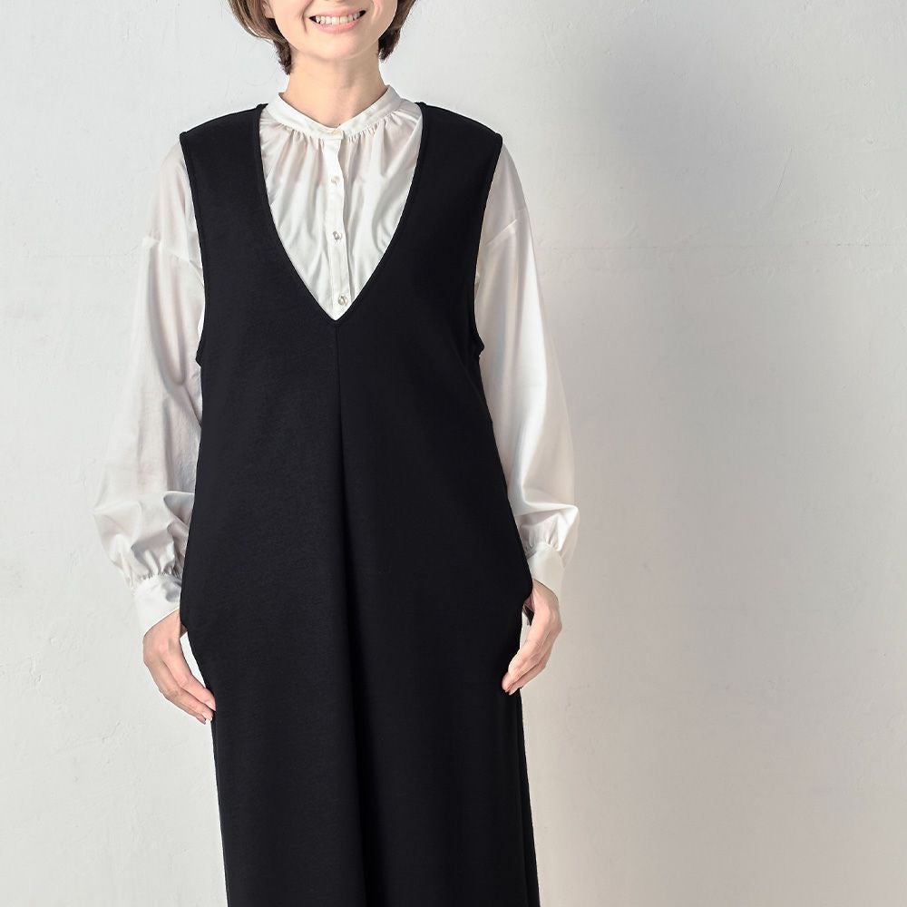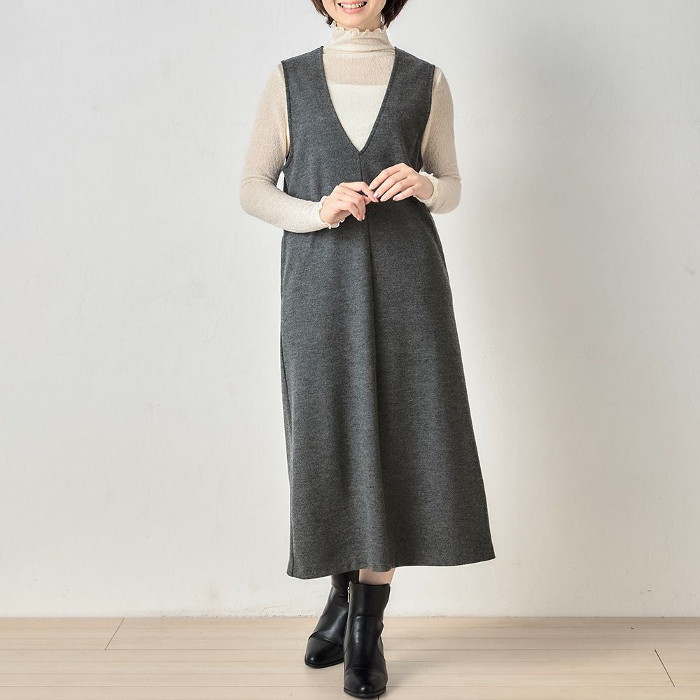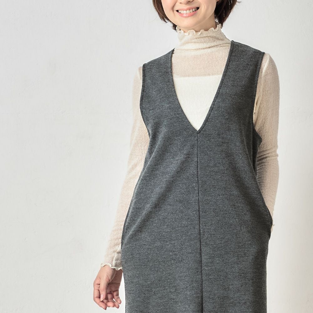 尾州産の最高品質の圧縮ウールを使用したジャンパースカート。フレア感の少ないシルエットで可愛くなりすぎない大人のジャンパースカート。深めのVネックで程よい抜け感がありながらキチンと見え。ちょっとしたお呼ばれのシーンにもご利用頂けるアイテムです。