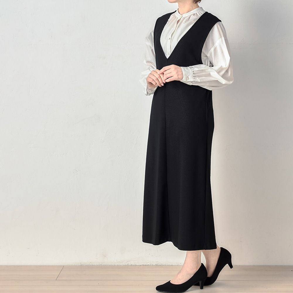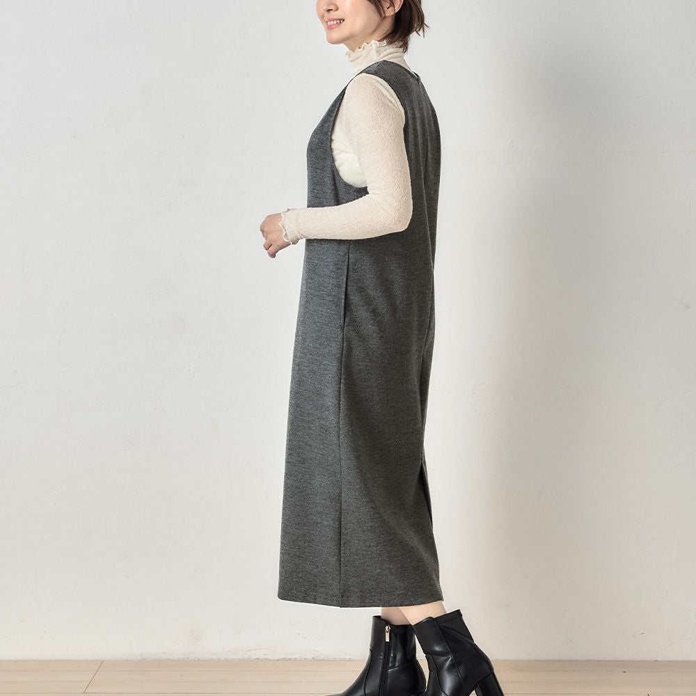 合わせるインナーによって様々な着こなしが楽しめるジャンパースカート。シンプルなブラウスやハイネックなどと合わせると落ち着いた印象のキレイめスタイルに。同色系のインナーと合わせ柔らかな印象に。1つでたくさんのコーディネートが楽しめるアイテムです。