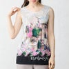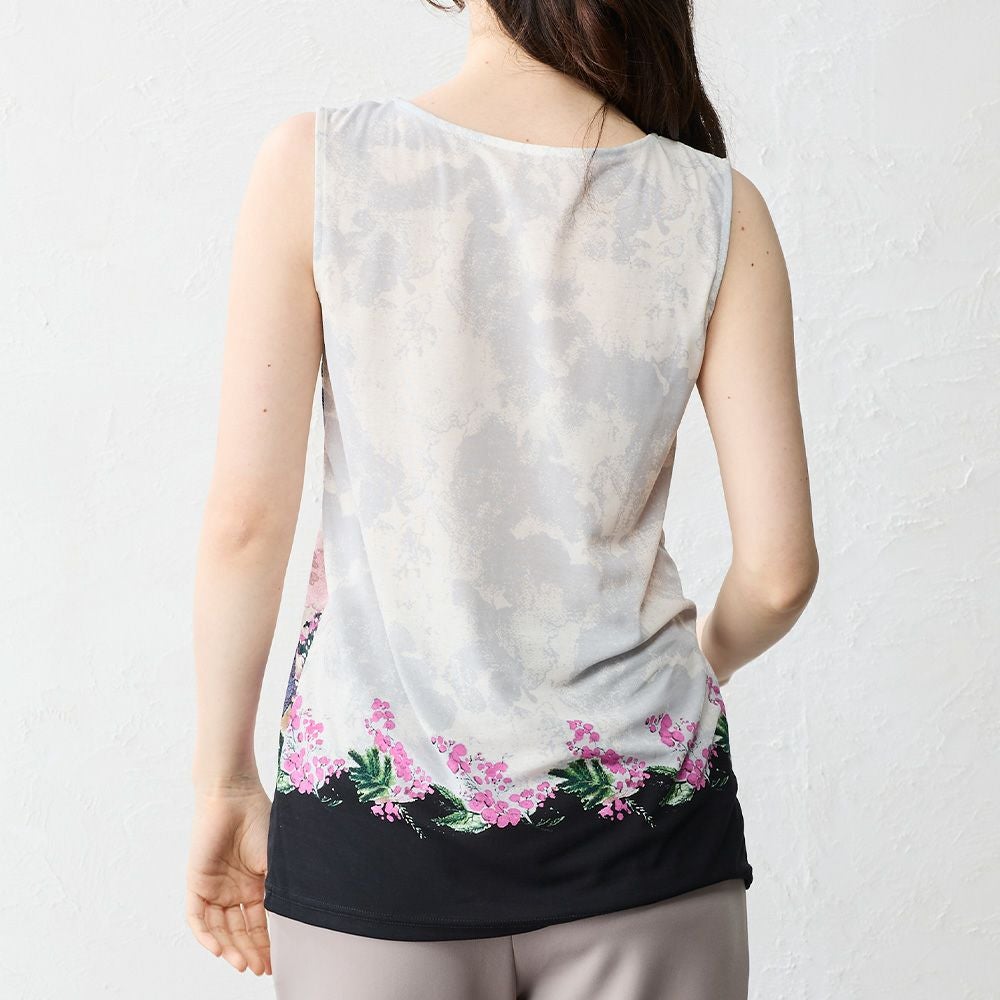 強撚コットンに手捺染によるパネルプリントを施した艶やかなタンクトップ 無地のブラウスの下等に着用すれば、映える事間違いなし 大人の女性に似合う柄をご用意しました。