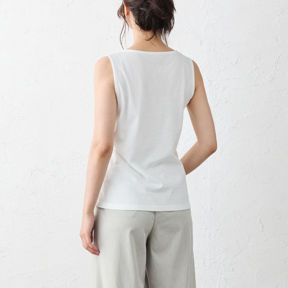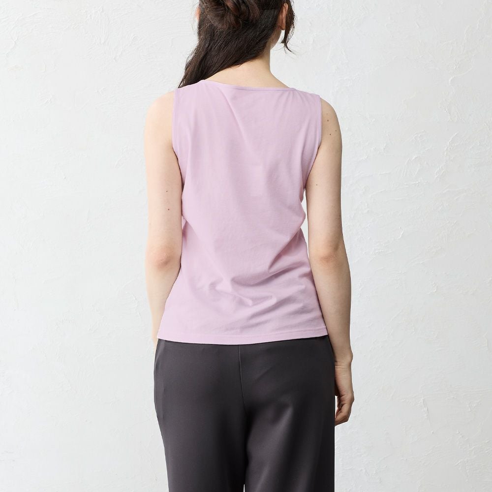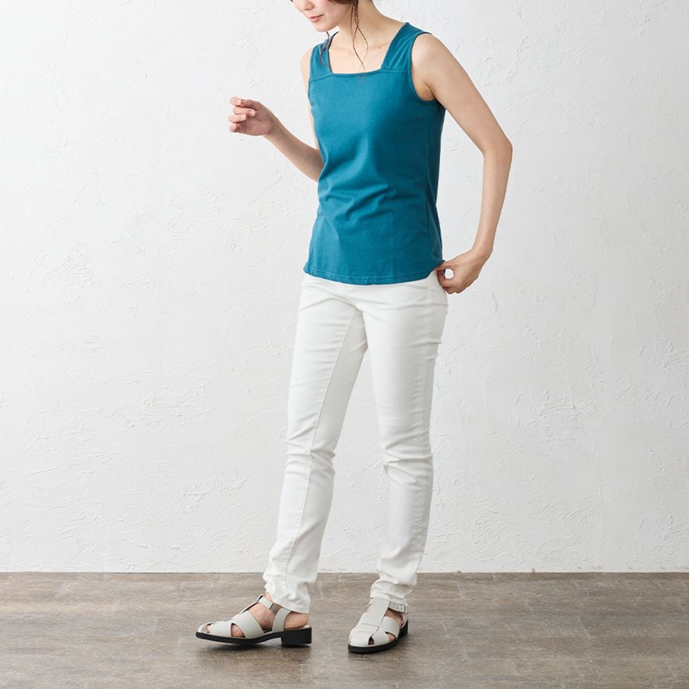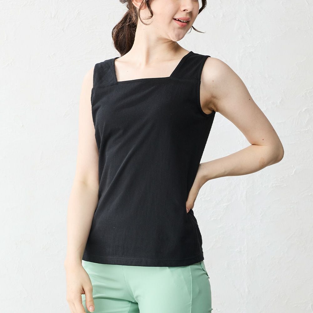 通常のブラ紐隠しインナーより露出を抑えることで、よりヘルシーに着やすくなりました。アウターの邪魔をしないスクエア型の胸元は、デコルテを綺麗に見せてくれます。羽織やアウターから見えても上品にまとまり合わせやすさも◎