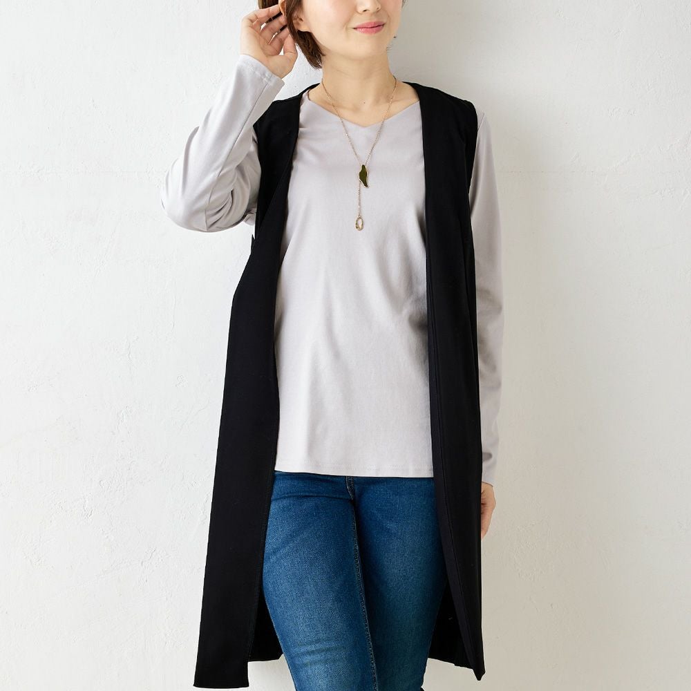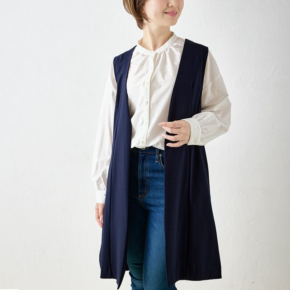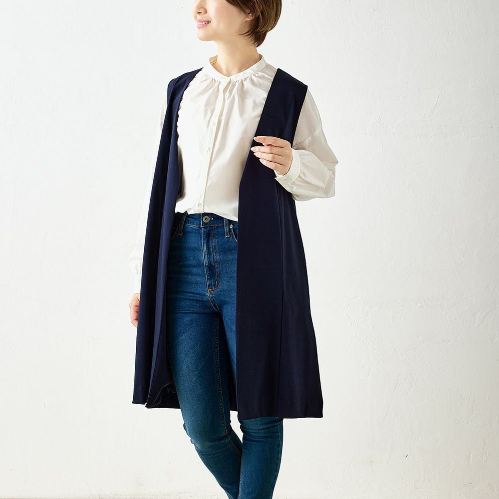 他の画像を見る Aベージュ Bネイビー Cブラック 尾州産素材 メール便 送料無料 キレイめにもカジュアルにも着まわせる優秀プラスワンアイテム マジカル強撚コットン ノーカラーロングジレ カートに入れる お気に入りに登録する 当店特別価格 ¥ 7,800 税込