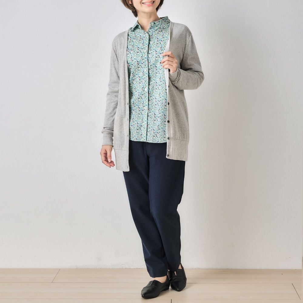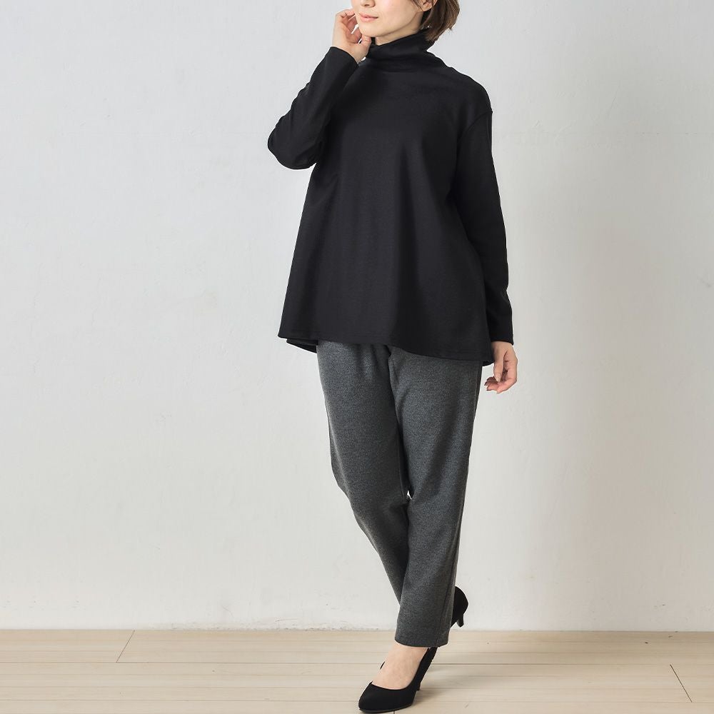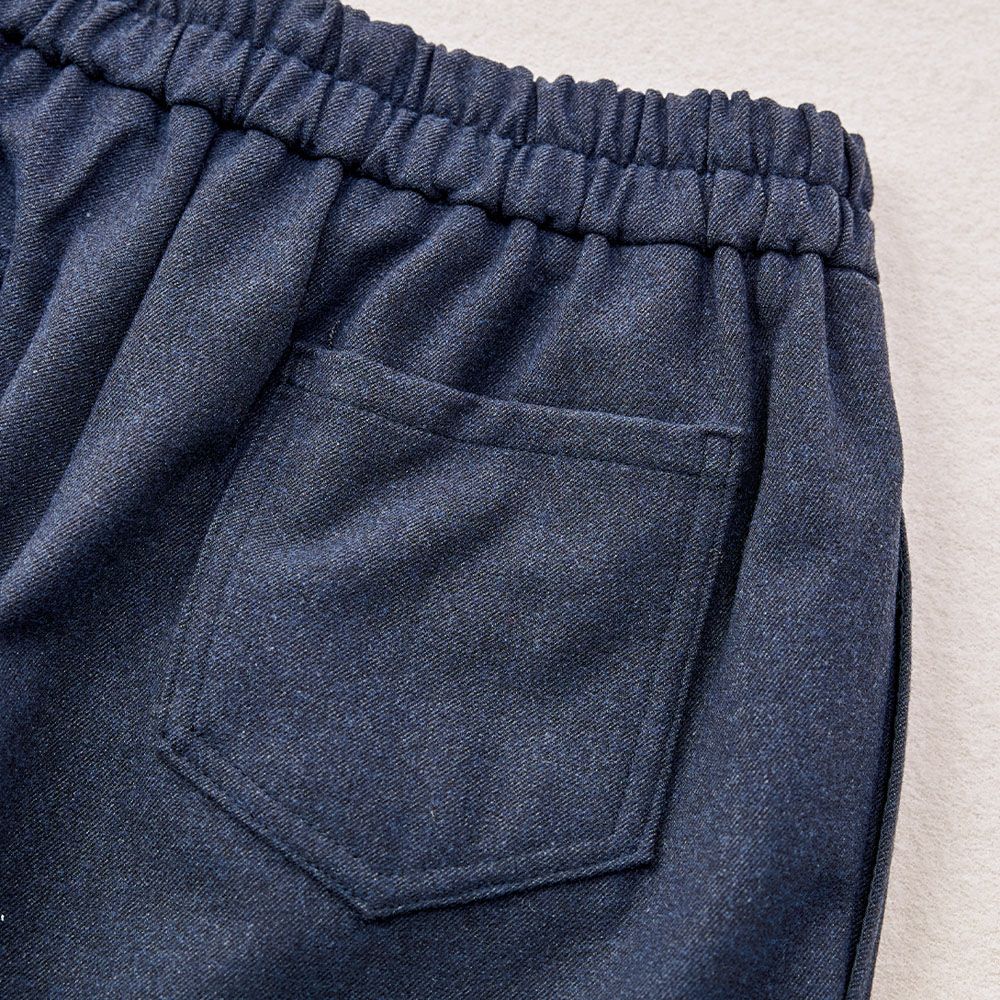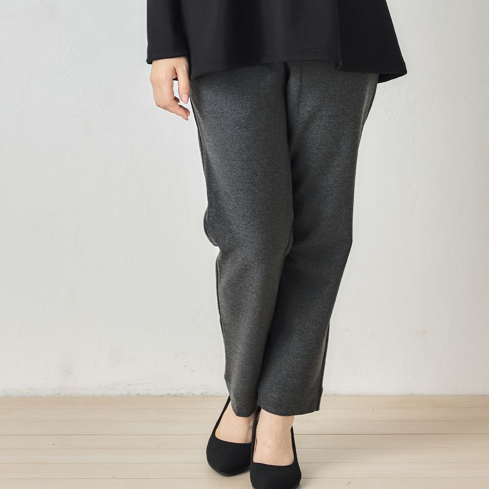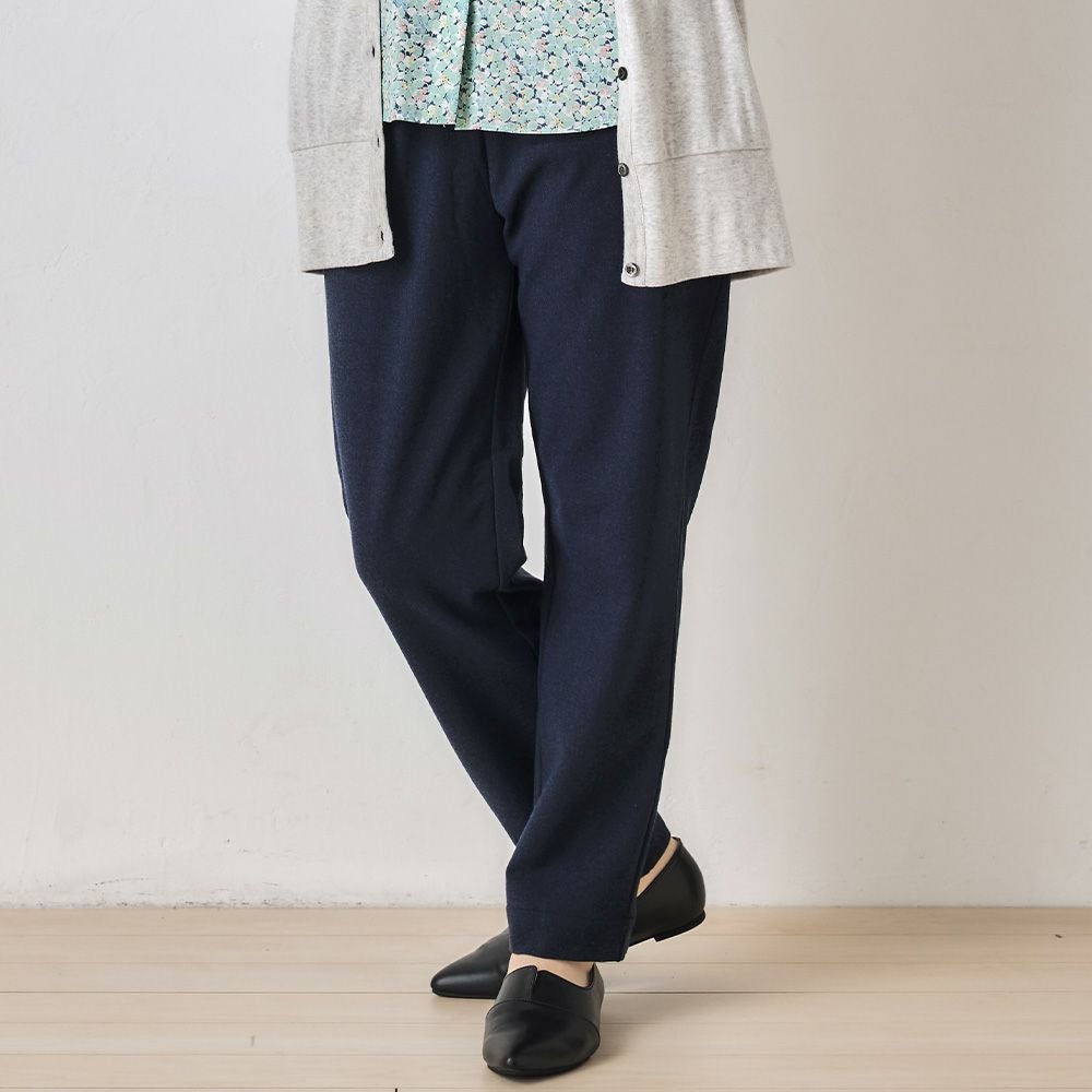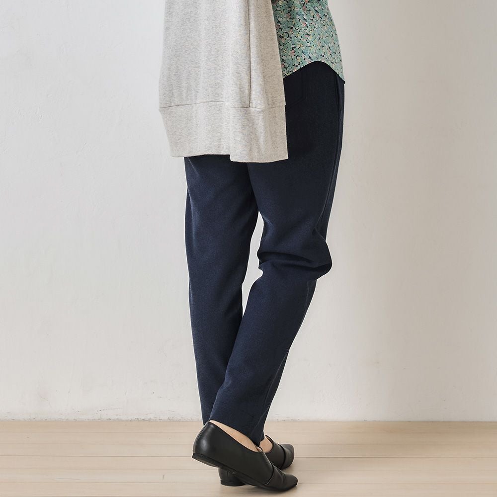 ウール見えする両面起毛素材は、軽量で伸縮性も抜群。自宅で洗えるイージーケアもうれしいポイント。日本の尾州で丁寧に織られた素材は程よい光沢感もあり上品な着こなしにもぴったりです。