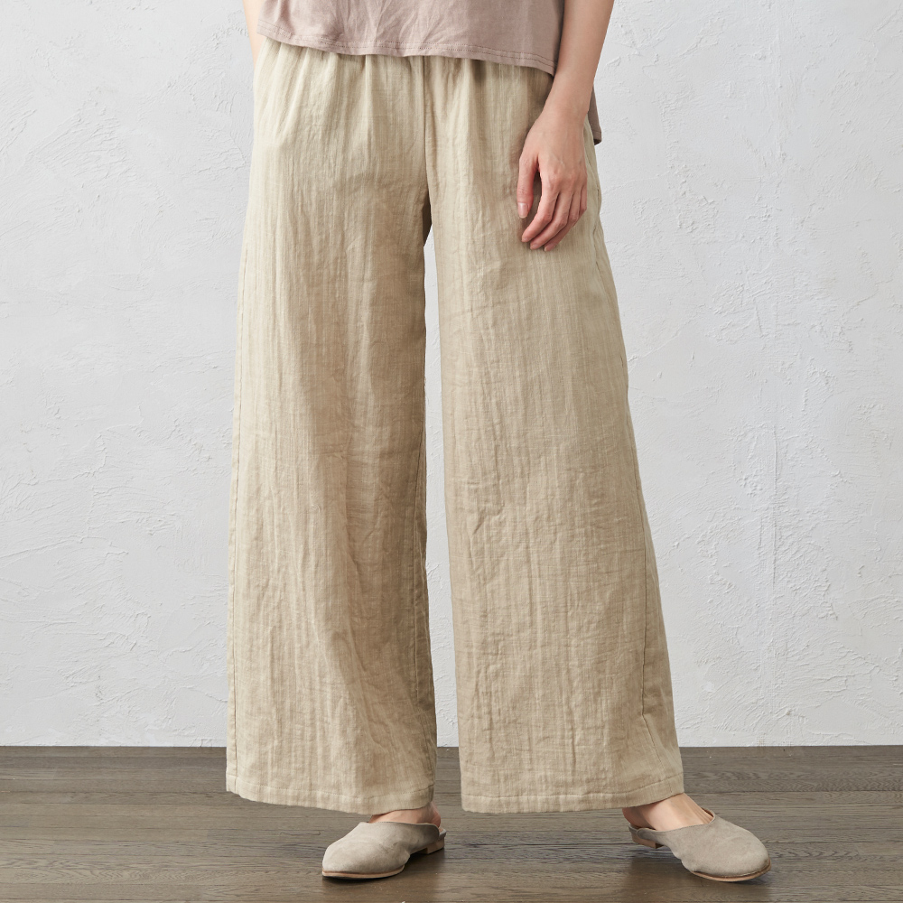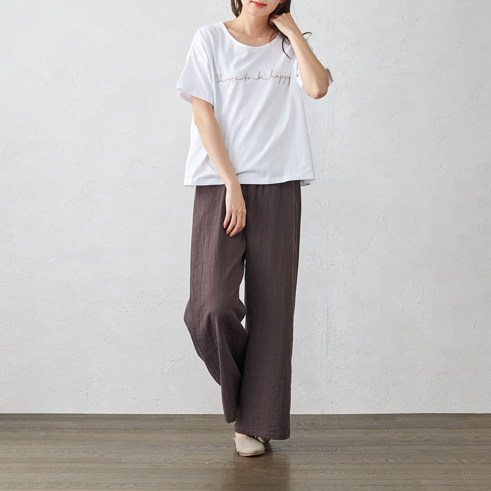 さらり快適な綿100%。定番のダブルガーゼを使用したワイドパンツ。 肌触りがよくさらさら快適。 シーンやスタイル問わずお使いいただけるベーシックパンツです。