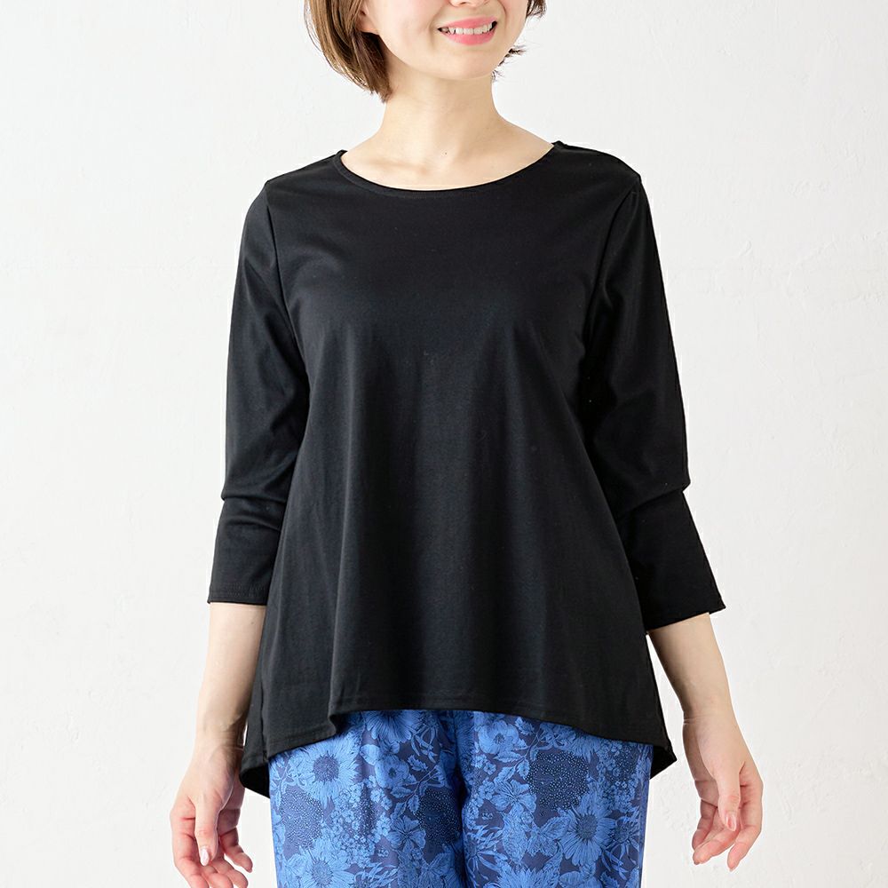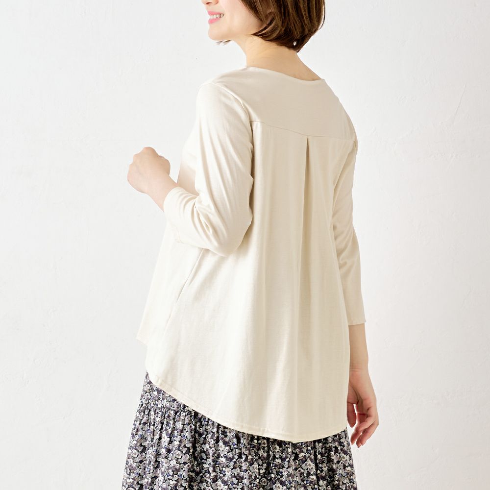 汗ばむ時期の悩みの種。脇や背中など汗をかくと汗染みがくっきり。そんな夏のお悩みを解決。特殊加工を施したコットン素材は汗をかいても汗染みが目立たない嬉しい機能付き。 後ろにタックの入ったAラインシルエットの7分袖カットソー。ふんわり揺れるドレープ感が上品な印象の一枚です。7分袖なので気になる二の腕や肘を隠せるのも嬉しいポイントです。