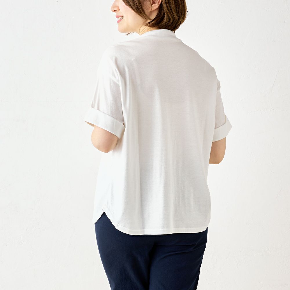 こなれ感のあるモックネックデザインに袖はターンバックに。一枚でサマになるこの夏にオススメのアイテムです。