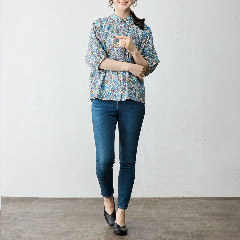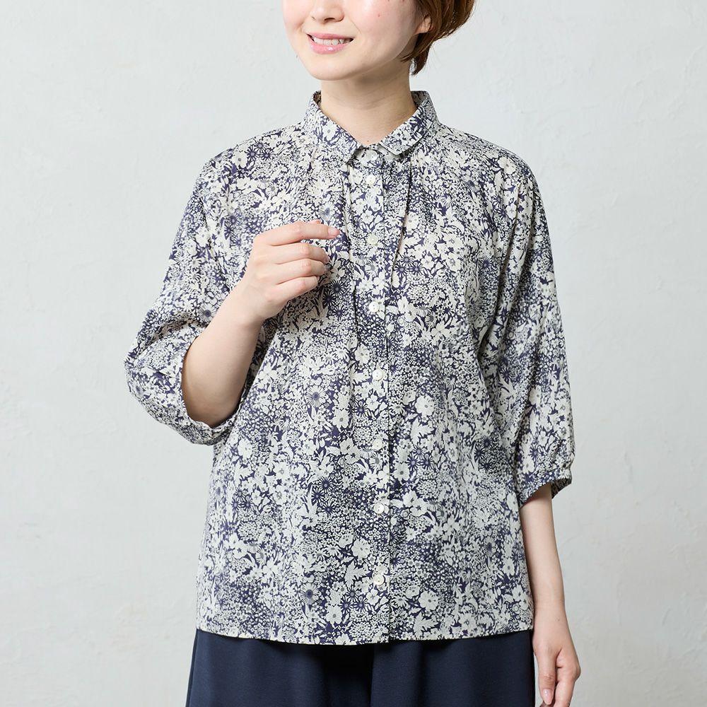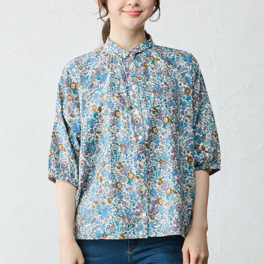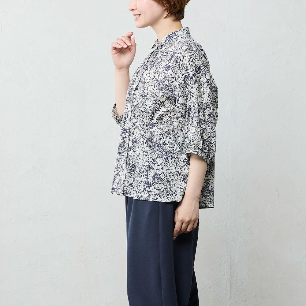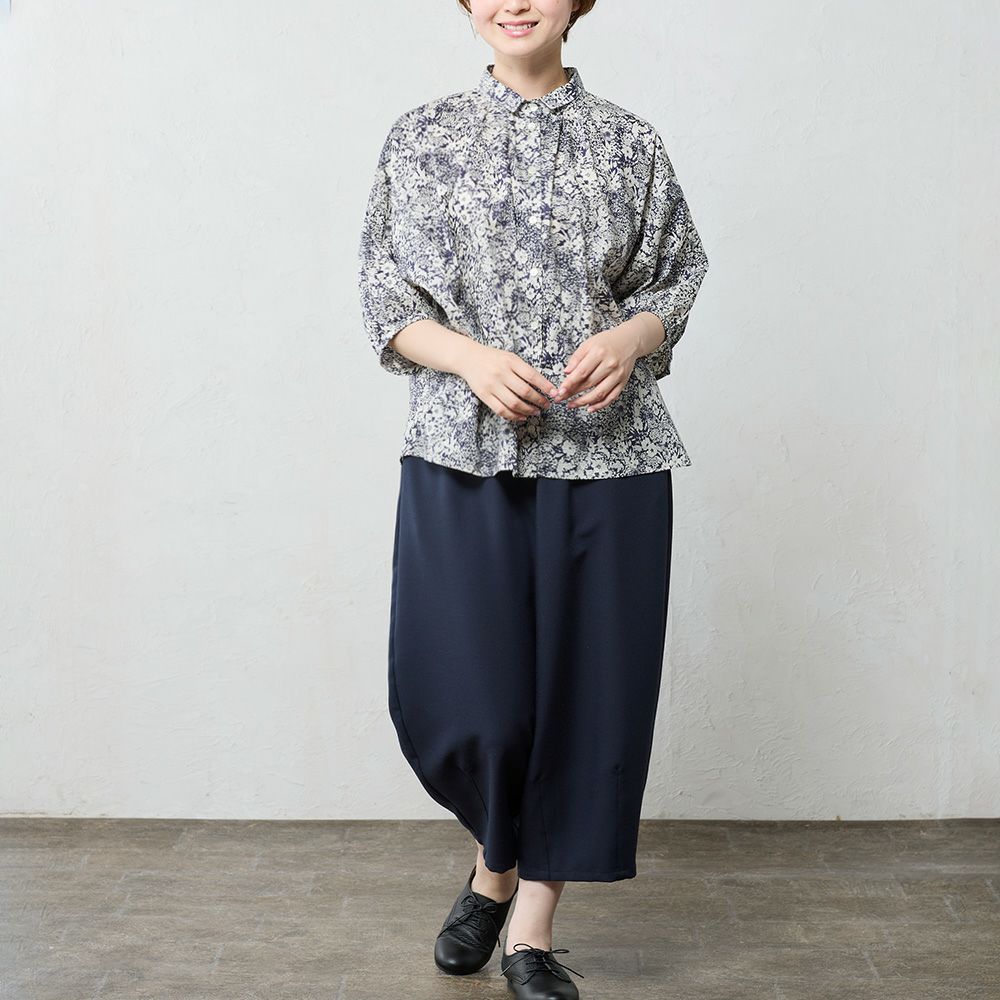 品よく華やぐ、リバティプリント生地を使用したドルマンスリーブブラウス。 ゆったり着られてオシャレ見え。 襟付きだからカジュアルになりすぎず、大人の品あるコーディネートに◎