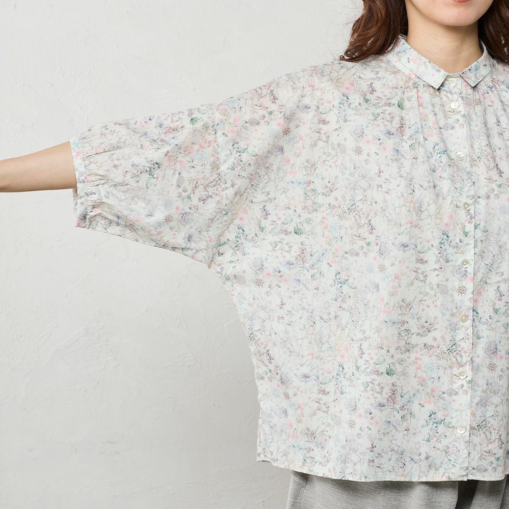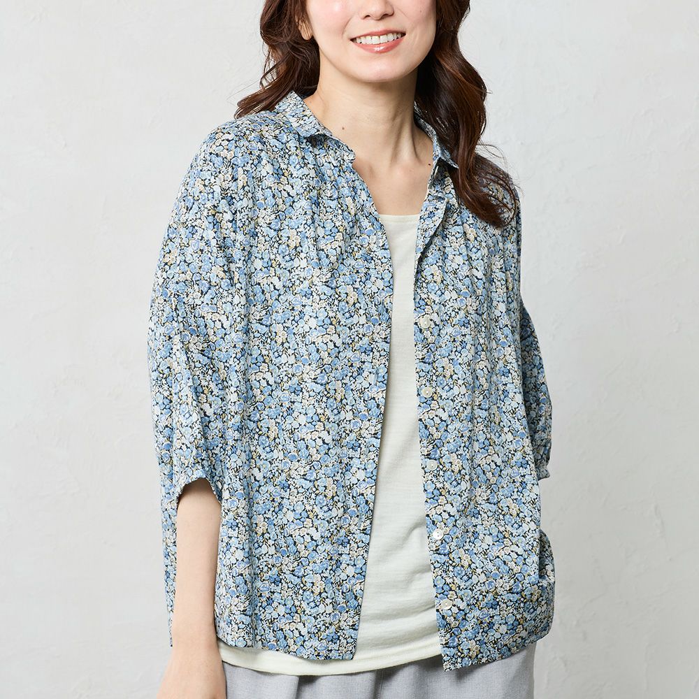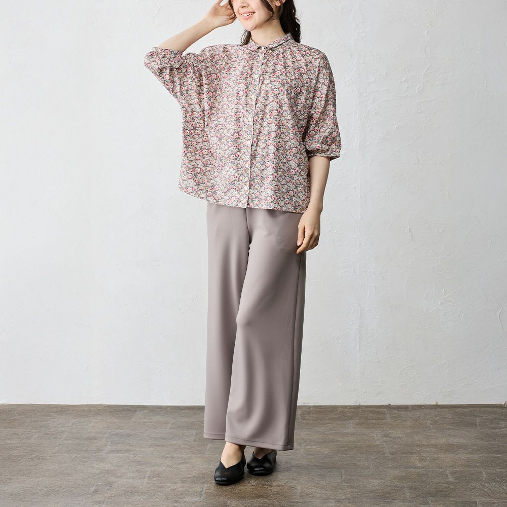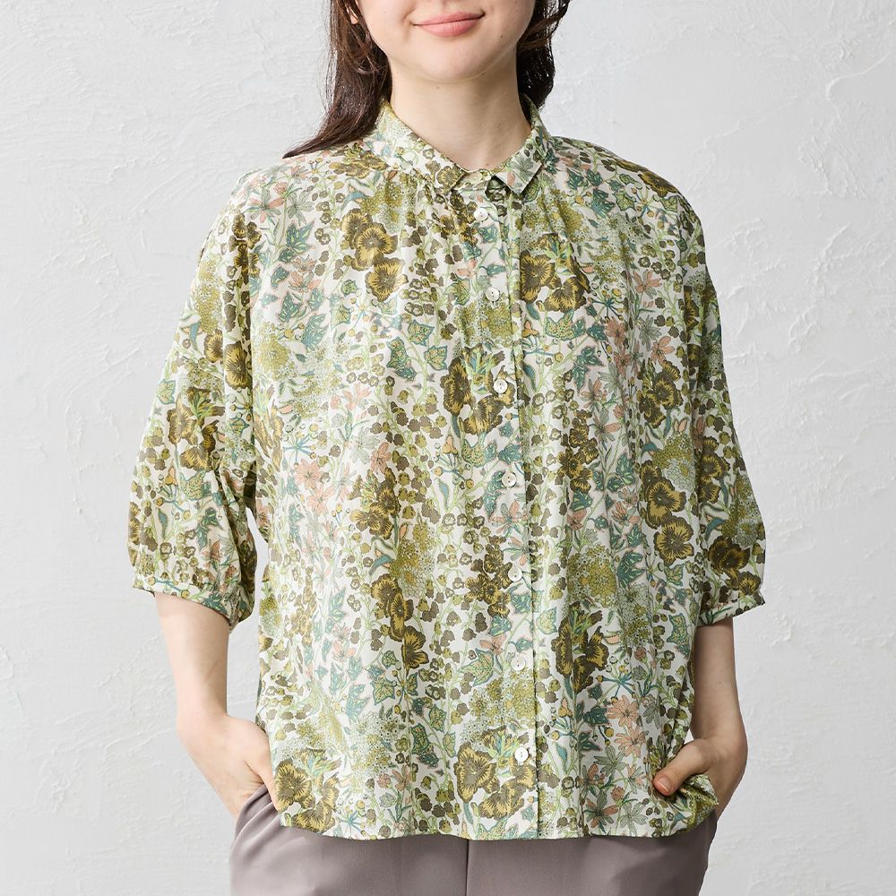 品よく華やぐ、リバティプリント生地を使用したドルマンスリーブブラウス。 ゆったり着られてオシャレ見え。 襟付きだからカジュアルになりすぎず、大人の品あるコーディネートに◎