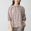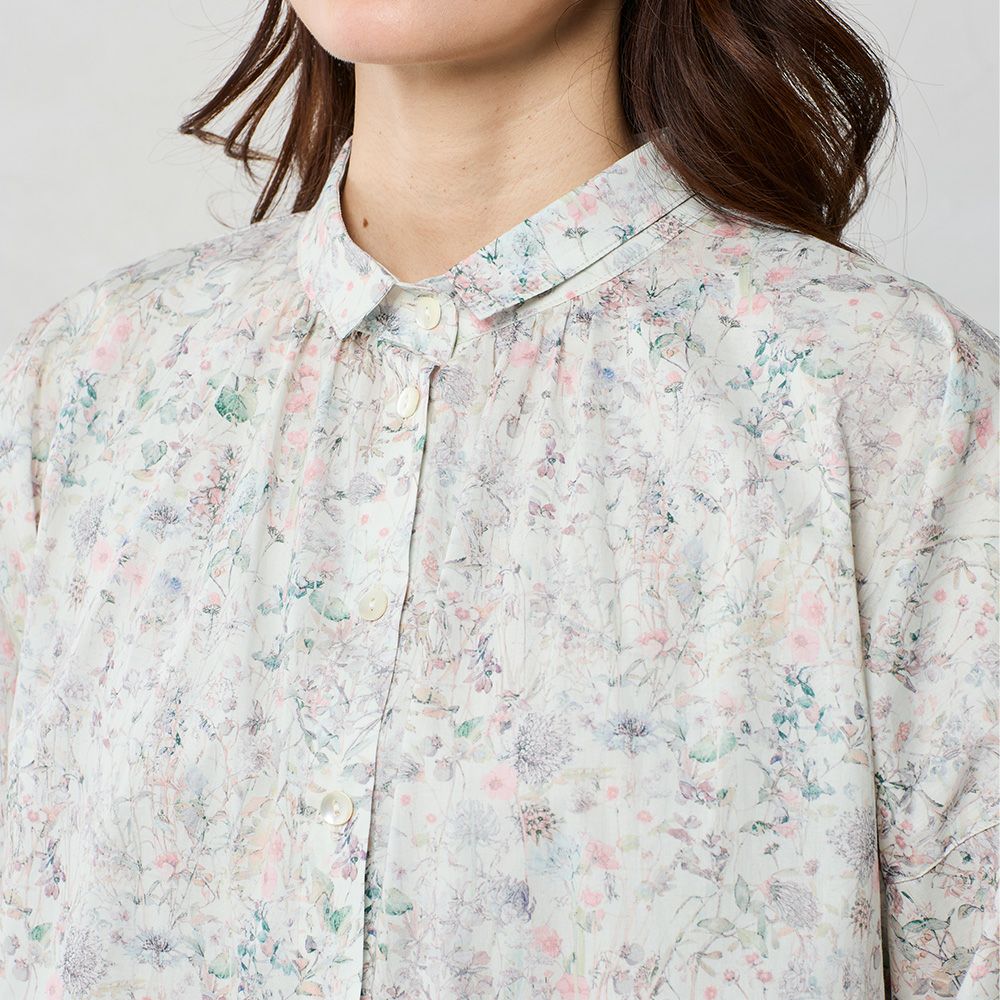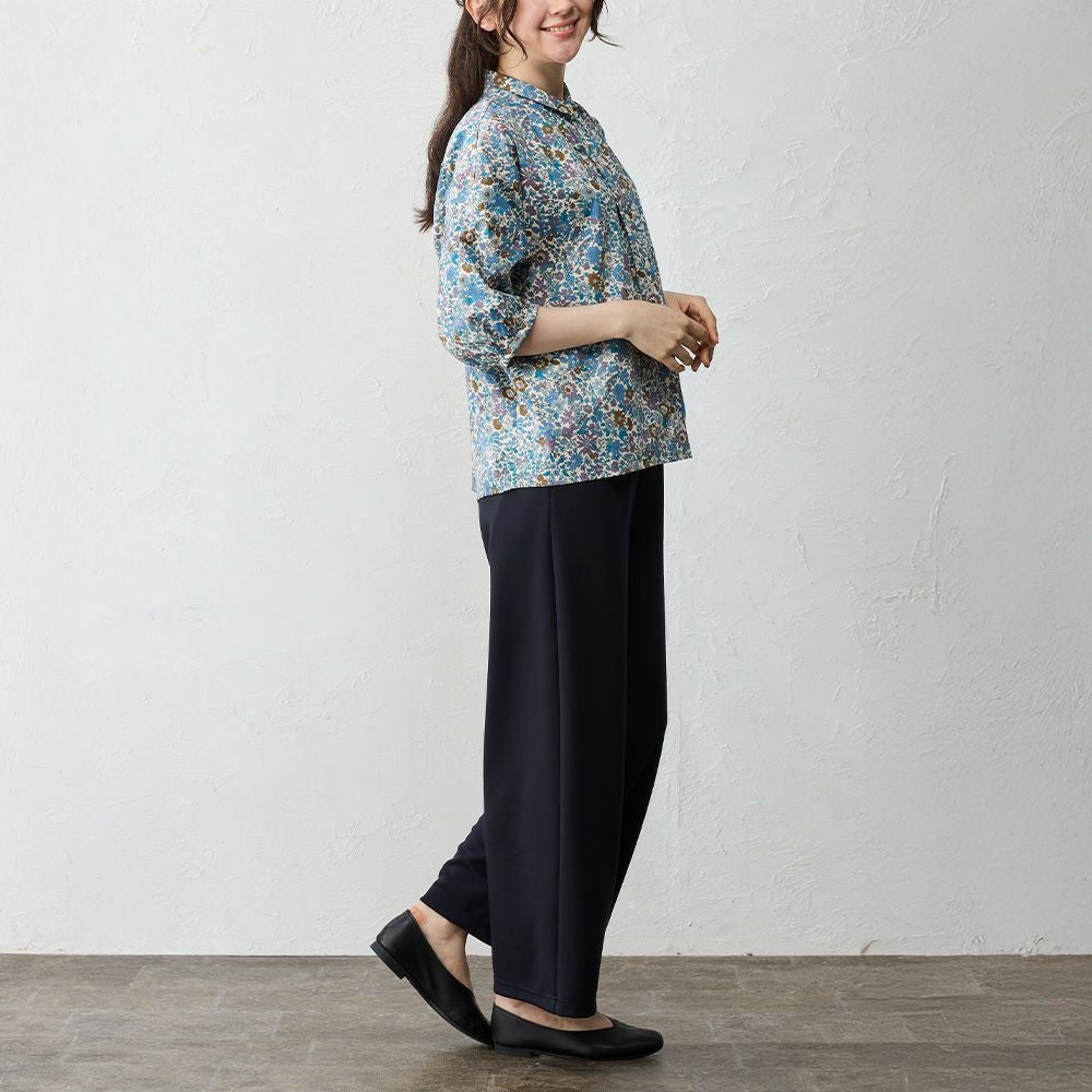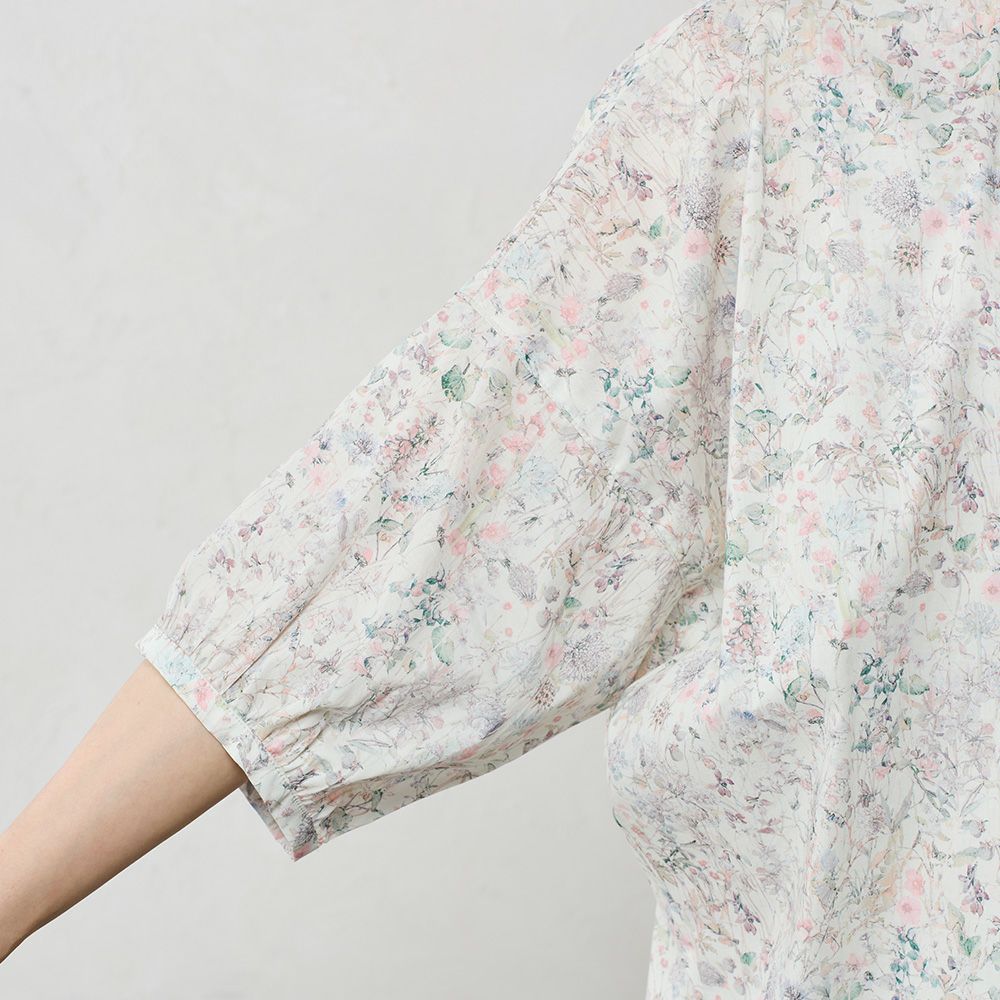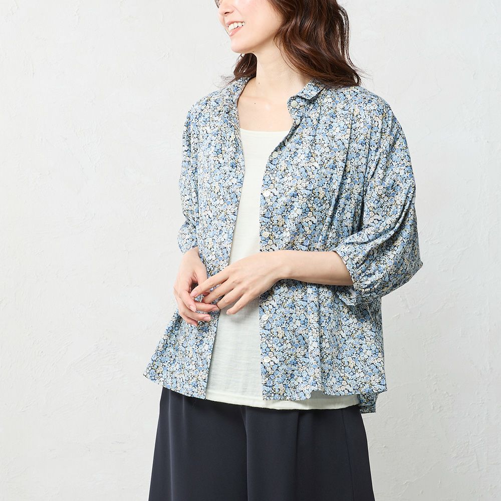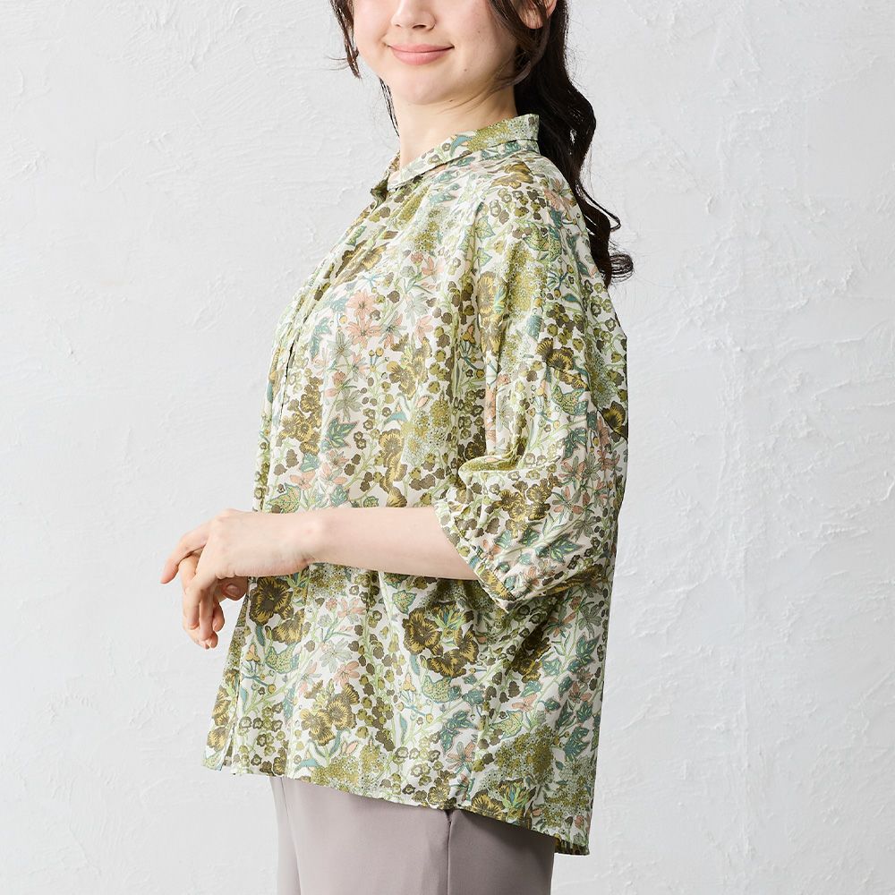 品よく華やぐ、リバティプリント生地を使用したドルマンスリーブブラウス。 ゆったり着られてオシャレ見え。 襟付きだからカジュアルになりすぎず、大人の品あるコーディネートに◎