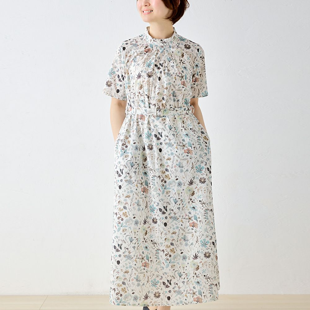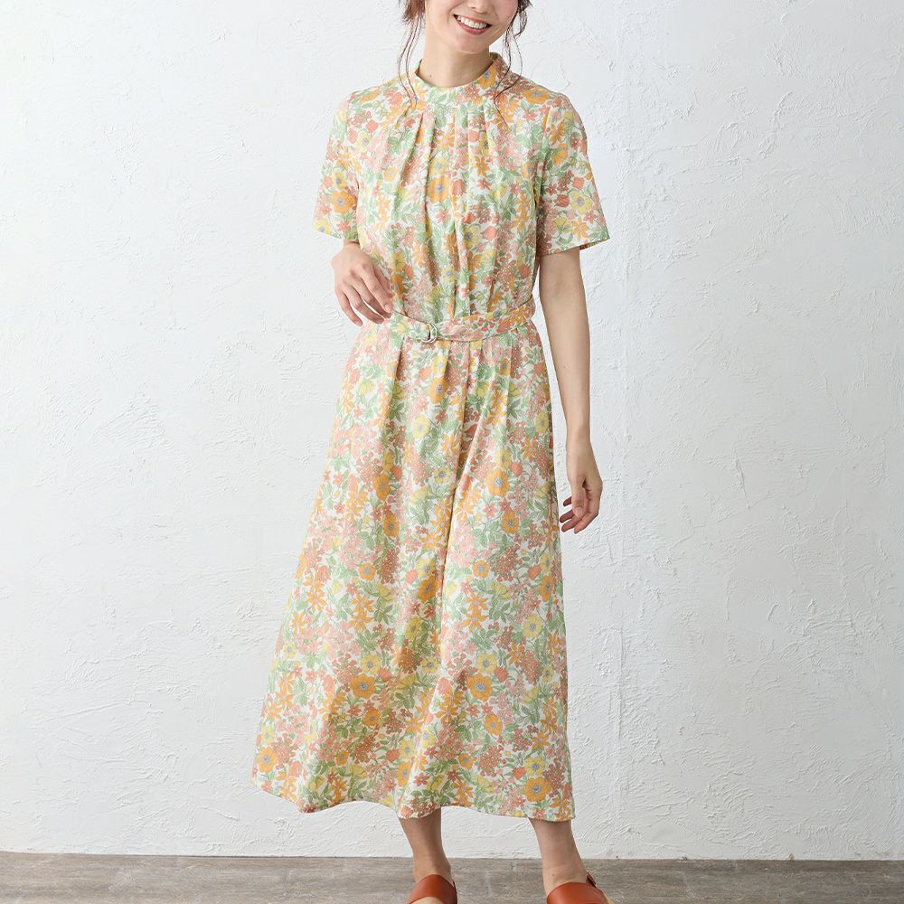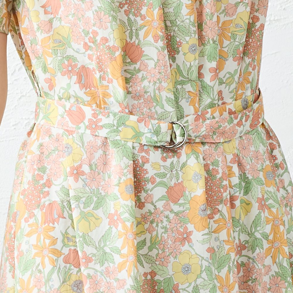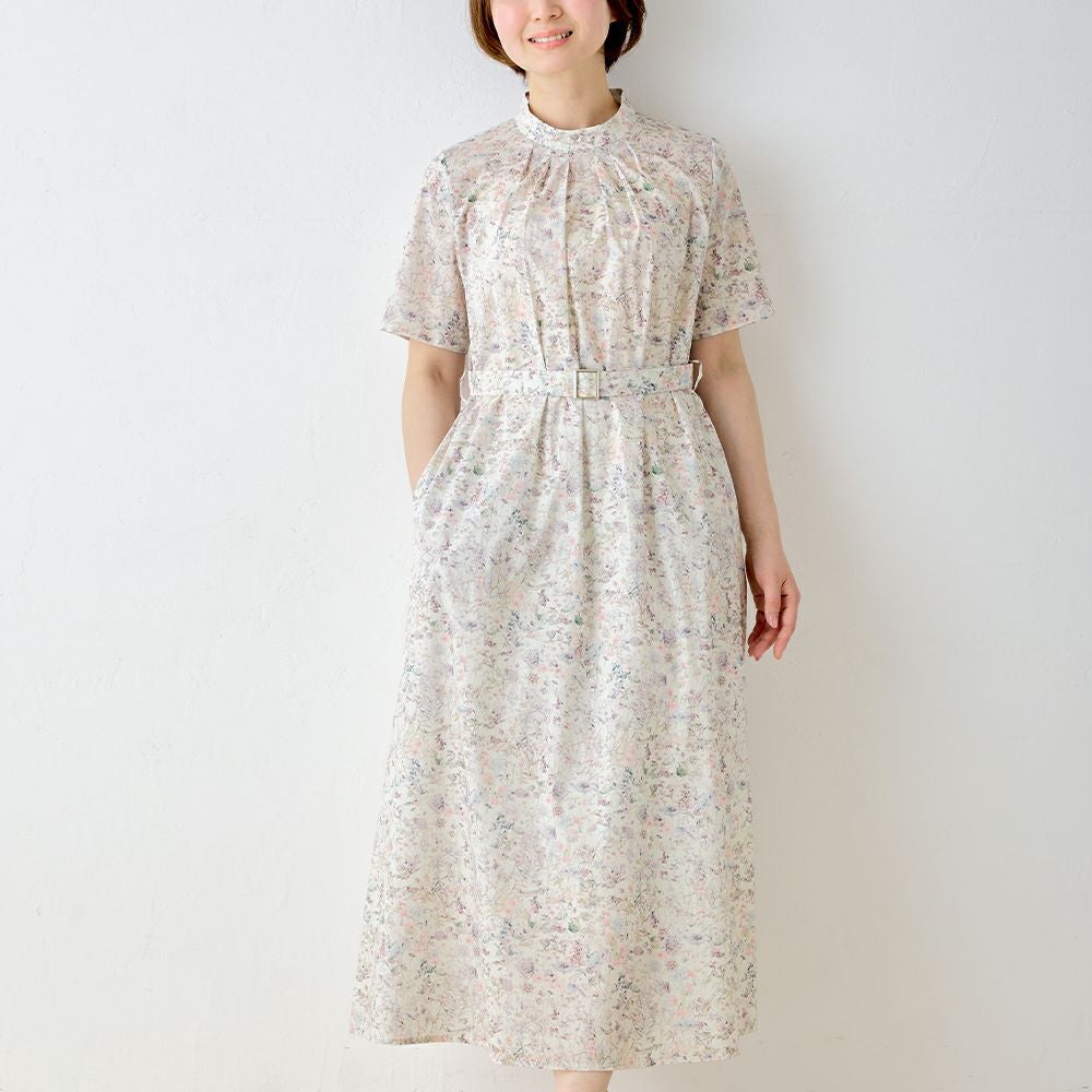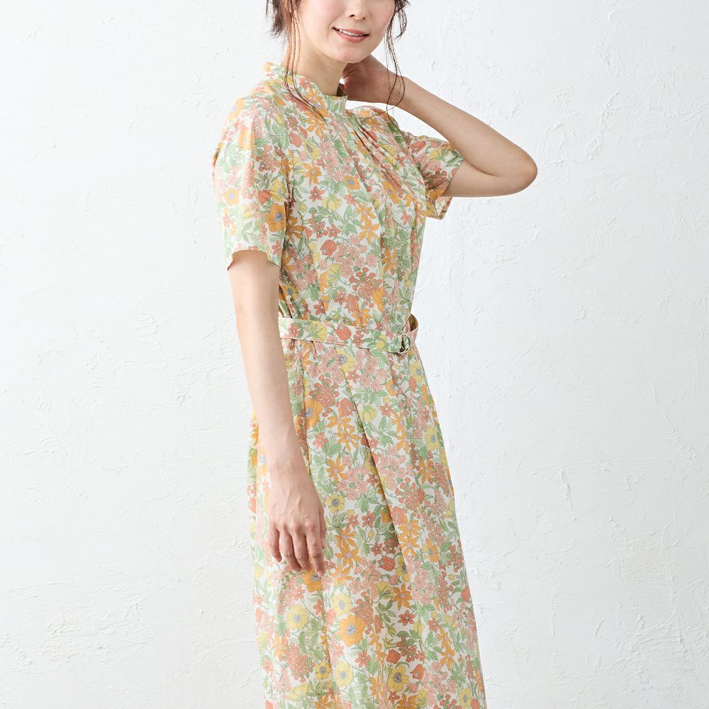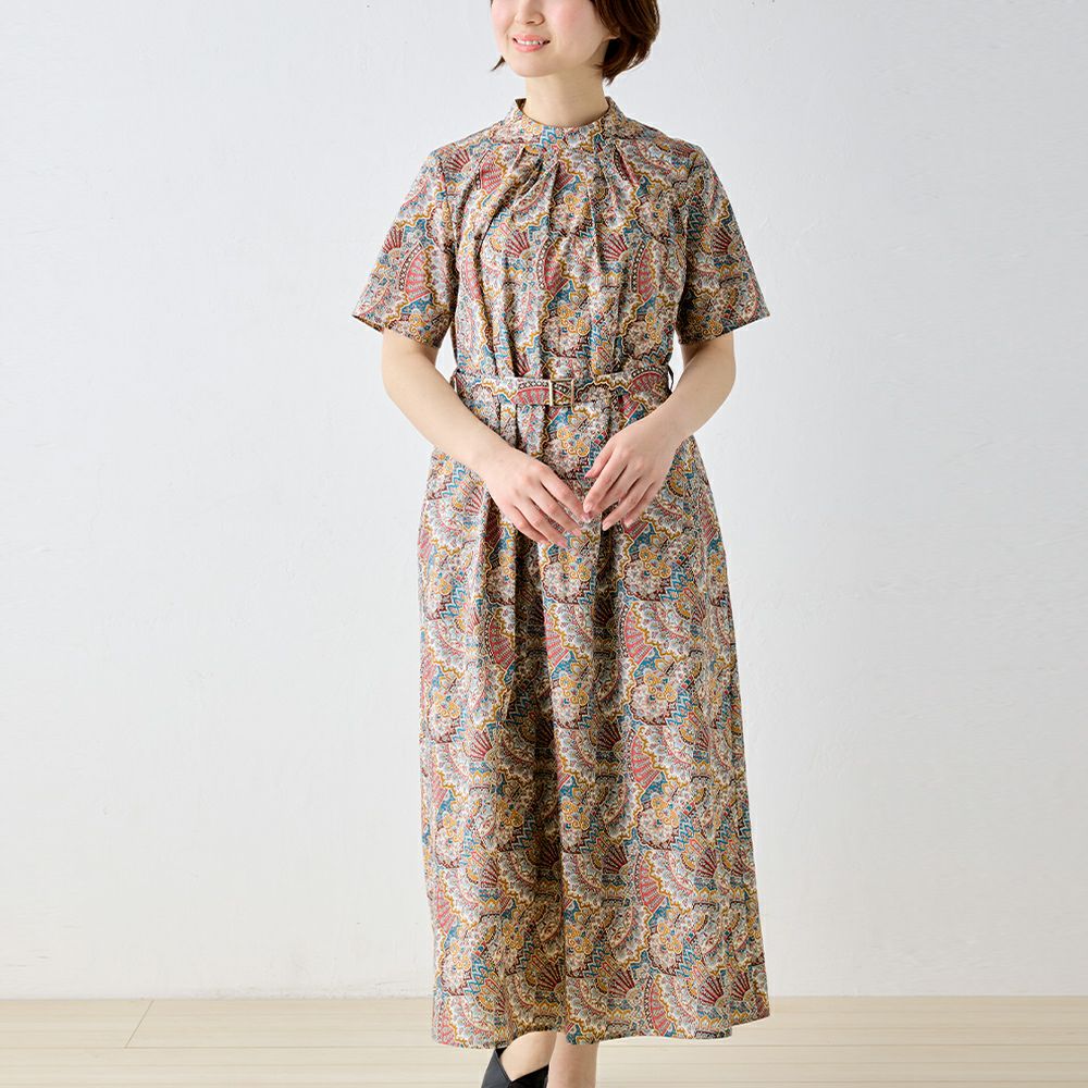 甘くなりすぎない程よいフレア感が大人の女性の装いにピッタリ! リバティプリント タナローン ベルト付き半袖ワンピース