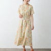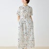 リバティプリントを施しタナローンを使用した、上品な控えめAラインのスタンドカラーワンピース。