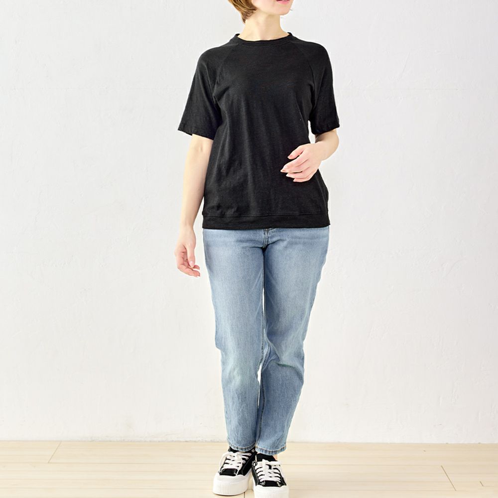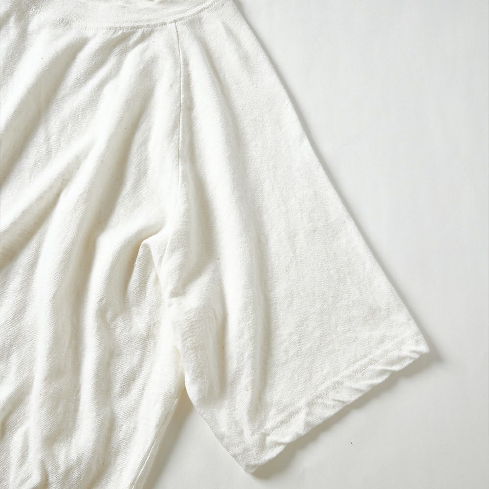 麻の良さと綿の良さを組み合わせたSPANオリジナル素材。ナチュラル感のある雰囲気で、一枚で着ても雰囲気の出るアイテム。素材は単糸と言う1本の繊維で編み上げる生地で、使い込むうちにナチュラルなねじれ感に。 春夏は風を通し快適に。秋冬は保温性の高さを活かしてインナーとしても。年中使える万能アイテムです。