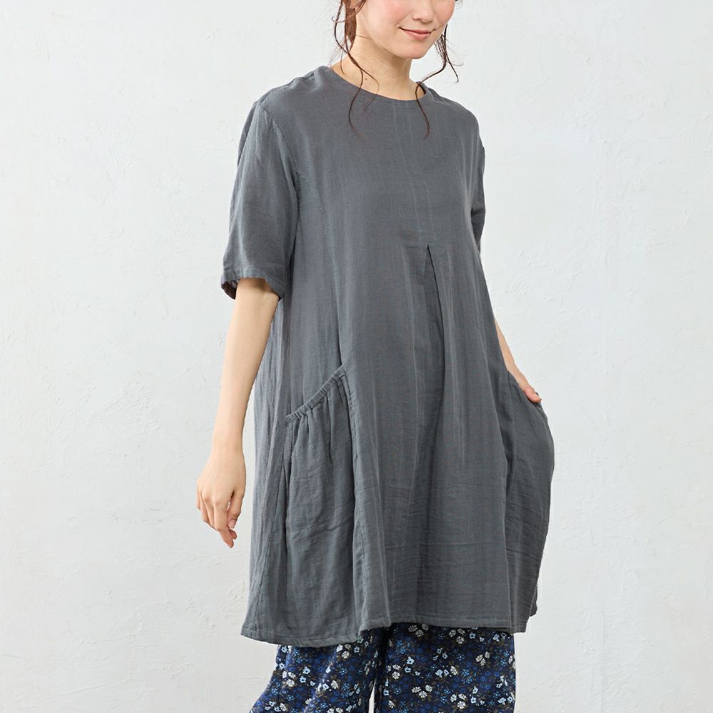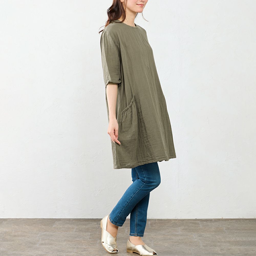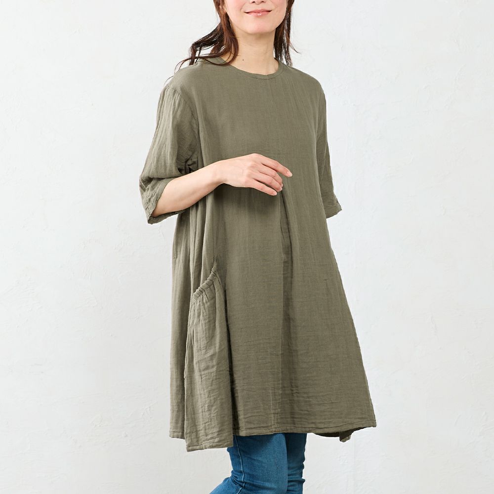 風通しが良く吸水性が抜群のインド綿を使用したチュニック。インド綿らしい表情のダブルガーゼチュニックは優しい表情のアイテムです。お尻まで隠れる丈感で体型カバーにも。暑い夏を快適に過ごせるアイテムです。
