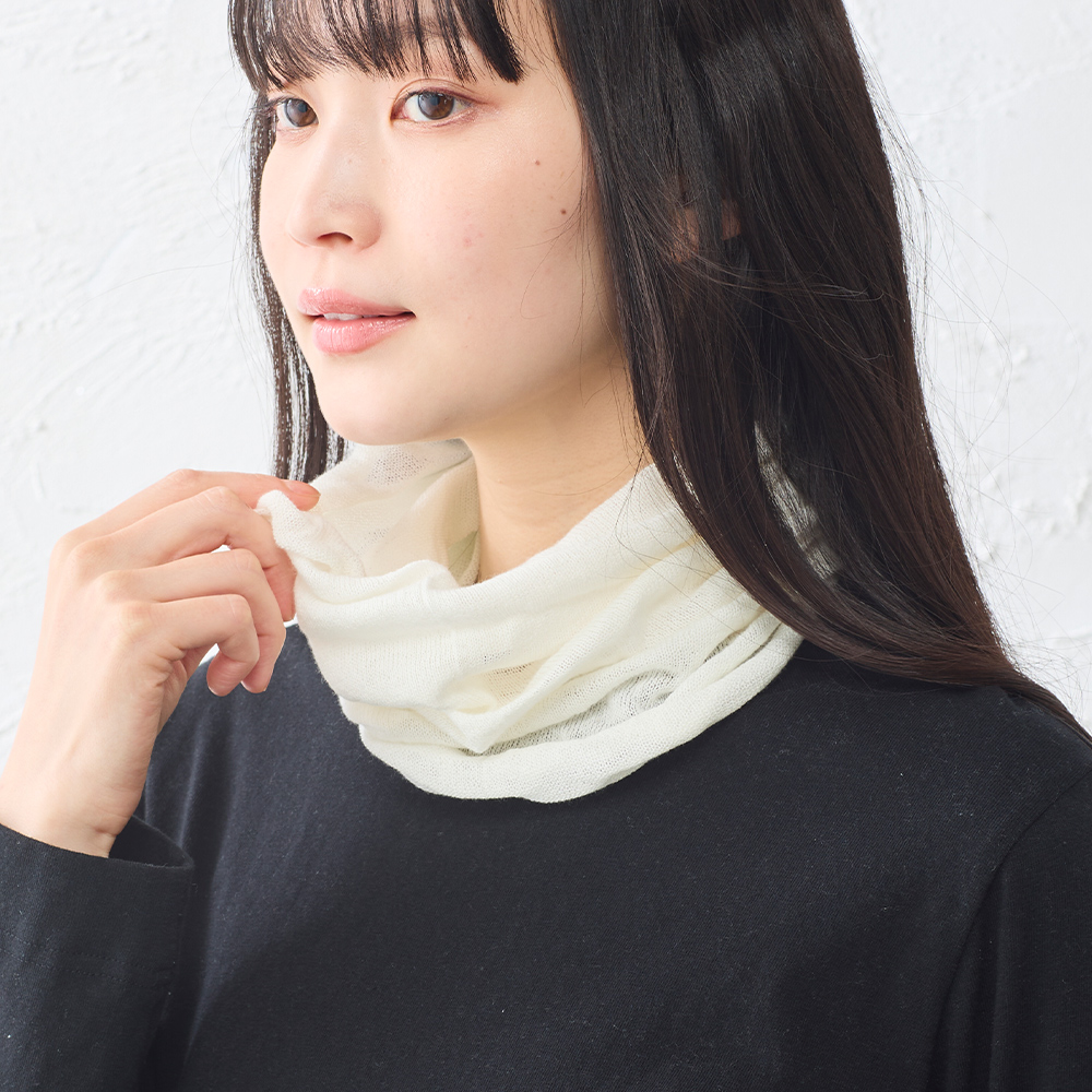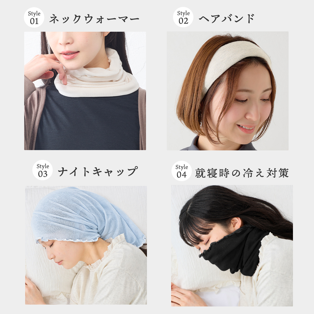 ネックウォーマーとして首元をあたためるのはもちろん、ヘアバンドとして髪をすっきりまとめたり、就寝時にはナイトキャップとして髪をやさしく包み込む使い方もおすすめ。 さらに、軽くかぶって帽子のように取り入れるなど、アイデア次第でさまざまな用途に活躍します。 季節を問わず使いやすく、おうち時間からお出かけまで幅広く寄り添う一枚です。