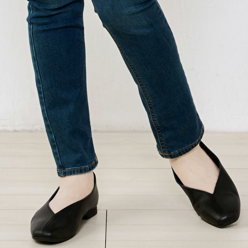 Vカットのトップラインが脚を美しく見せ、ヒール無しでも上品な印象に