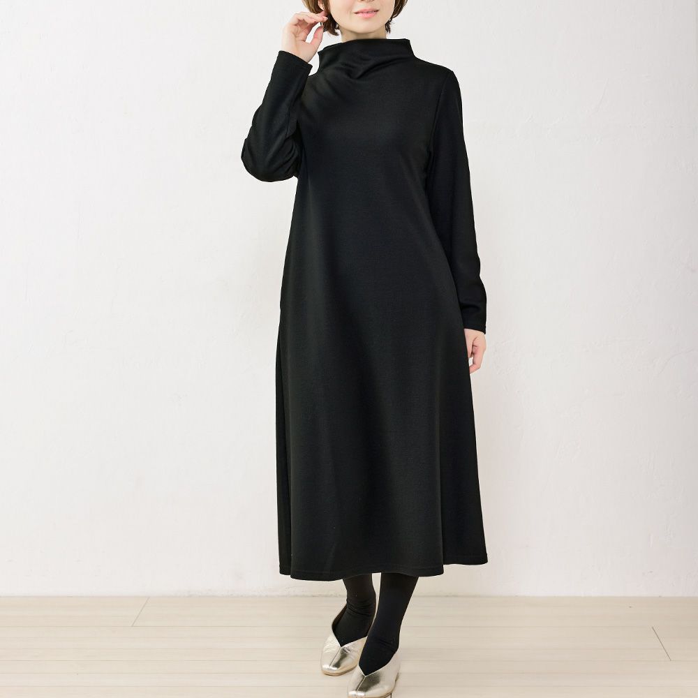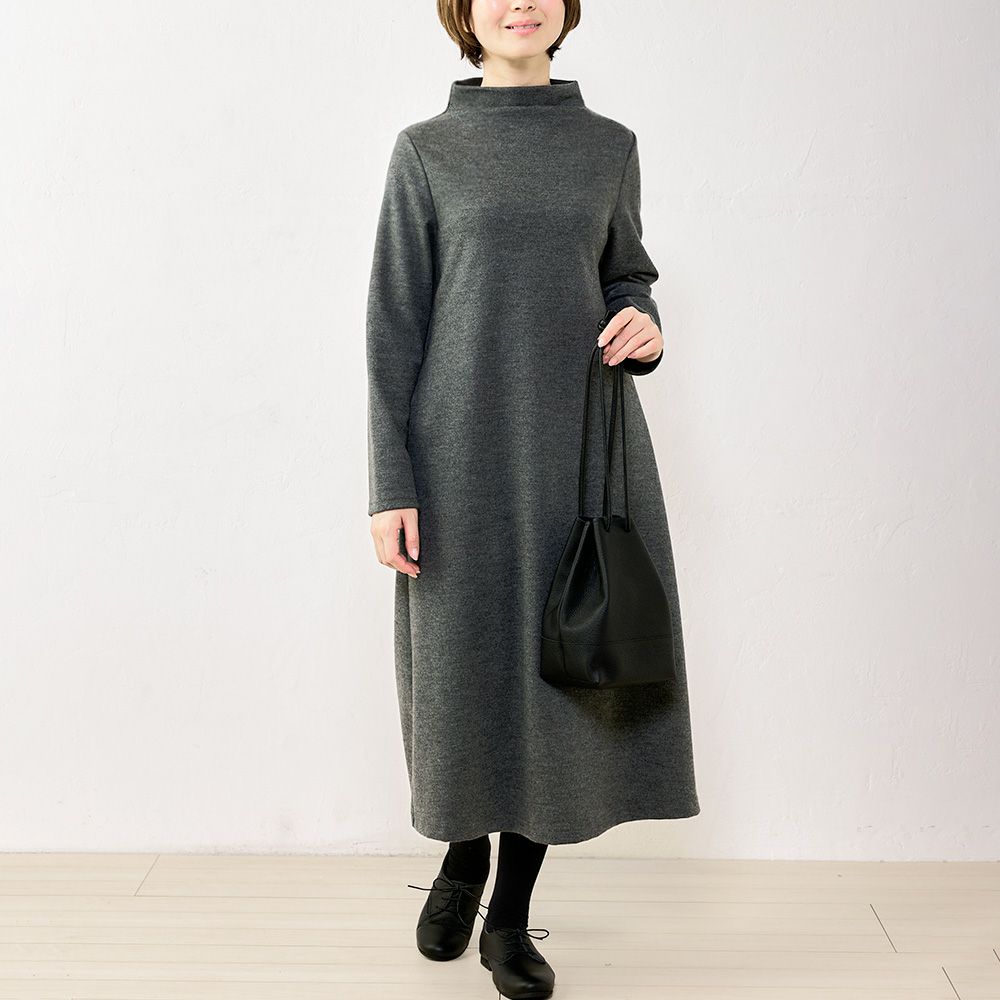 尾州産の最高品質の圧縮ウールを使用したロングワンピース。ストンと落ちる控えめなAラインシルエットと光沢のある美しいドレープ感が上品な印象に。首元を隠しながらも華やかに見せるモックネックデザイン。シンプルな中にも洗練された確かな美しさをも持ったロングワンピース。