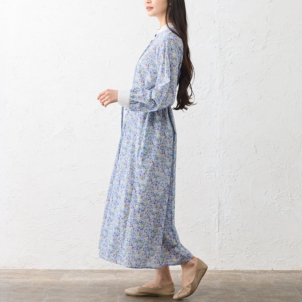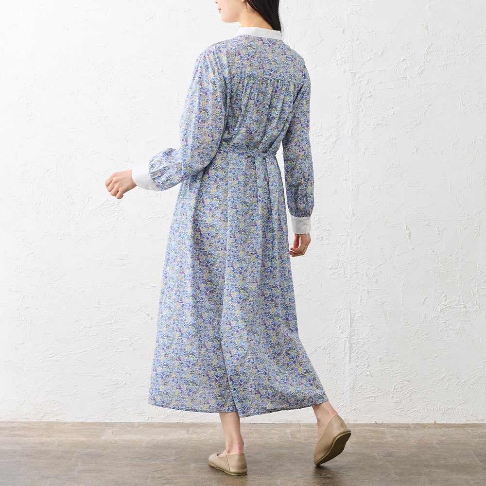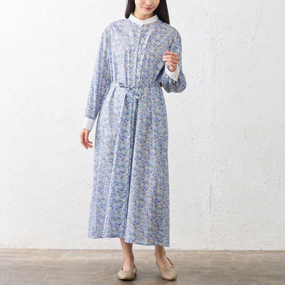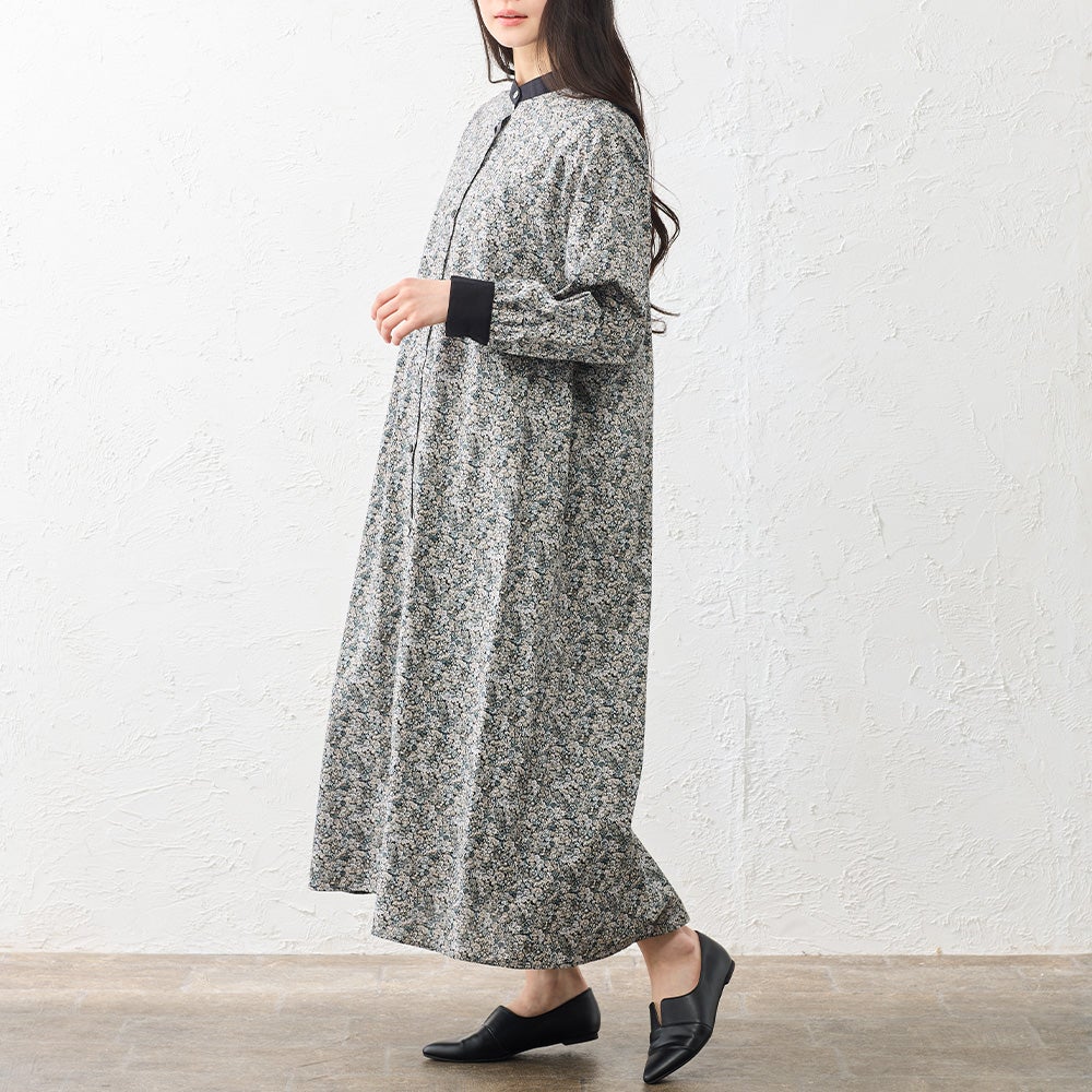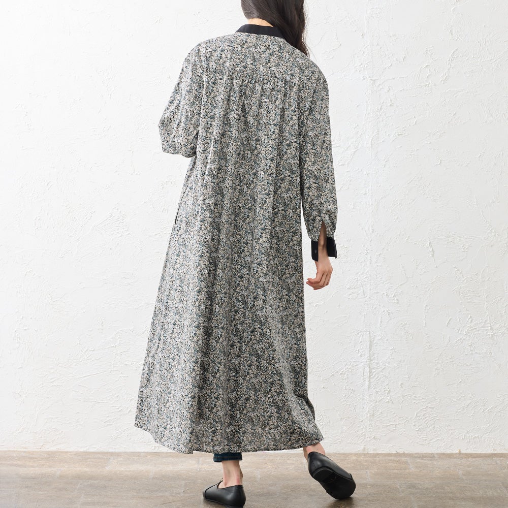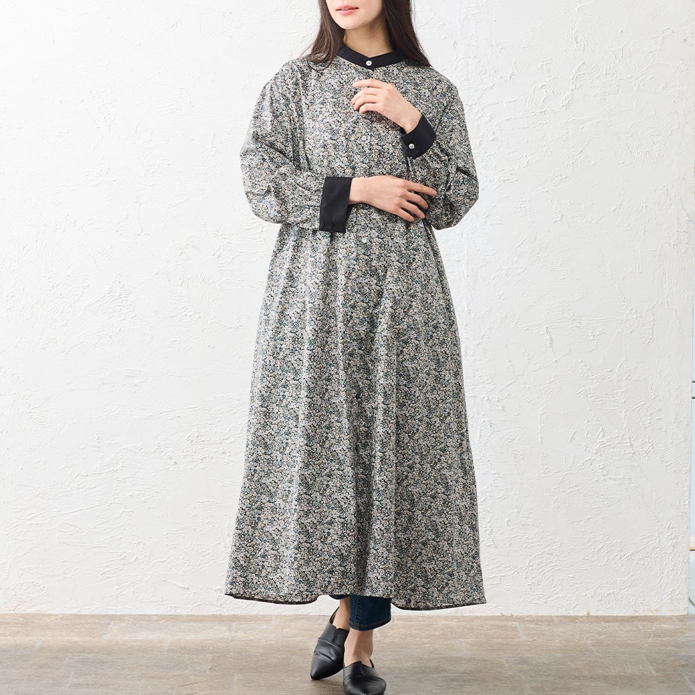 襟元と袖口を無地で切り替えたクレリックデザインが印象的なシャツワンピース。 繊細なリバティプリントにメリハリを添え、装いをすっきりと引き締めてくれます。 程よくゆとりを持たせたシルエットは、身体のラインを拾いすぎず自然に整うバランスに。 一枚でさらりと着るのはもちろん、軽く羽織ったりレイヤードしたりと着こなしの幅が広がる、大人のワードローブに取り入れたい一着です。