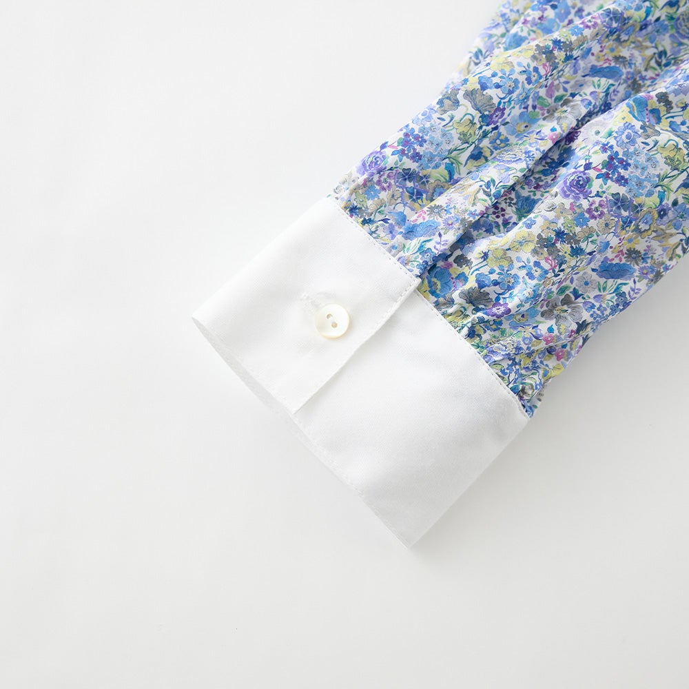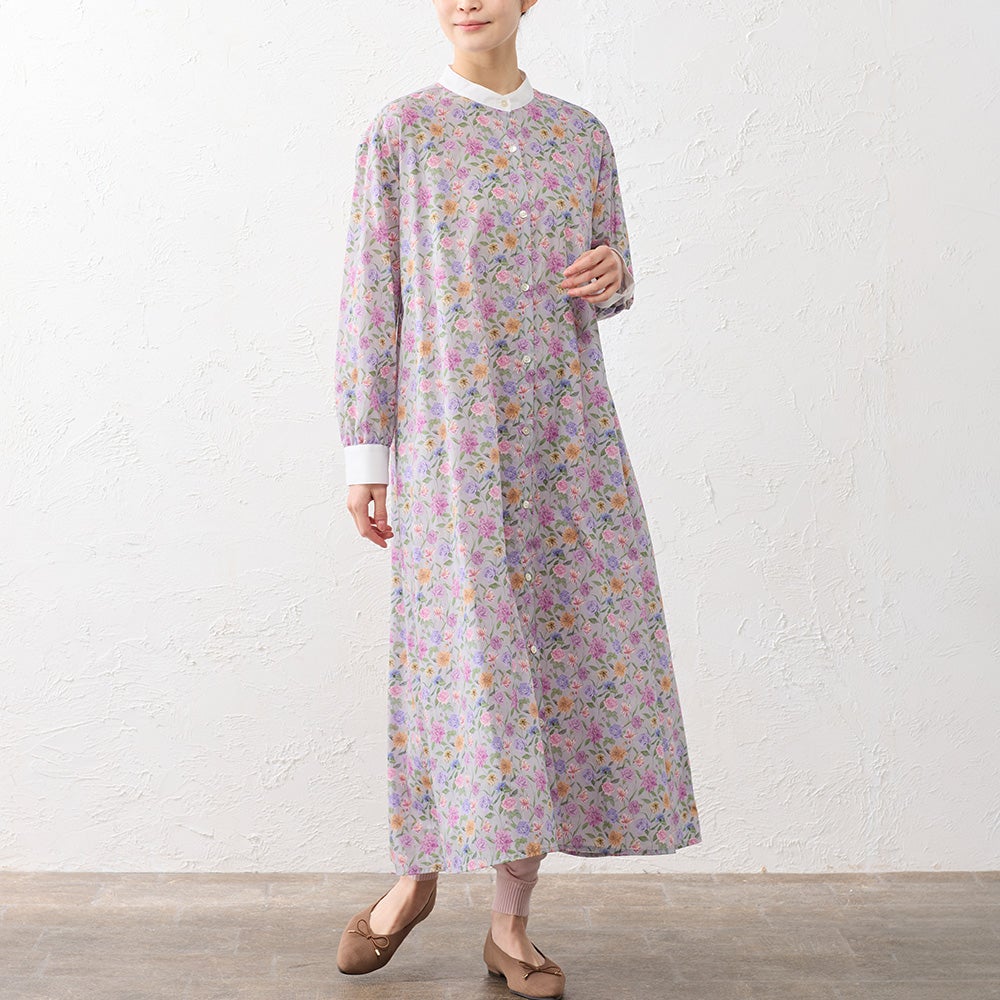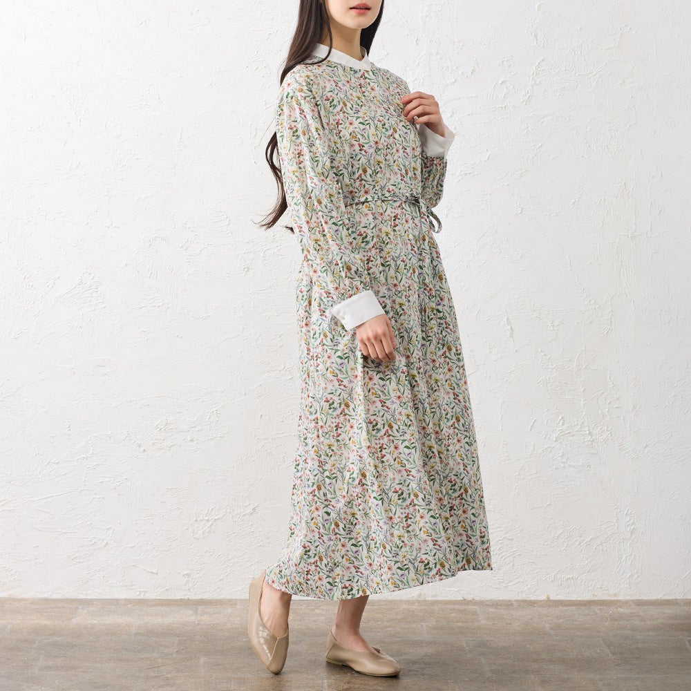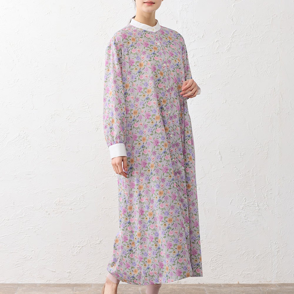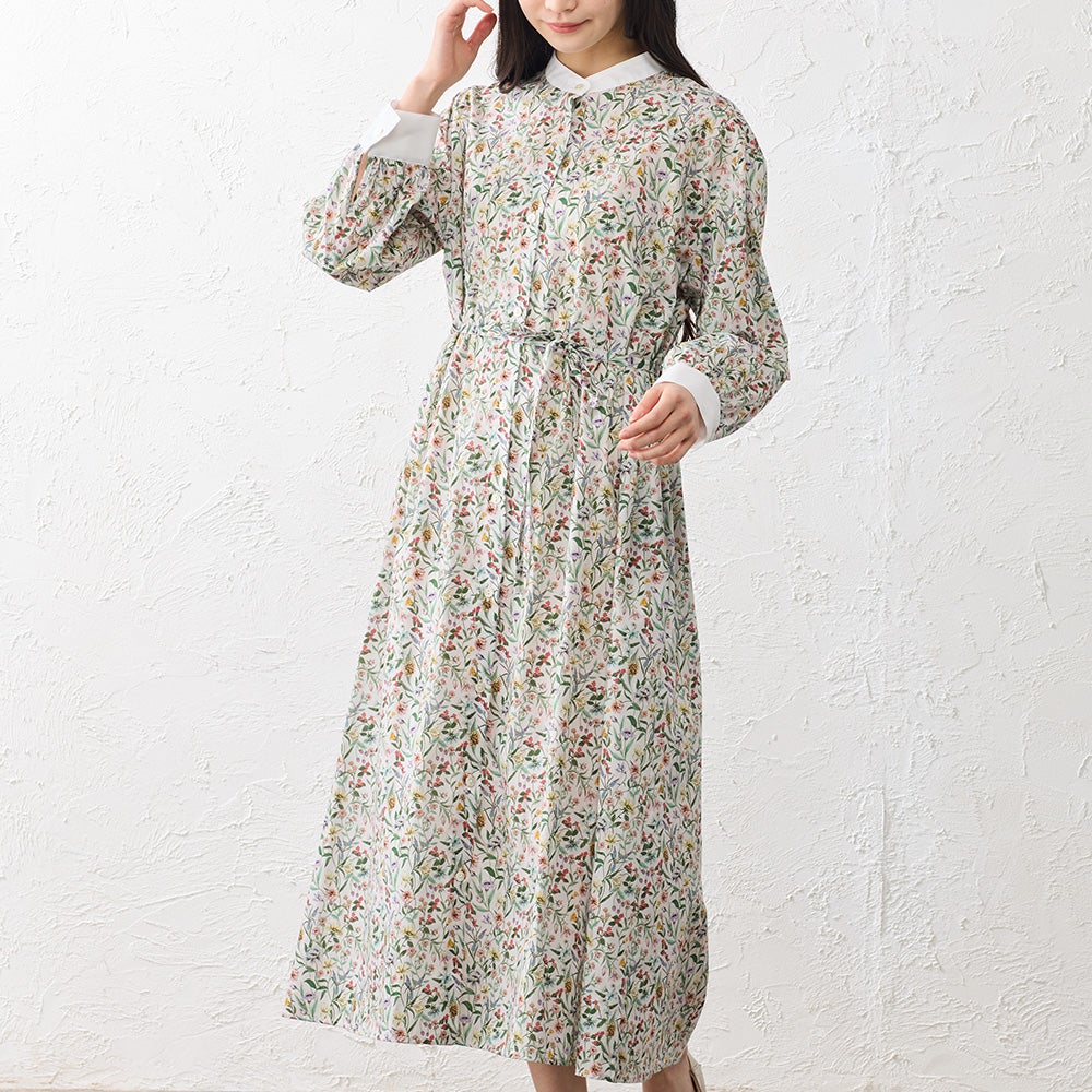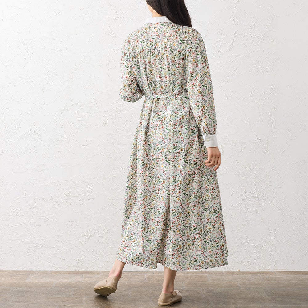 襟元と袖口を無地で切り替えたクレリックデザインが印象的なシャツワンピース。 繊細なリバティプリントにメリハリを添え、装いをすっきりと引き締めてくれます。 程よくゆとりを持たせたシルエットは、身体のラインを拾いすぎず自然に整うバランスに。 一枚でさらりと着るのはもちろん、軽く羽織ったりレイヤードしたりと着こなしの幅が広がる、大人のワードローブに取り入れたい一着です。