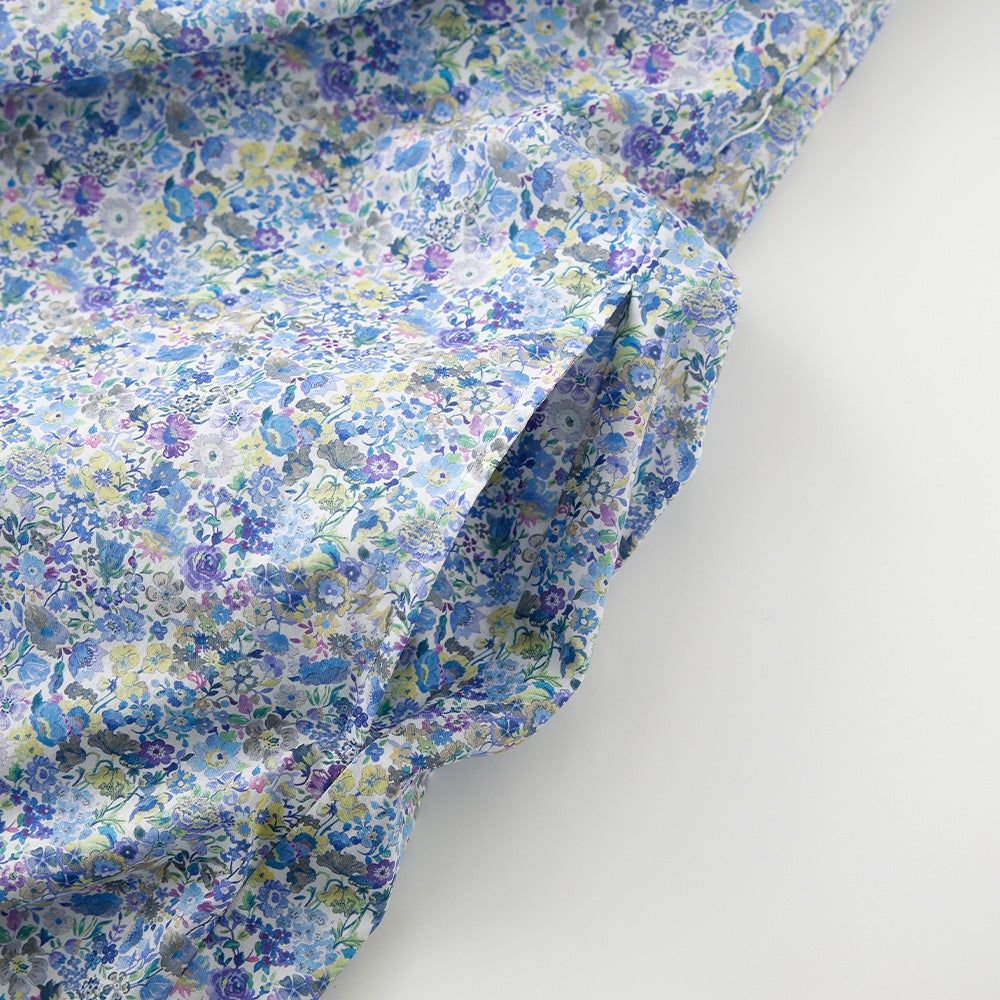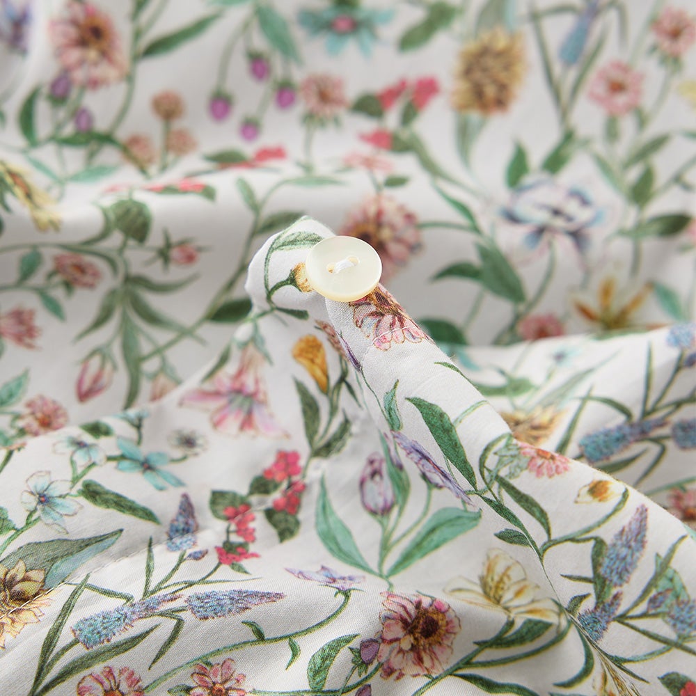 リバティのタナローンは、超長綿の極細糸(100番手)を高密度に織り上げることで、シルクのような滑らかな肌触りと軽やかな着心地を実現し、美しいプリント表現、通気性・速乾性・シワになりにくい特性を兼ね備えた上質なコットン素材です。