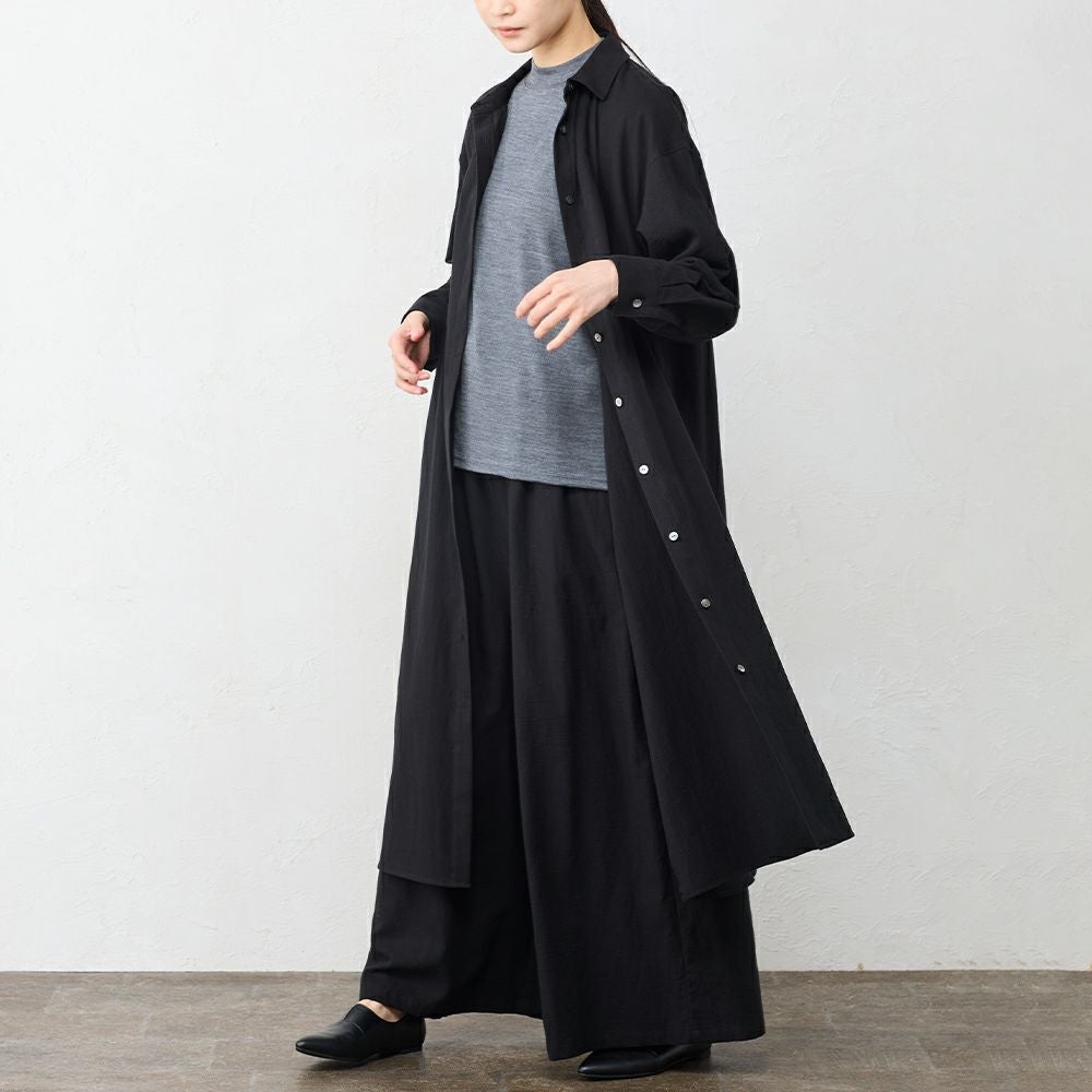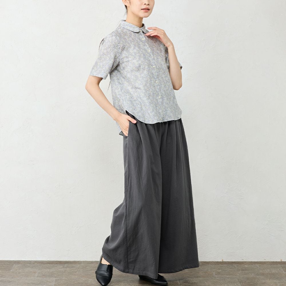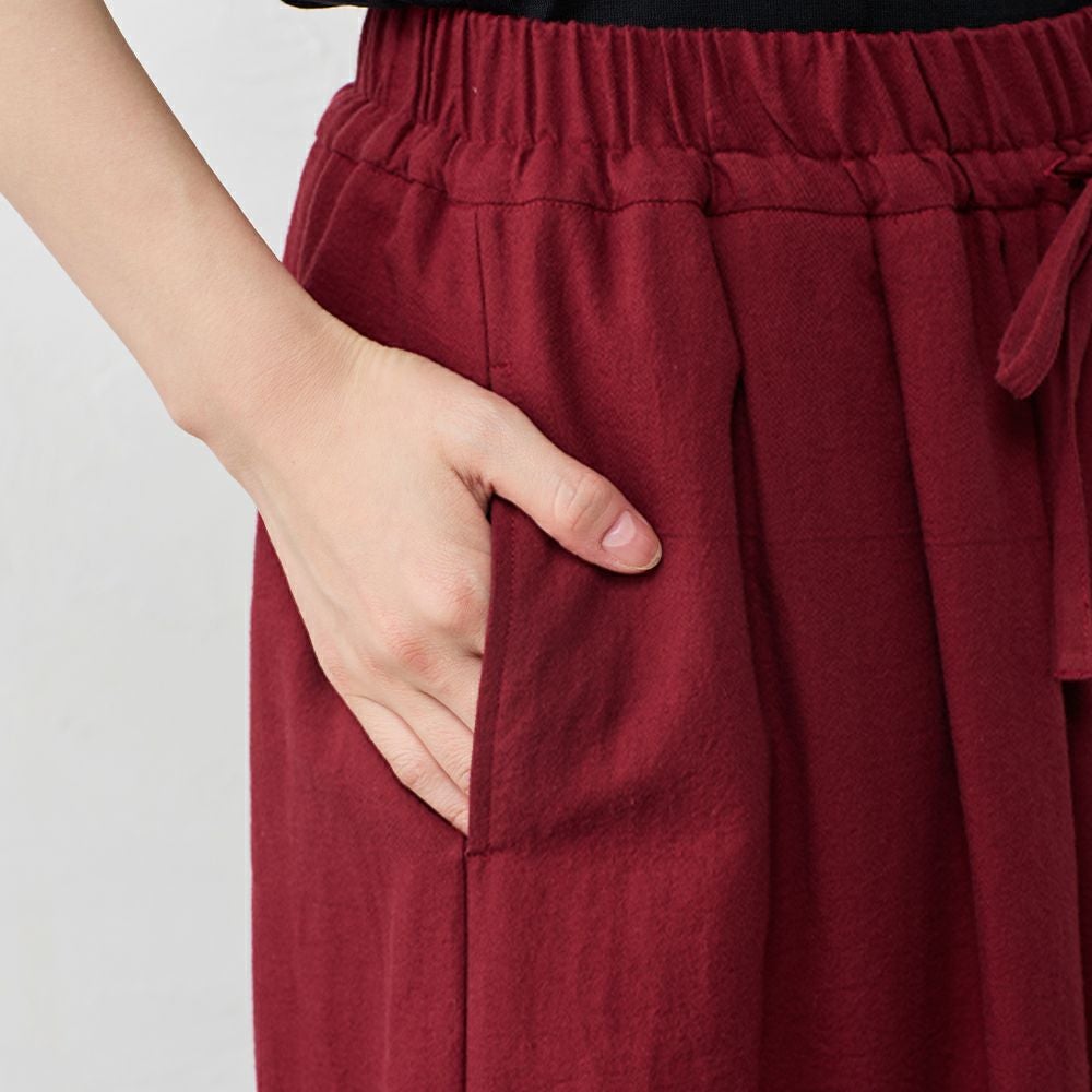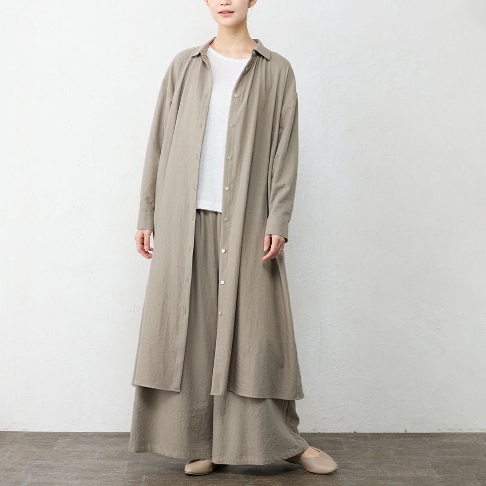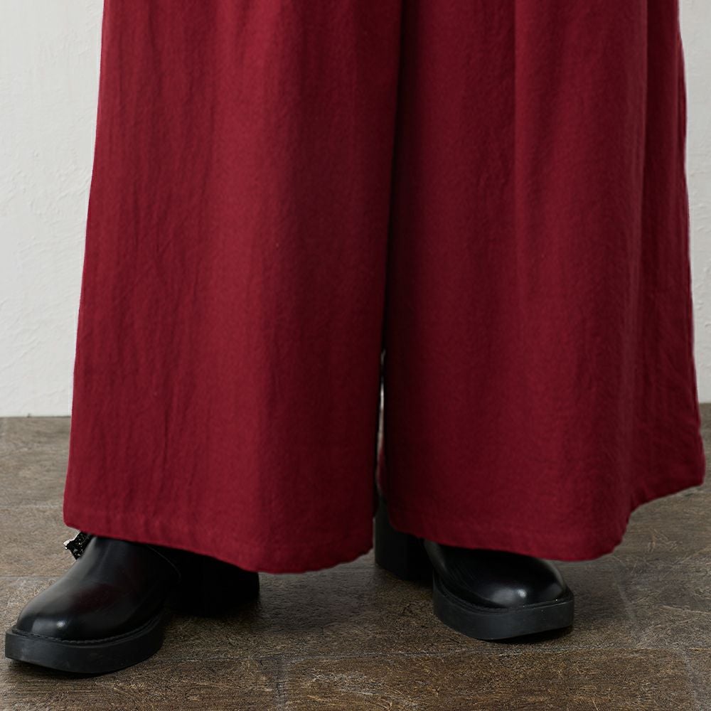 スカイツリーのお膝元、東京の染工場から独特の凹凸感が魅力の東炊き生地のワイドパンツ。 綿100%ならではの自然な通気性と、ほんのり起毛したやさしいタッチが心地よく、季節の変わり目にも快適に着られる素材感です。 天然繊維の優しい風合いで、ふんわりとした凹凸感が心地よい、一枚で映える逸品です。