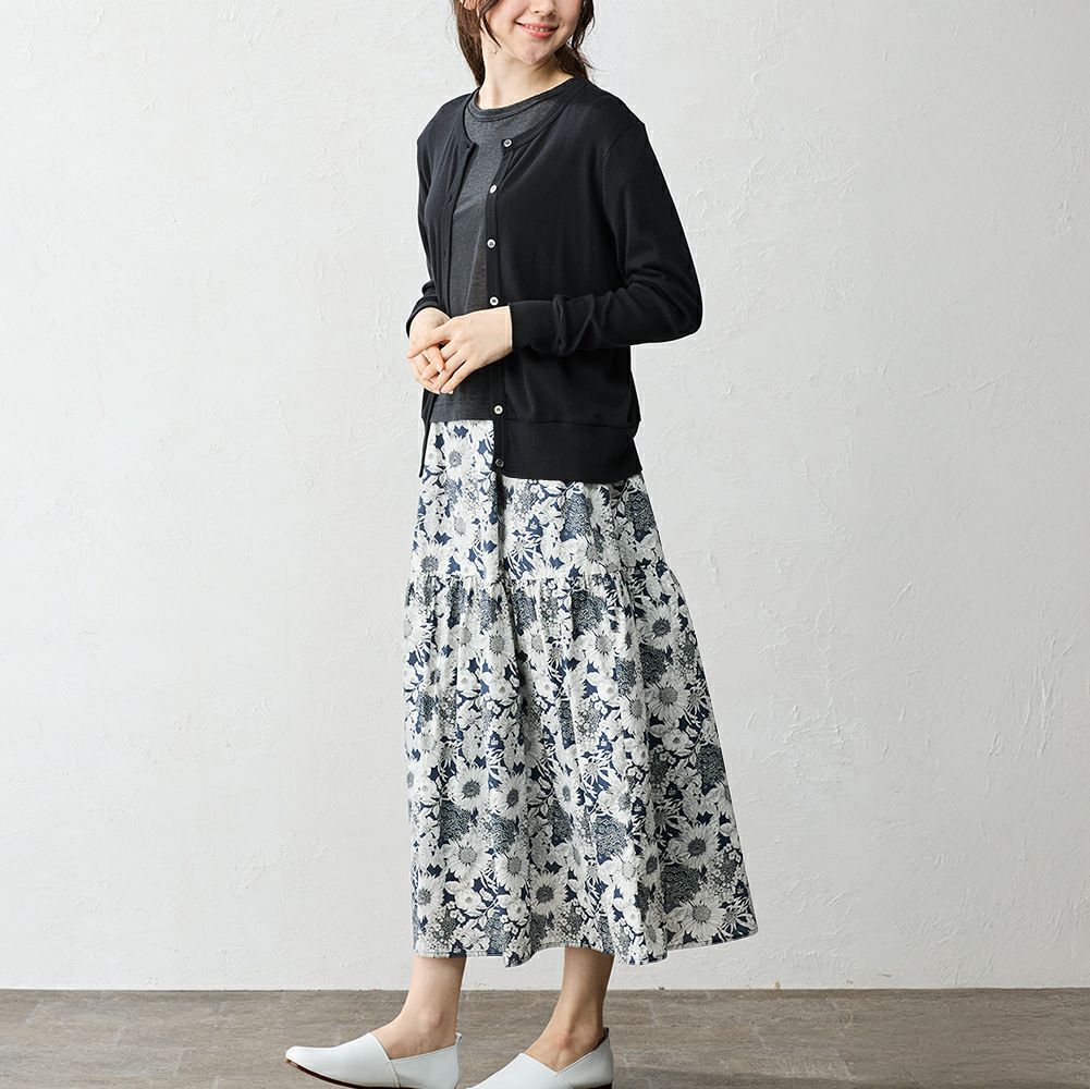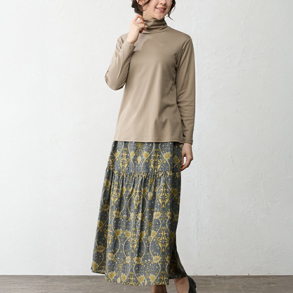 品よく華やぐ、リバティプリント生地を使用したロングスカート。 ふんわり広がるシルエットとギャザーで大人可愛いコーデに。 サラッとした裏地付きなのでペチコートなしでご着用いただけます。
