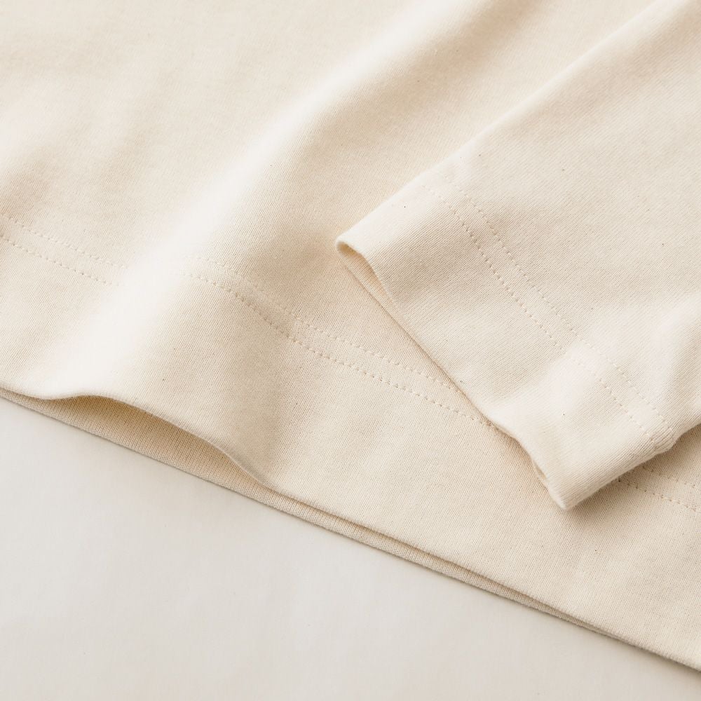 トルコ製の綿花を使用したオーガニックコットンフライス素材。程よい厚みの30番手の繊維は着用を繰り返しても型崩れが起きづらく、フライス編みなので伸縮性も抜群。