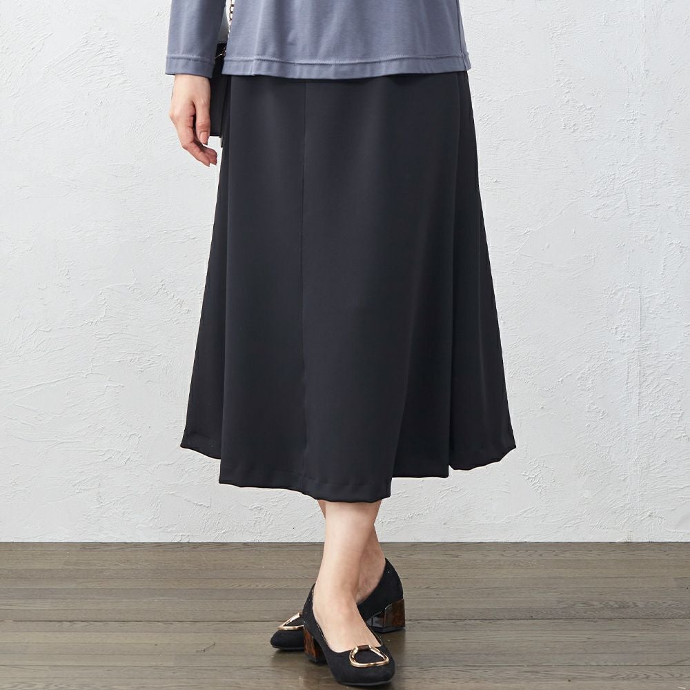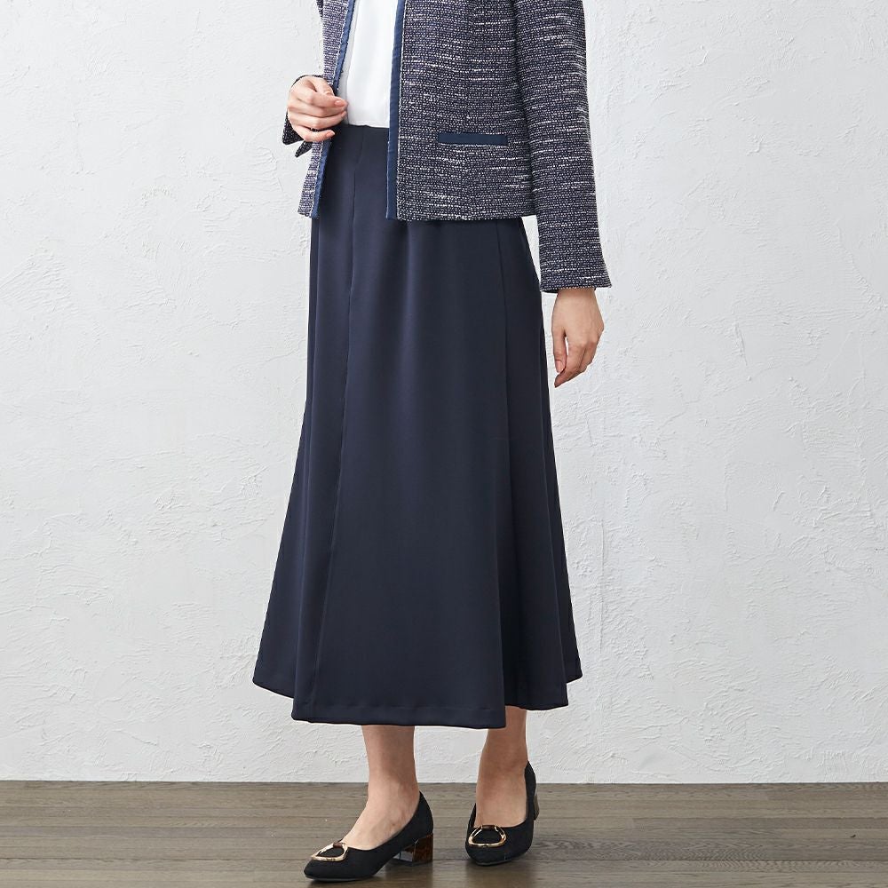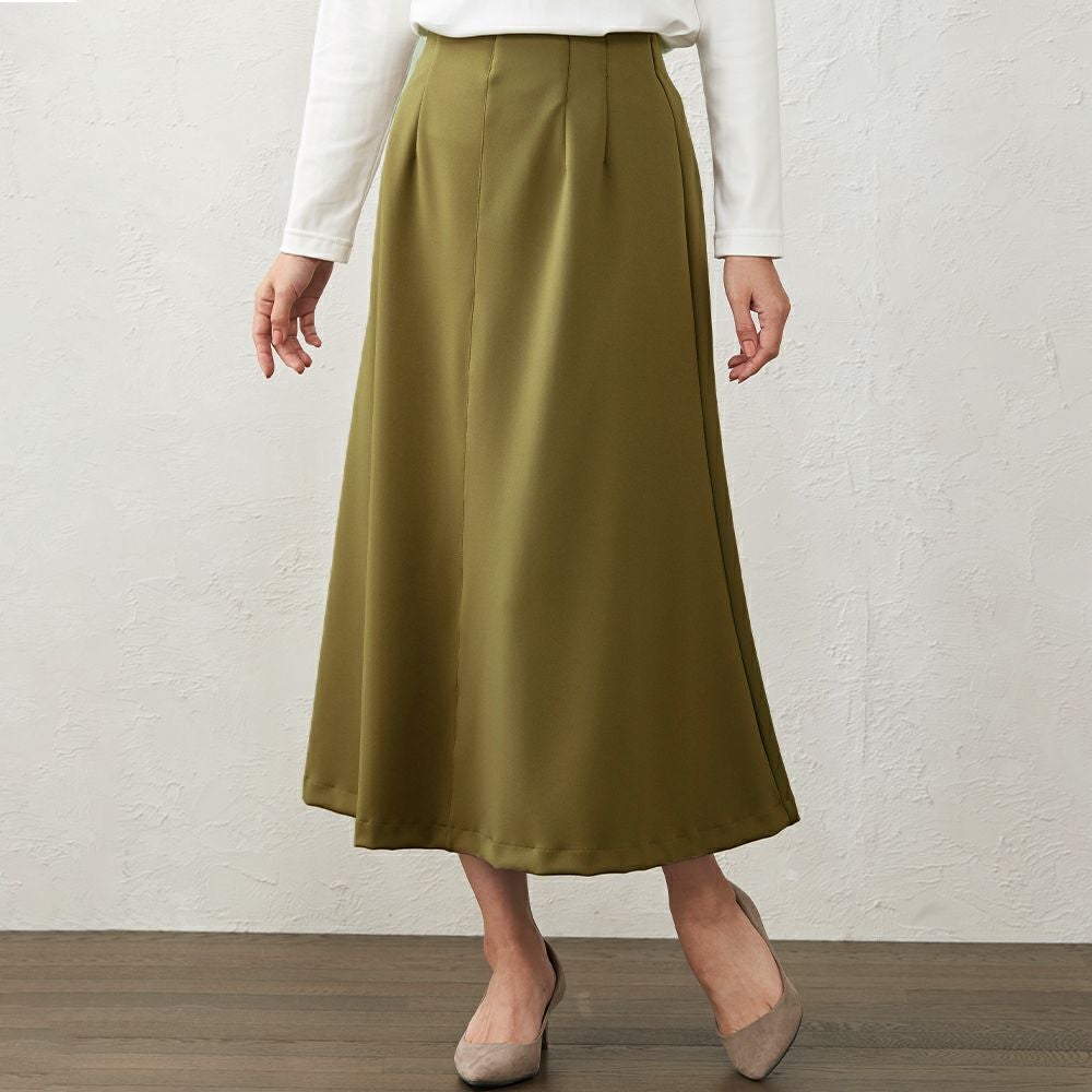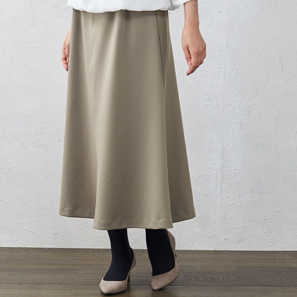 綺麗な落ち感で、上品な雰囲気のフレアスカート ウエストゴムで履きやすく、生地のストレッチも効くので動きやすいスカートです。 上品な光沢がある素材なので、カジュアルはもちろんキレイめやフォーマルなど幅広く着まわしていただけます。