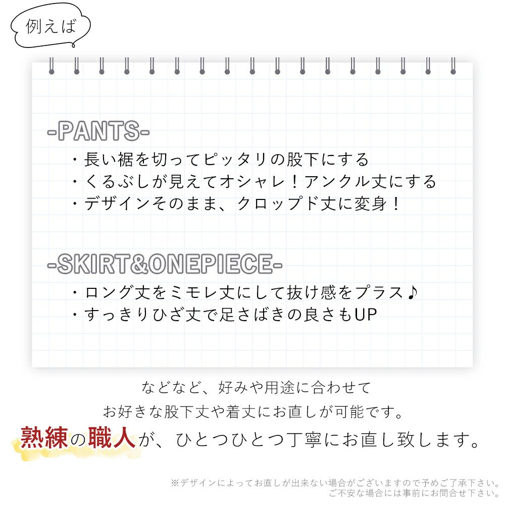 スリット入りのアイテム等一部裾上げの対応が出来ないお洋服が御座います。 また元々の寸法より長くする事も出来ません。 ご不明点やご不安な点等御座いましたらお気軽にお問合せ下さい。 |