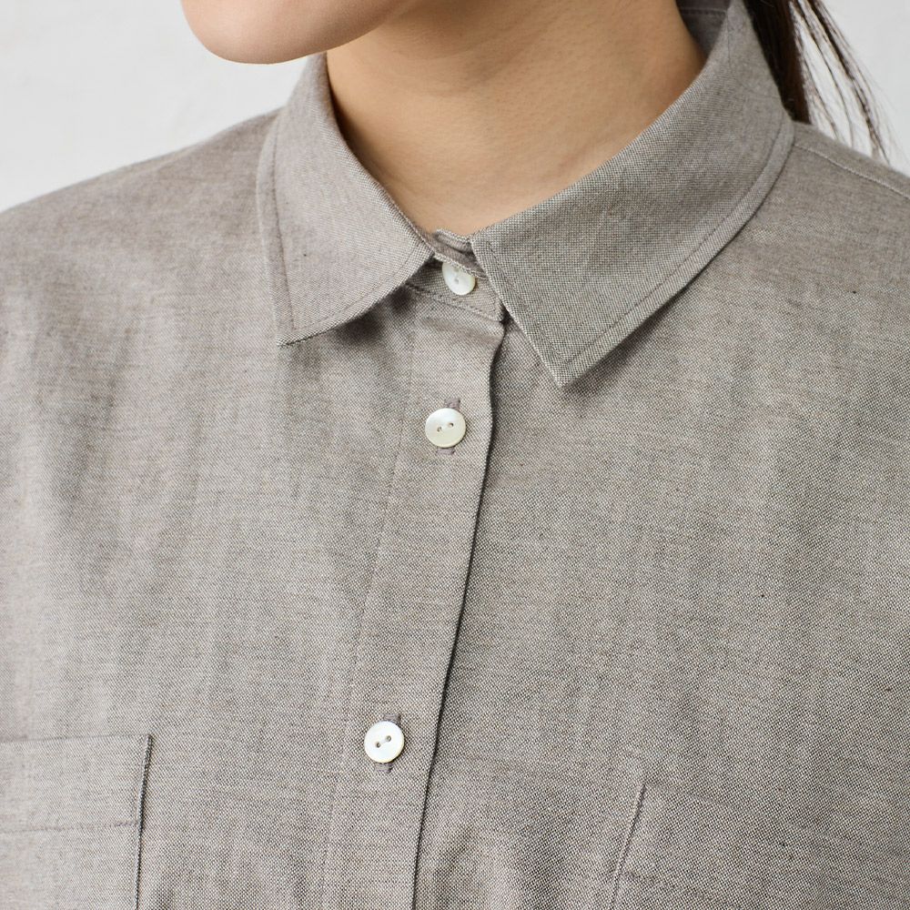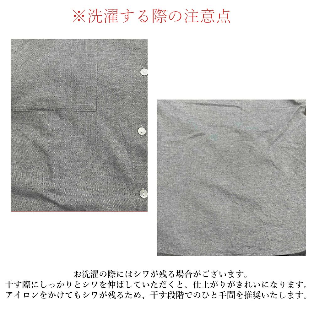 オックスシャンブレーとは、「オックスフォード」織りとシャンブレーの特徴を併せ持った生地。 無地でも奥行きがあるので、シンプルなデザインでも存在感が。 平織りベースで織り目がしっかりしているため、風通しがよく涼しい。 オックスフォードの肉厚感とハリがあるため、型崩れしにくい。 それでいて、シャンブレーの柔らかい質感があり肌なじみが良い。
