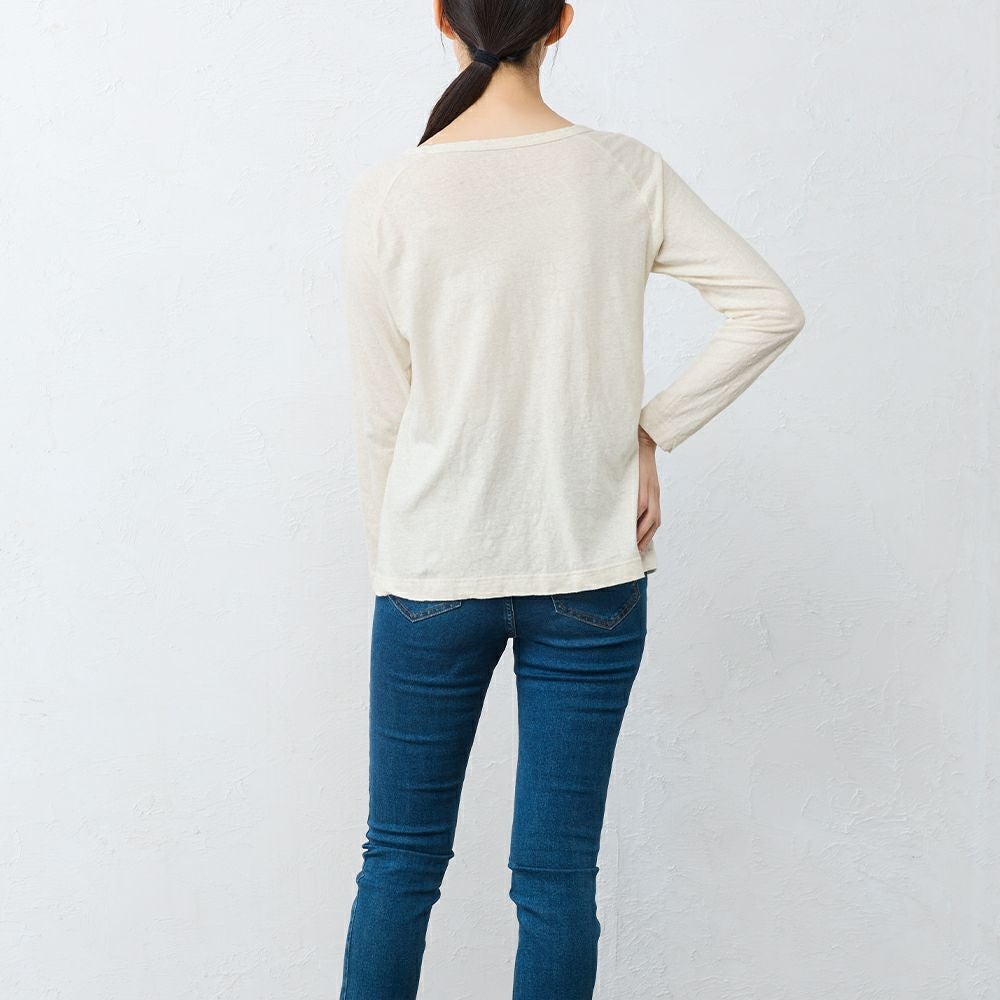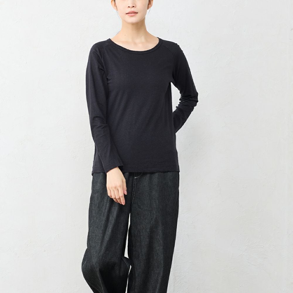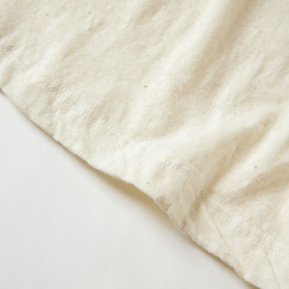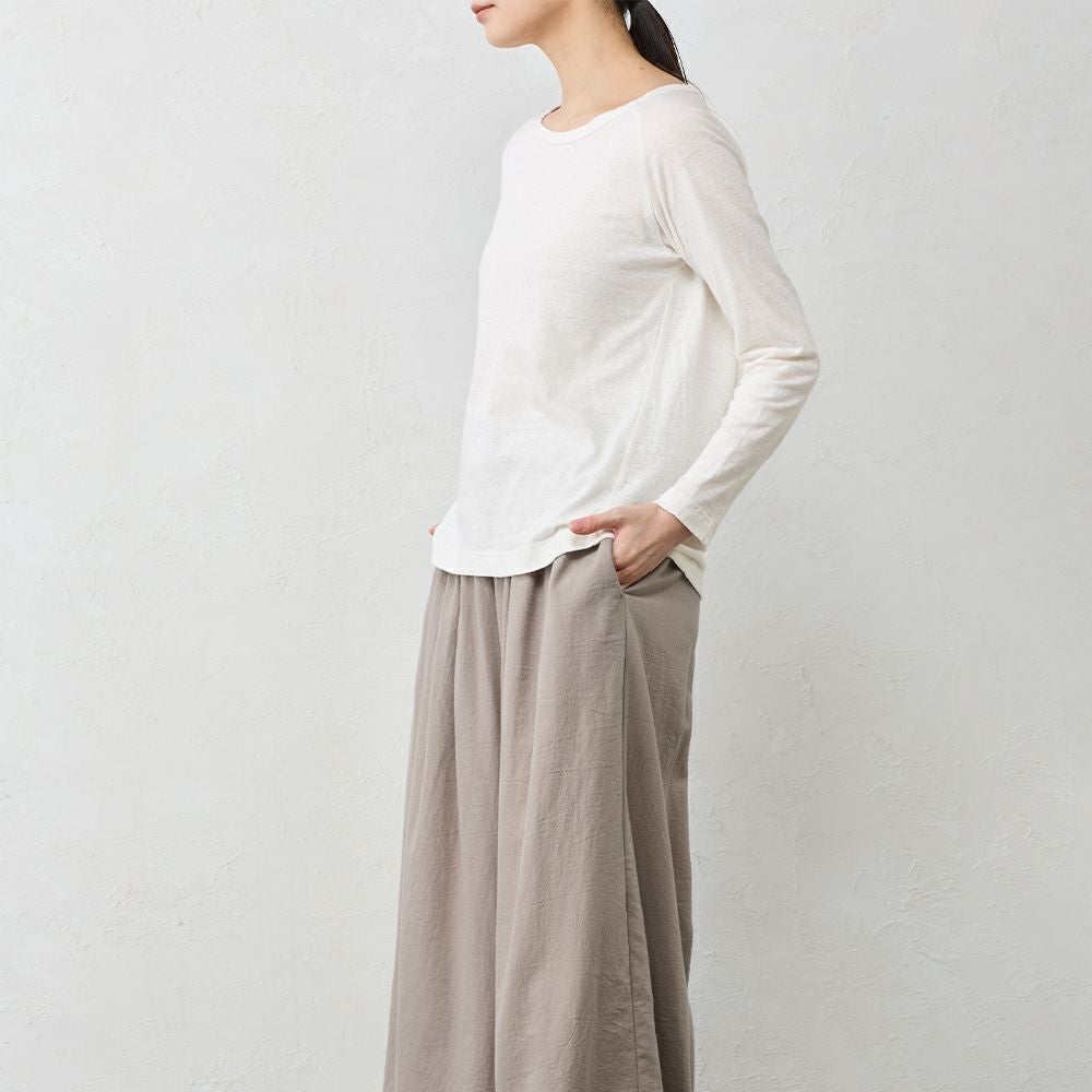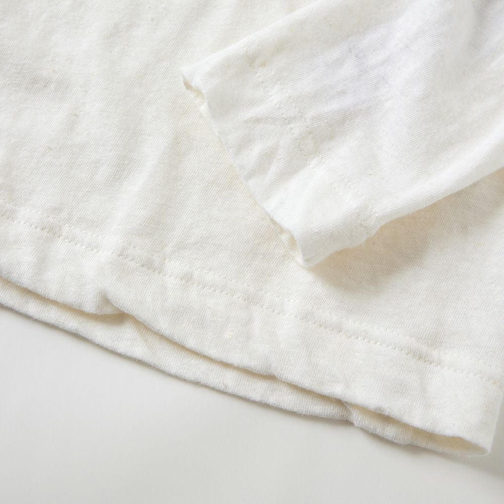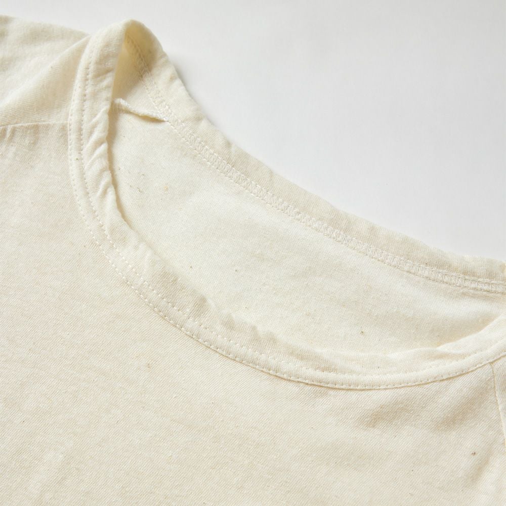 麻の良さと綿の良さを組み合わせたSPANオリジナル素材。ナチュラル感のある雰囲気で、一枚で着ても雰囲気の出るアイテム。素材は単糸と言う1本の繊維で編み上げる生地で、使い込むうちにナチュラルなねじれ感に。 春夏は風を通し快適に。秋冬は保温性の高さを活かしてインナーとしても。年中使える万能アイテムです。