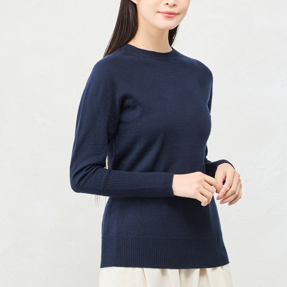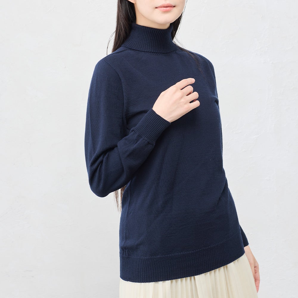 ウールの優れた吸放湿性によりムレにくく、秋から春先まで長くご着用いただける定番ニットです。