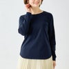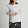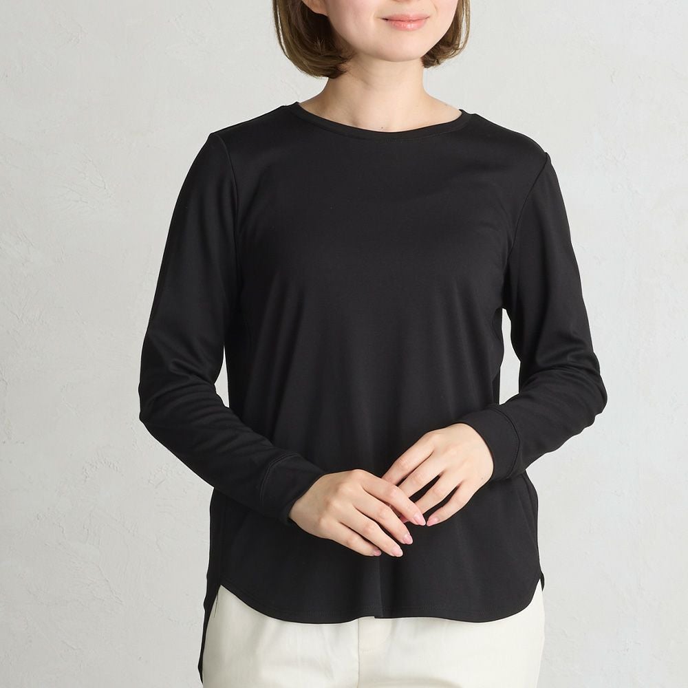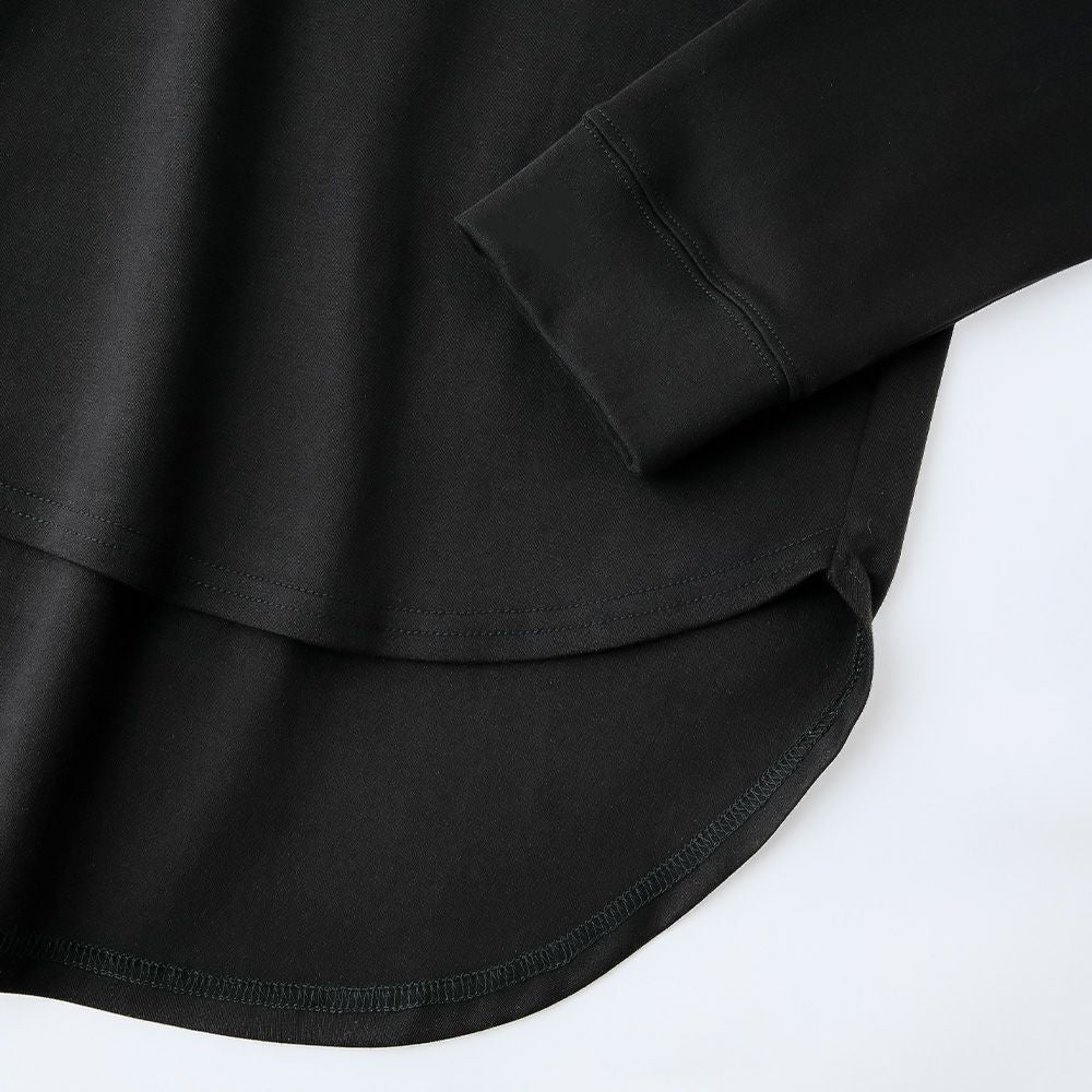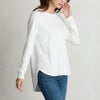 前はシンプルなクルーネックデザイン。裾が前後で差があるラウンドヘムで遊び心とデザイン性を。