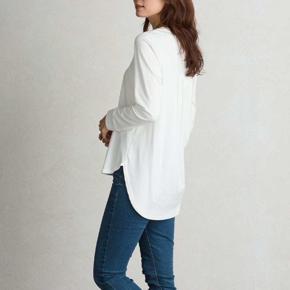 後ろはヨークの切り替え下よりギャザーが入り、スビンコットンが魅せる上品な光沢とドレープ感でとても品のある後ろ姿に。