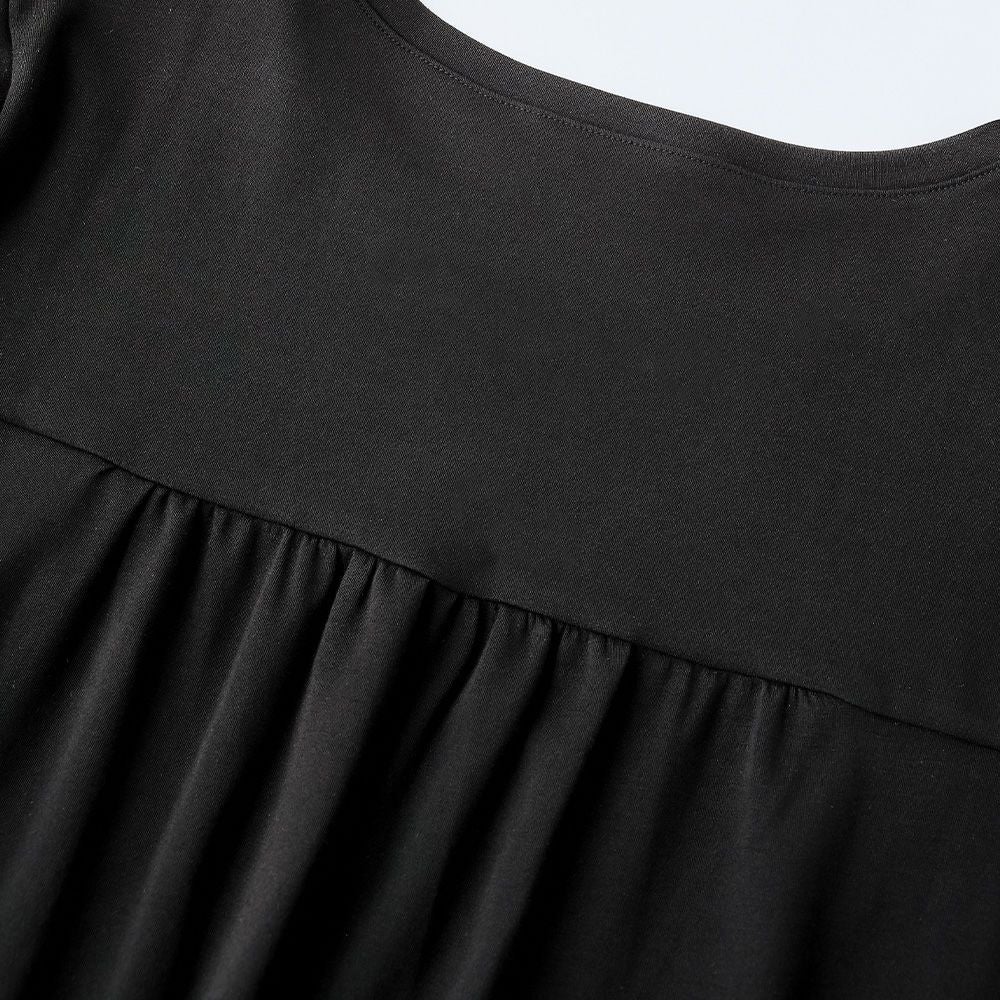 後ろのギャザーや前後差のあるラウンドヘムでシンプルながらオシャレな1着。