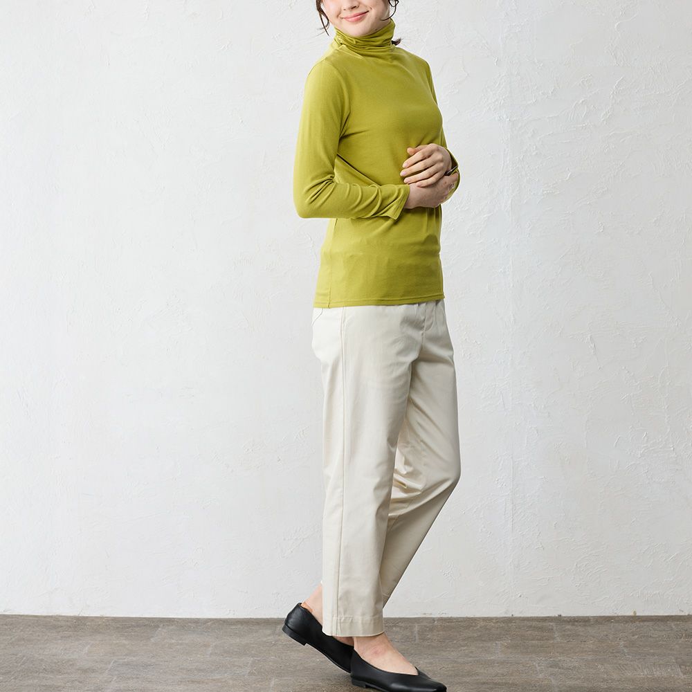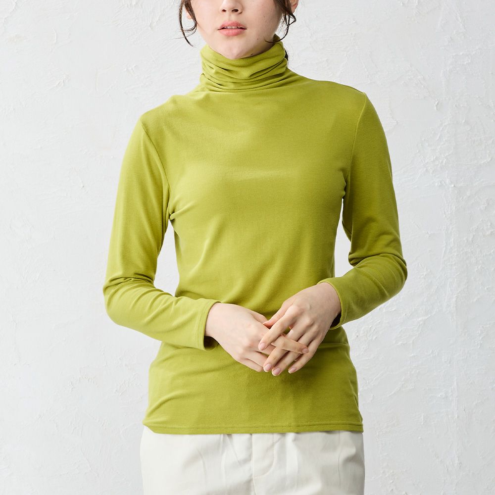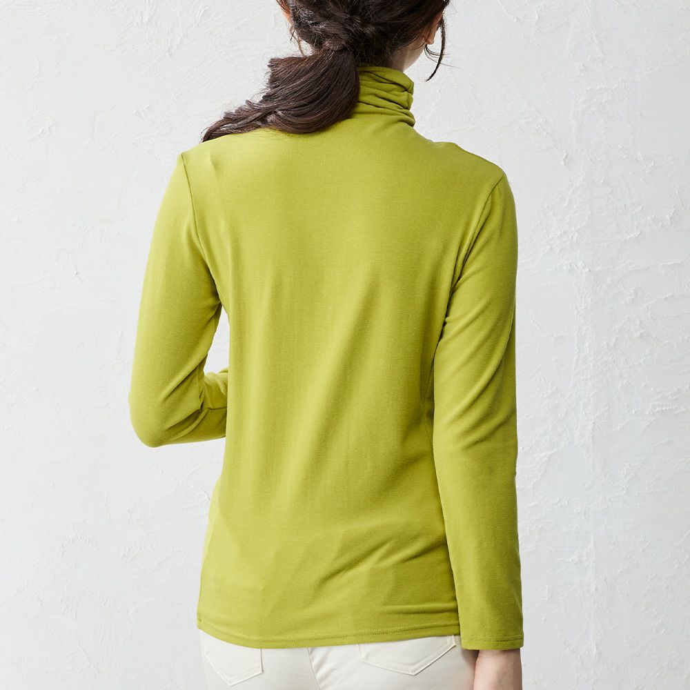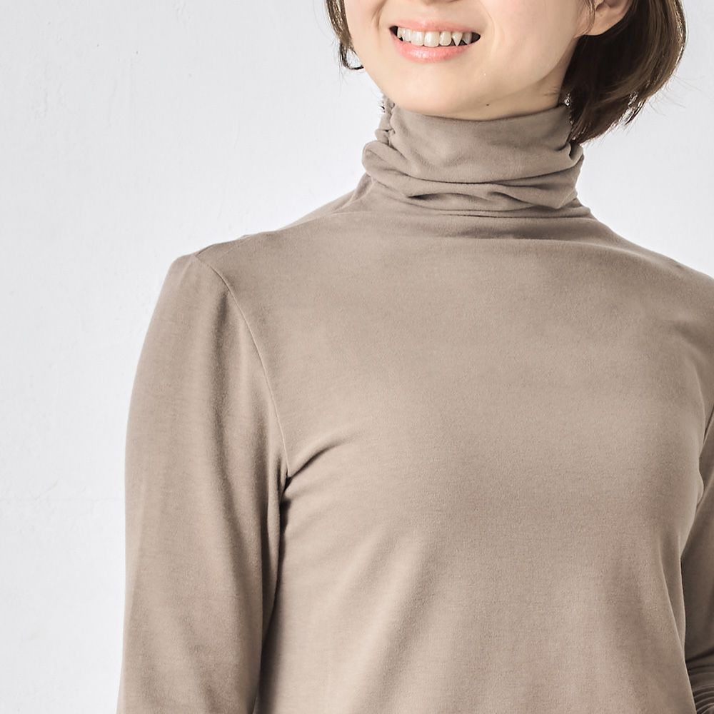 吸湿発熱性と保温性で薄手でもしっかり暖かく、首元を上品に包むタートルネックカットソー