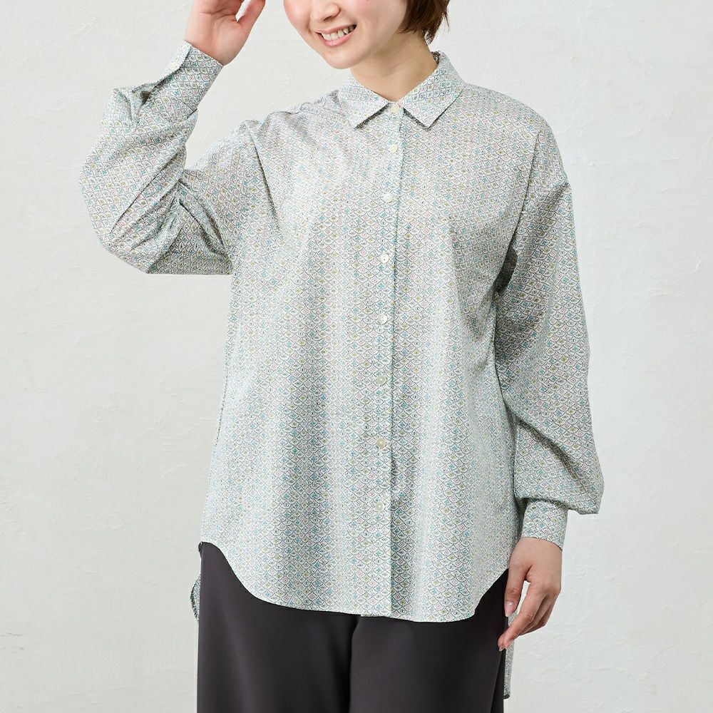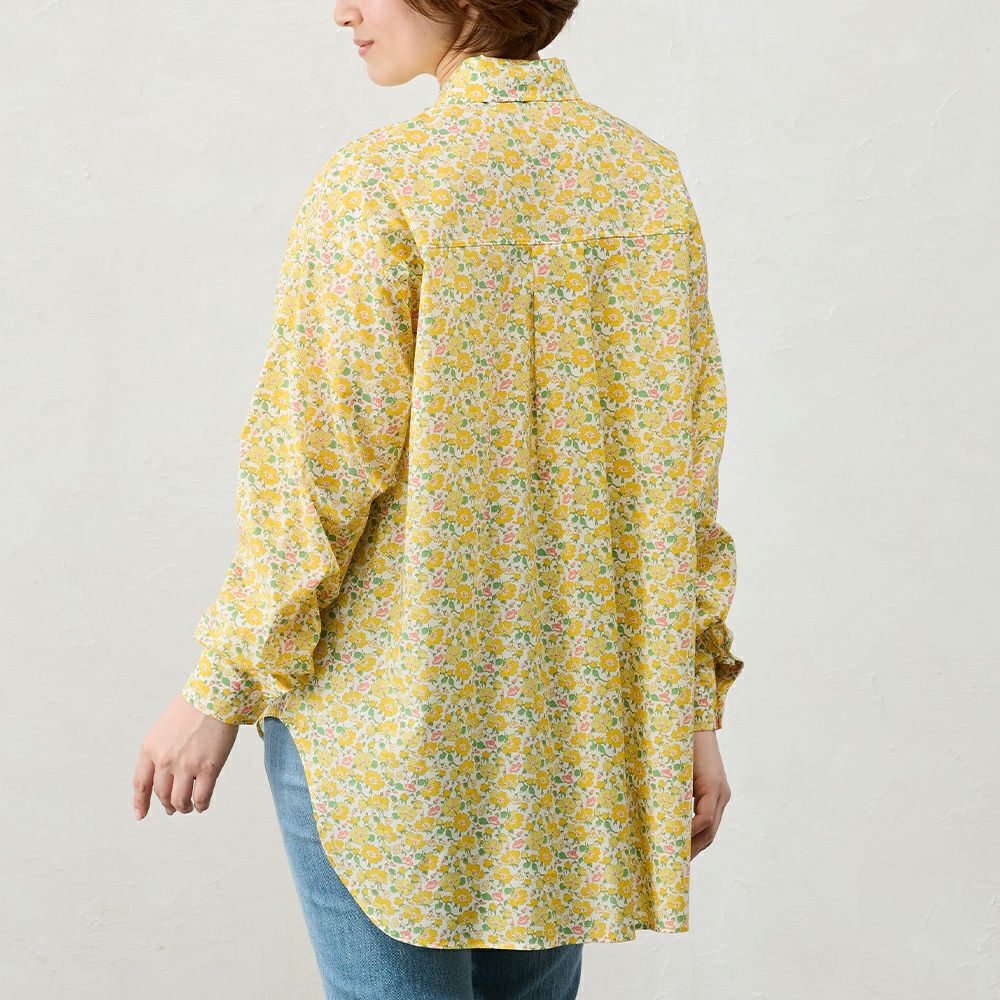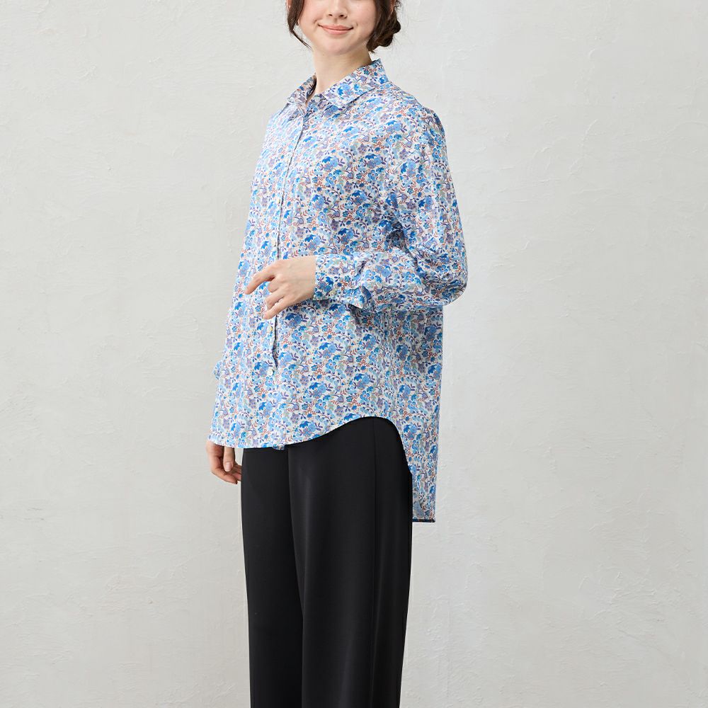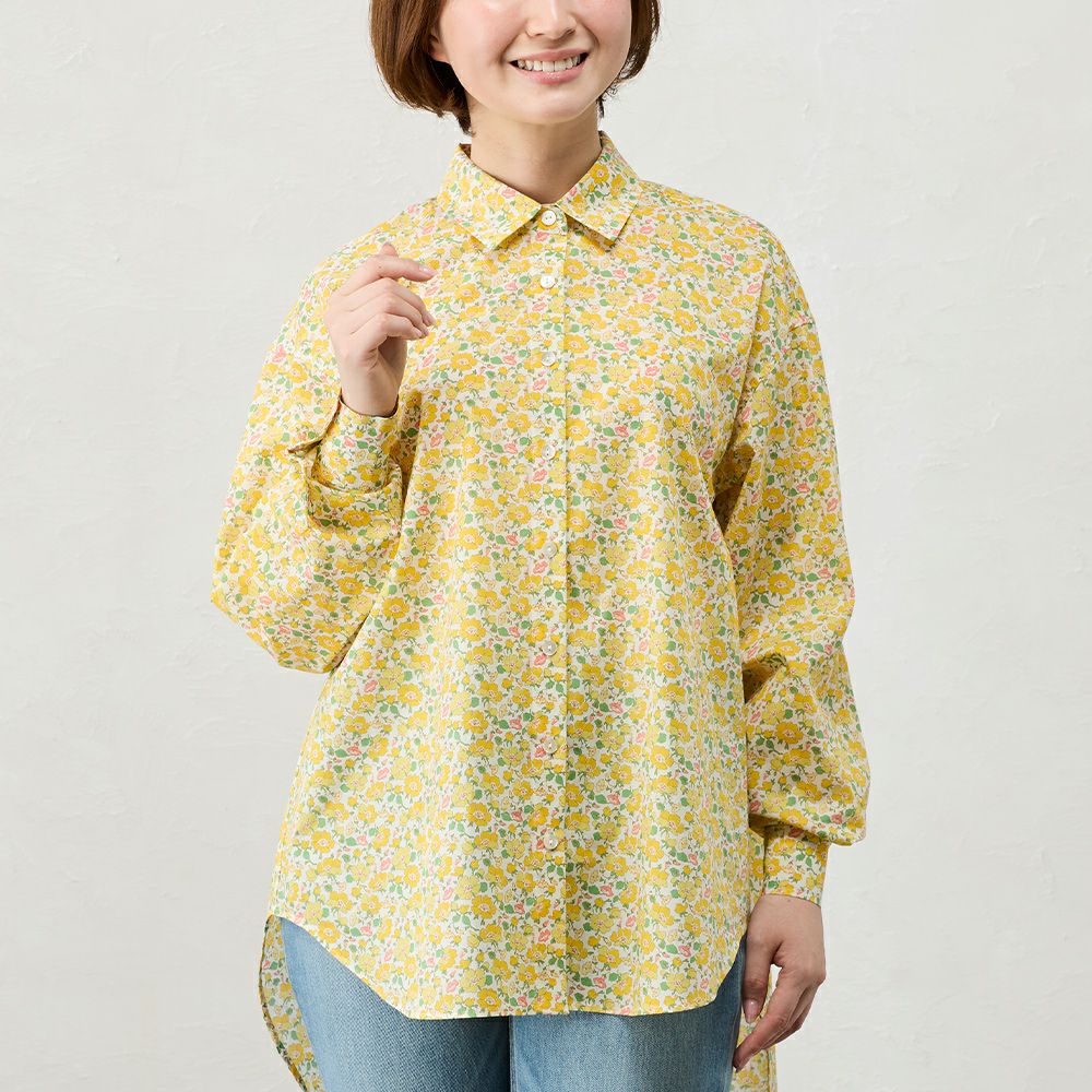 品よく華やぐ、リバティプリント生地を使用したシャツ。 コーディネートを華やかに彩る主役級の1着。 デニムなどのカジュアルコーデ~ジャケットと合わせてキレイめにも着られる、程よい甘さをプラスできるアイテム。