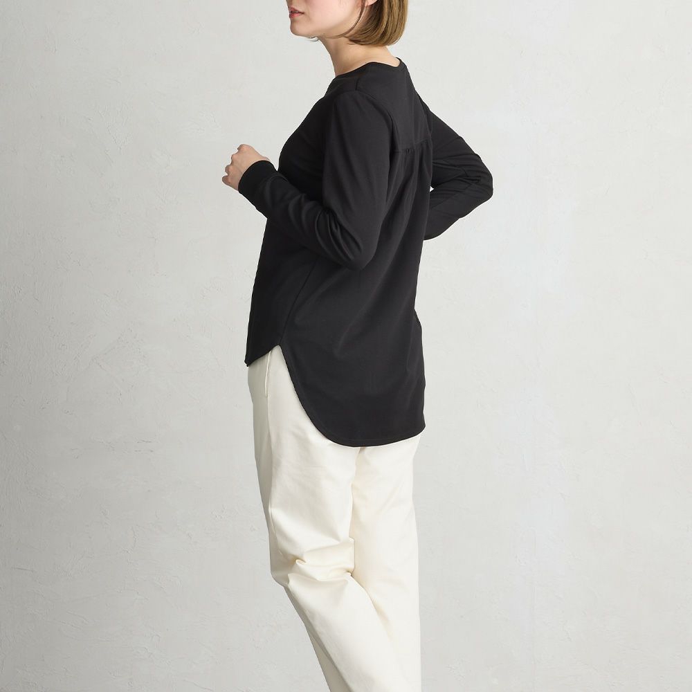 前はシンプルなクルーネックデザイン。裾が前後で差があるラウンドヘムで遊び心とデザイン性を。