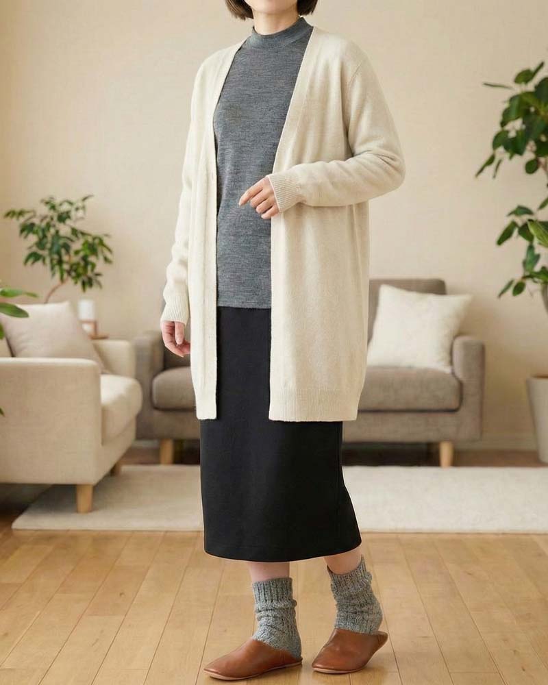 室内メインの日におすすめ。スカートで女性らしさを残しつつ、ハイネックで冷えを防止。カーディガンは温度調整に便利。