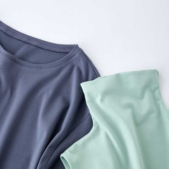 上品な光沢に程よい厚みのUSスーピマを使用。一枚でもインナーとしてもご利用いただける極上の肌心地のアイテムです。