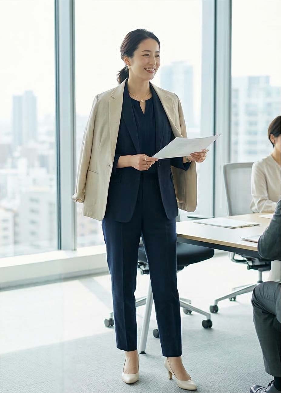 春の商談は、重くなりすぎない「きちんと感」が正解。ネイビーは信頼感がありつつ、春の光にも映える万能カラーです。