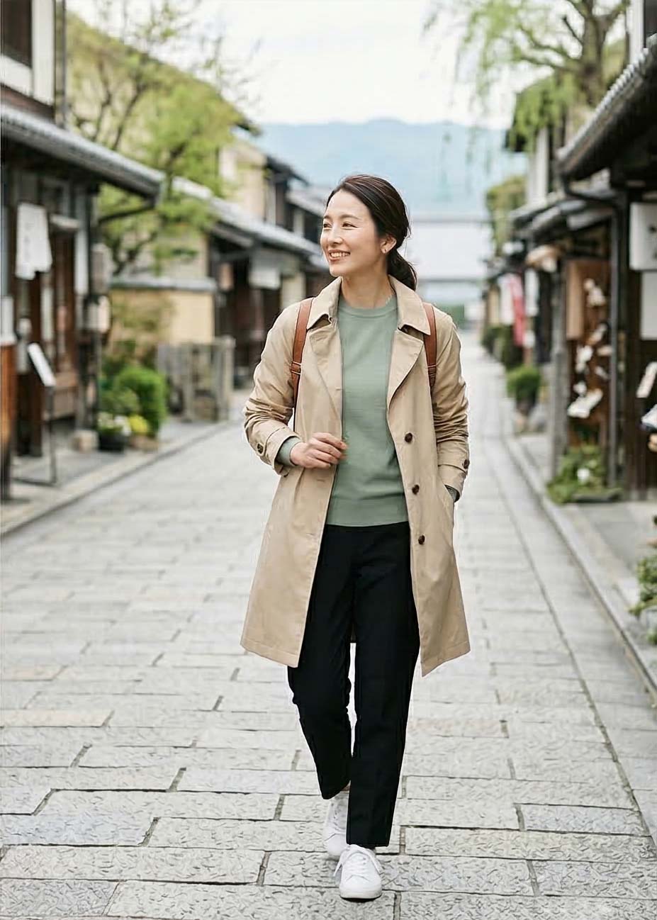 帰りは少しリラックスした雰囲気で。ベージュの軽アウターは春らしく、旅先の写真にも自然に馴染みます。