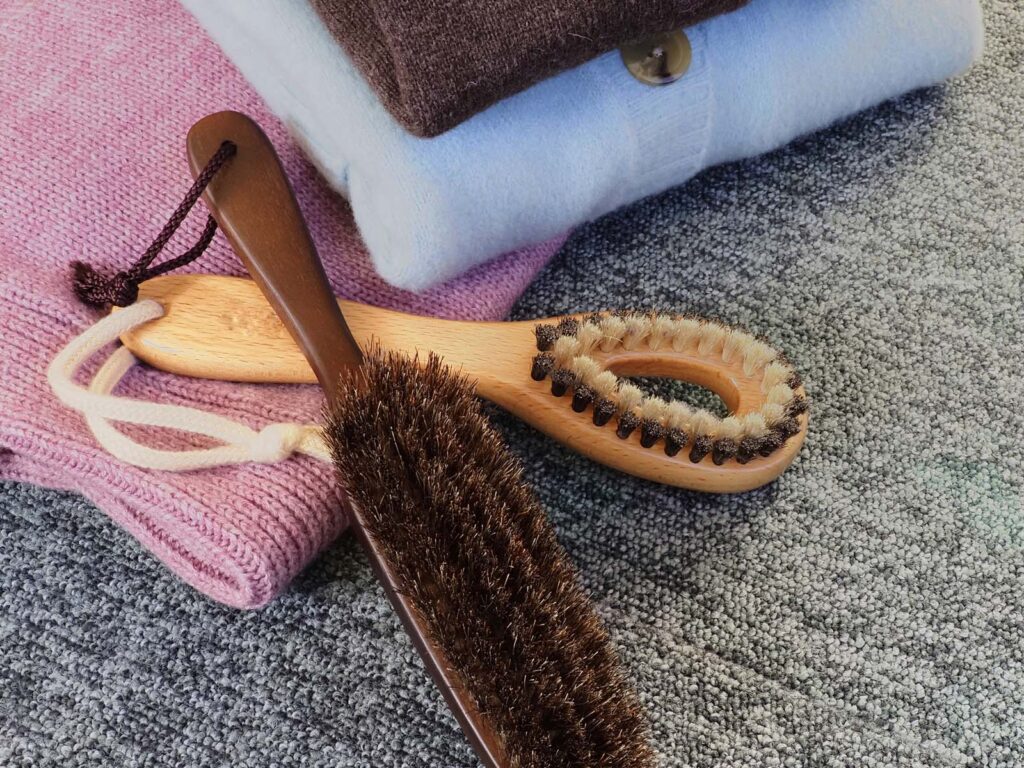 着用後は必ずブラッシング。冬は静電気が起きやすいので、霧吹きで軽く湿らせてから陰干しで湿気を飛ばす。ハンガーは肩幅に合った木製タイプを選びましょう。