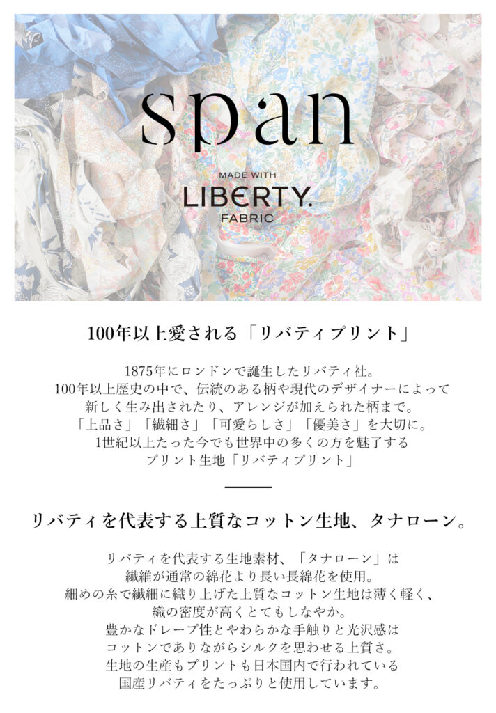 上品で繊細なプリント柄のリバティプリントのタナローンを使用。たっぷりギャザーのティアードデザインは大人の上品さと可愛さを併せ持つアイテム。華やかなプリント柄で気分も上がるアイテムです。